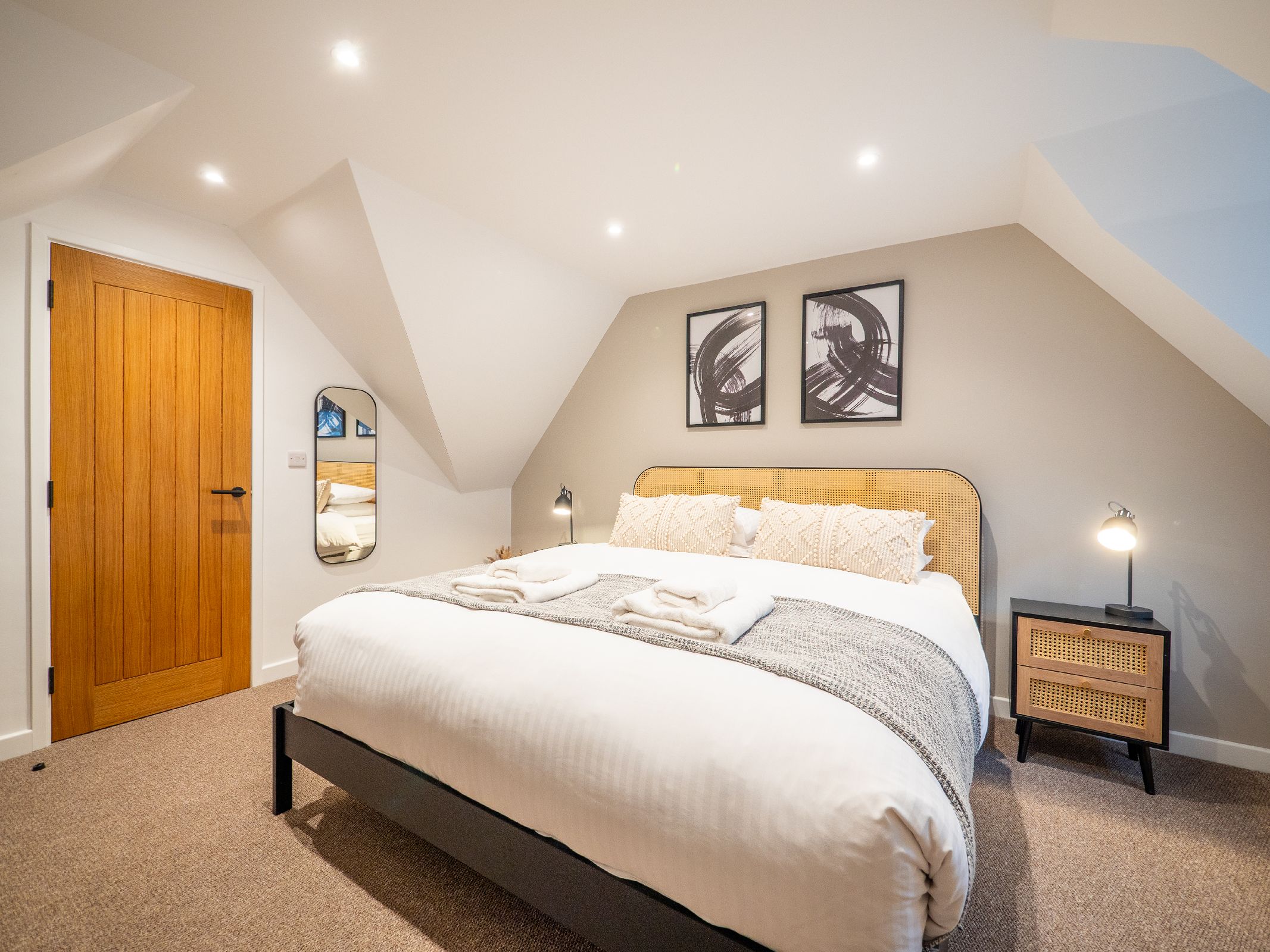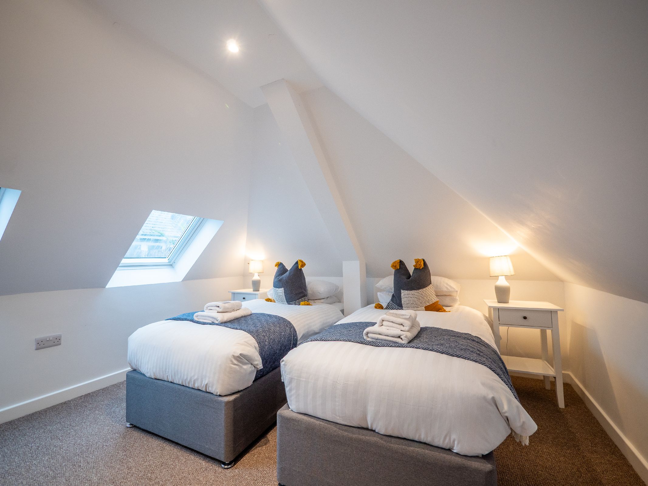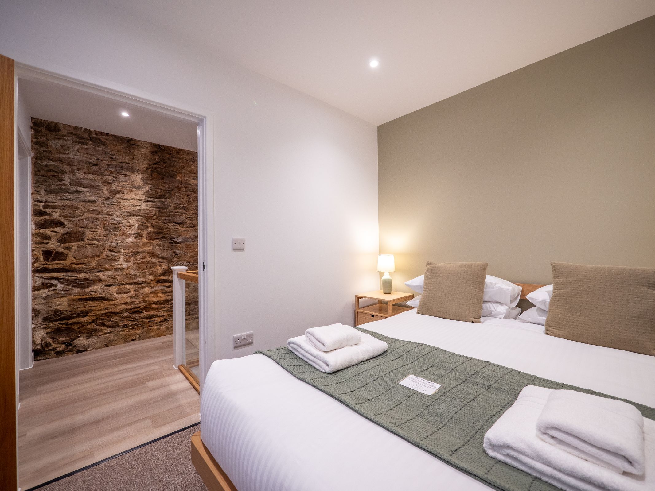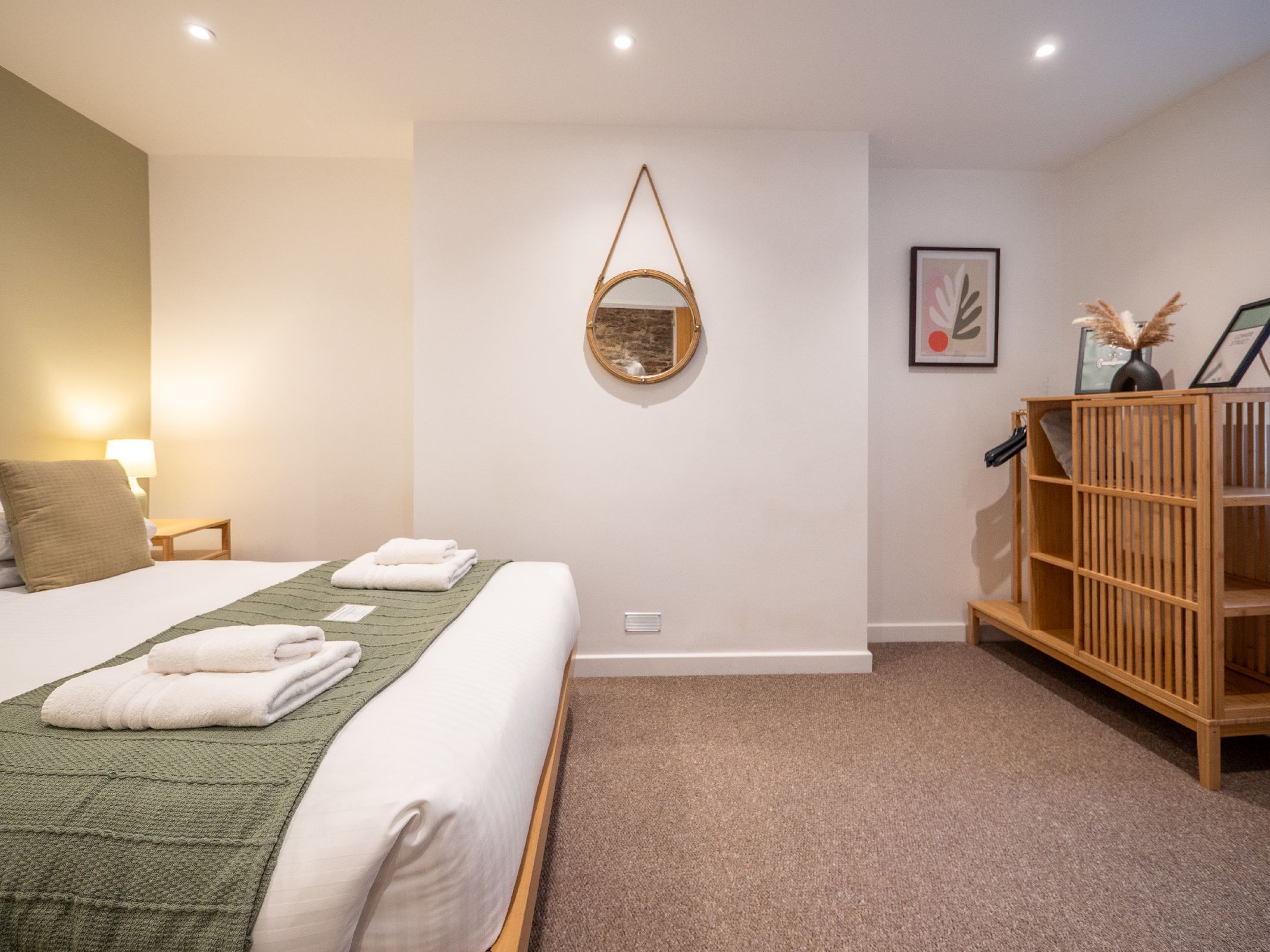 This Dartmouth holiday apartment comfortably sleeps up to six guests across three bedrooms. The first floor hosts a king-size bedroom and a modern family bathroom with a walk-in shower. Upstairs, discover two additional light-filled bedrooms, one double and one twin, plus a second contemporary shower room, making it perfect for families or small groups.