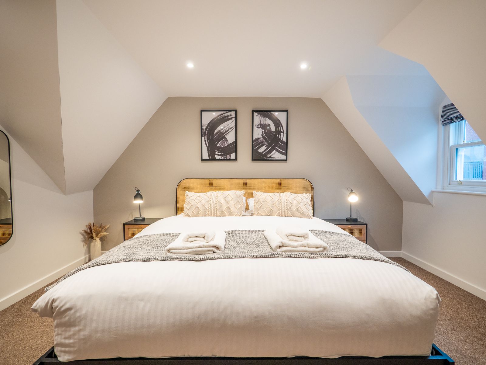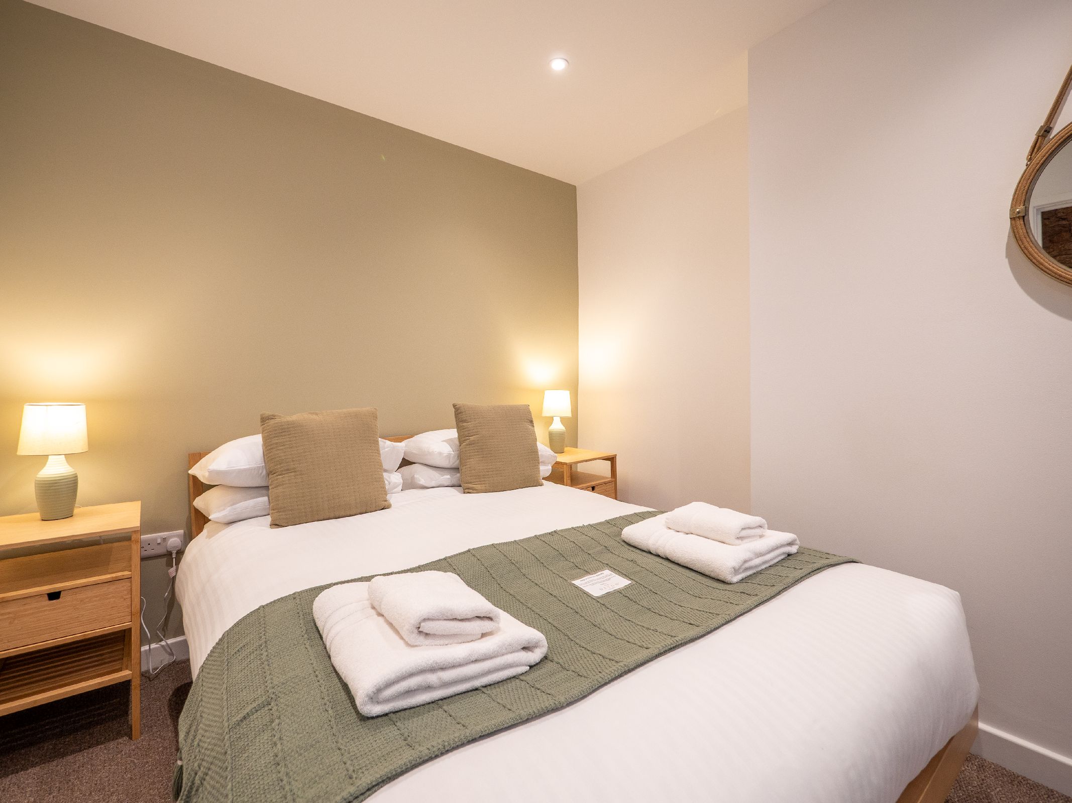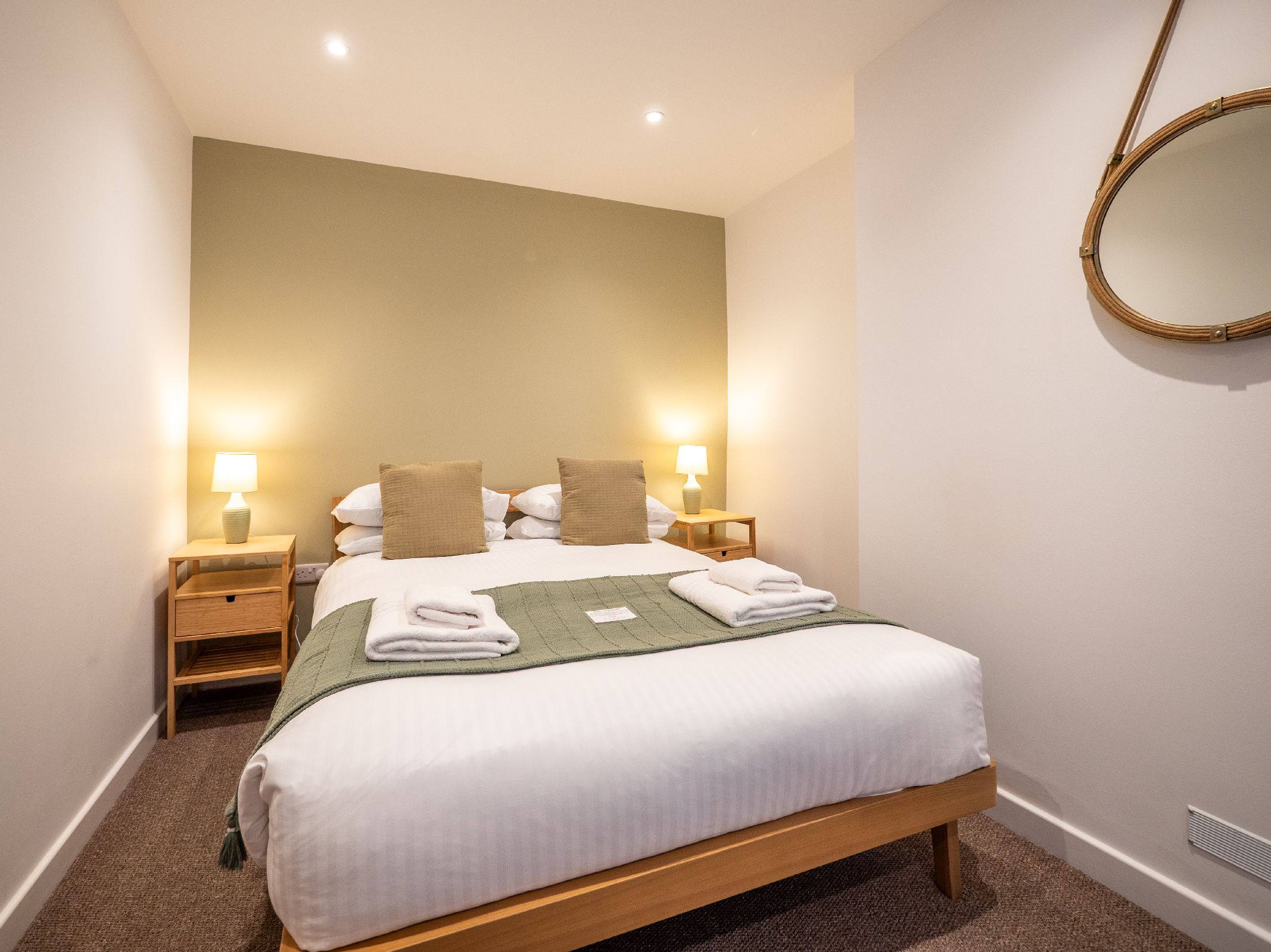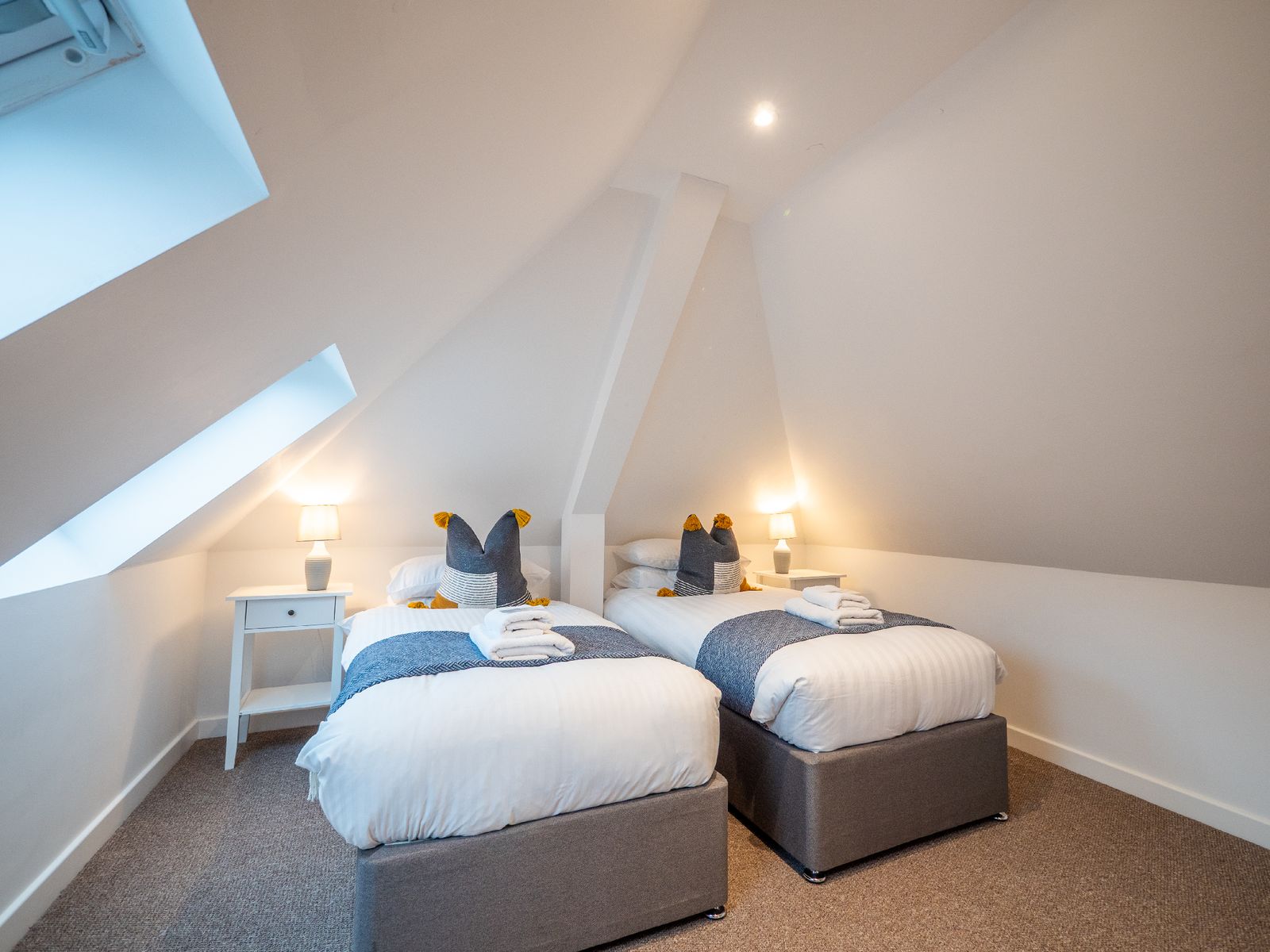 This Dartmouth holiday apartment comfortably sleeps up to six guests across three bedrooms. The first floor hosts a king-size bedroom and a modern family bathroom with a walk-in shower. Upstairs, discover two additional light-filled bedrooms, one double and one twin, plus a second contemporary shower room, making it perfect for families or small groups.