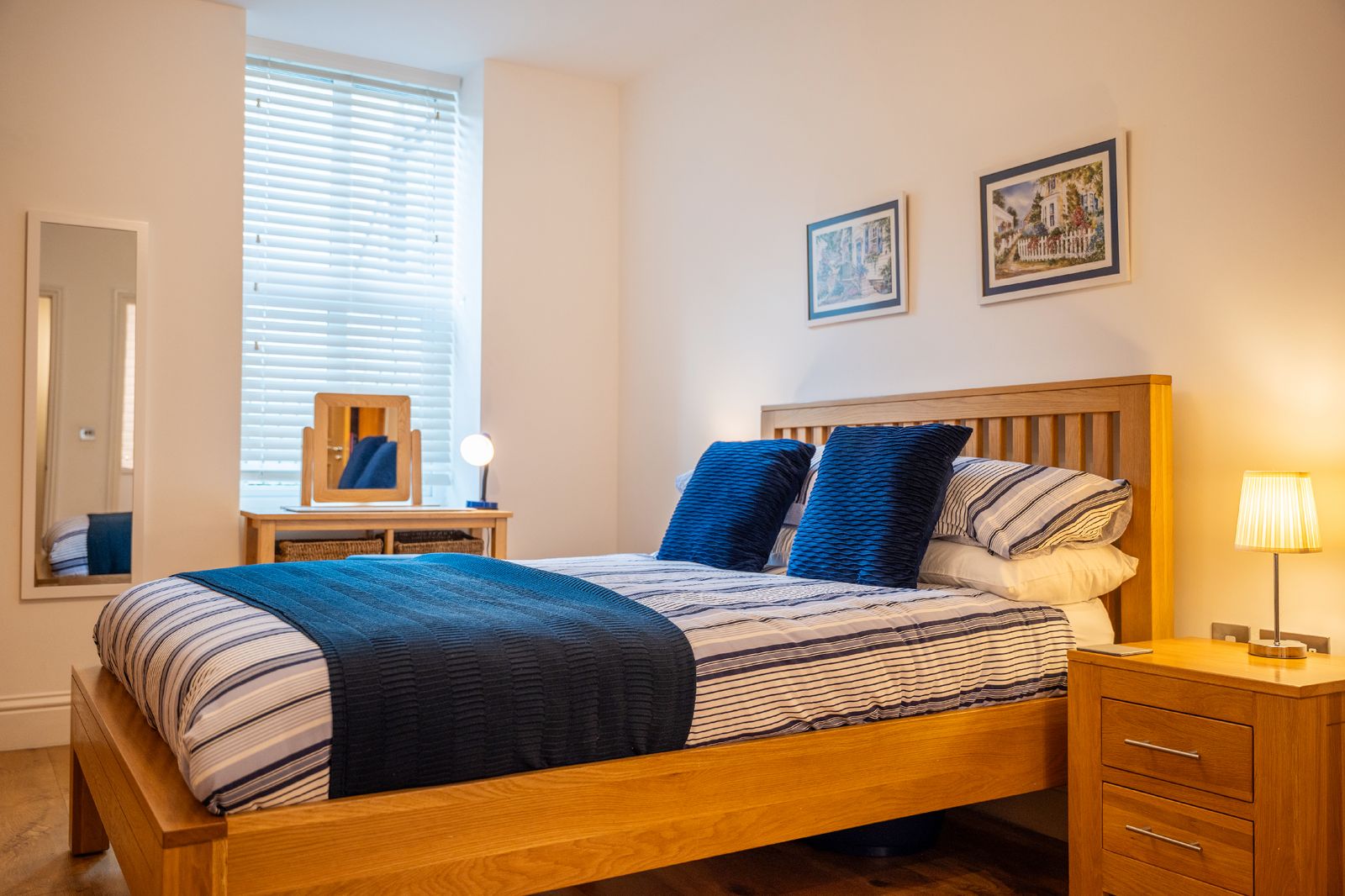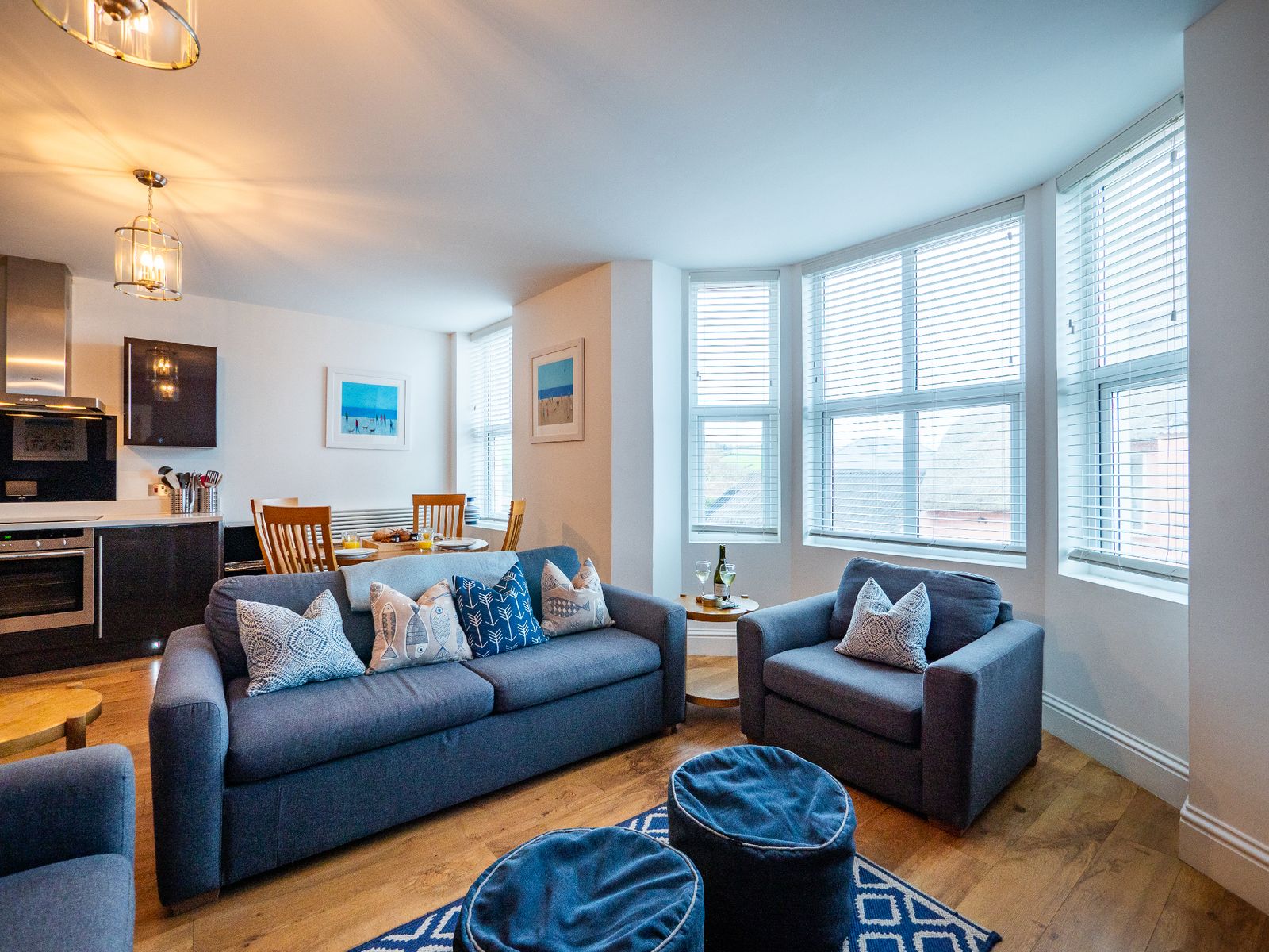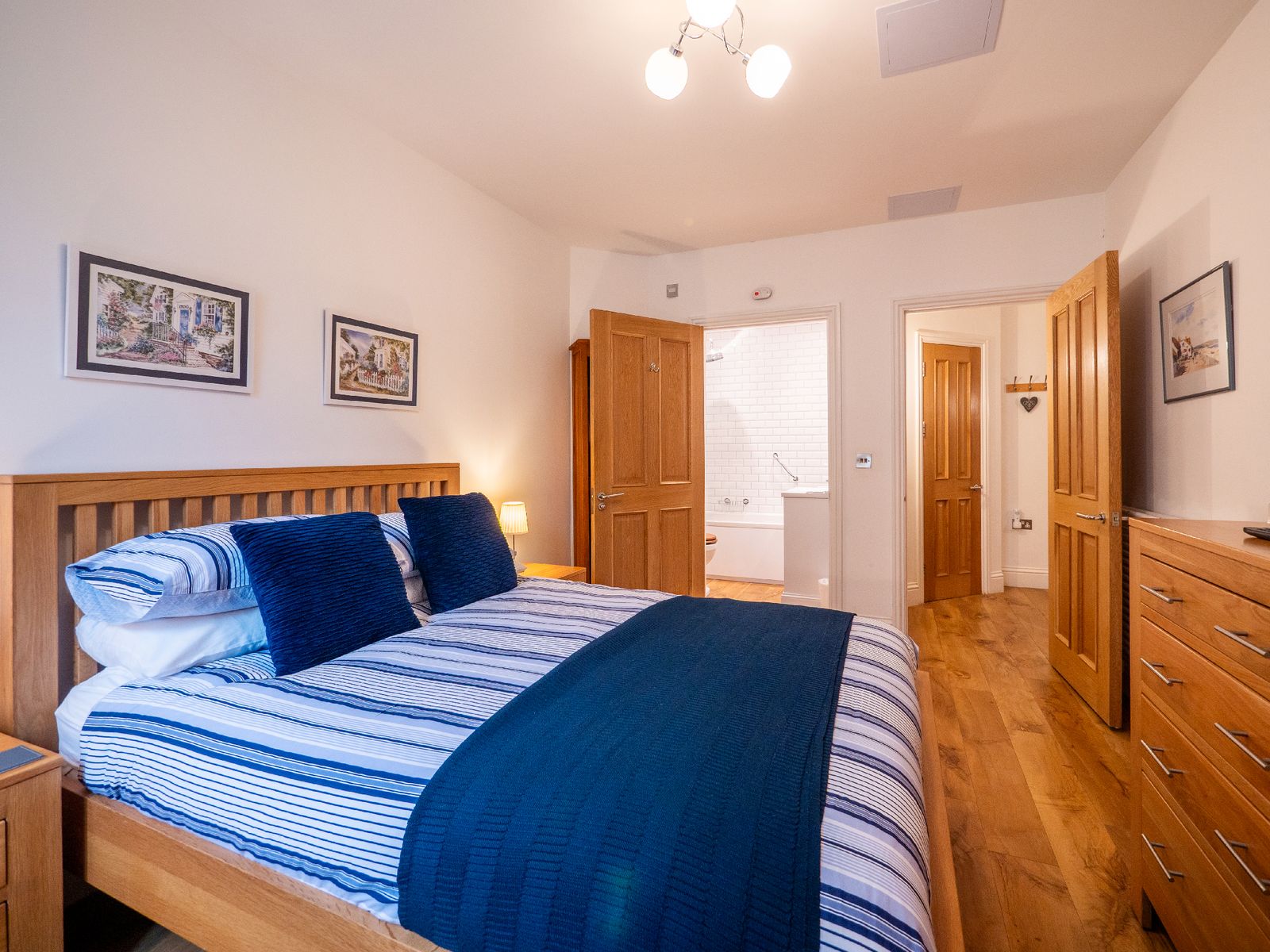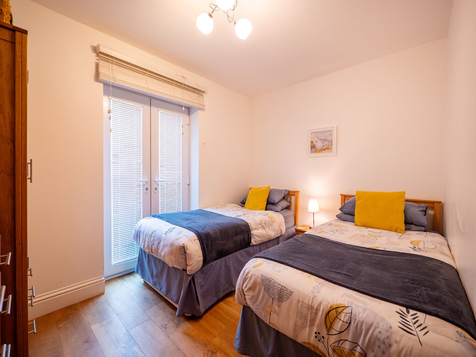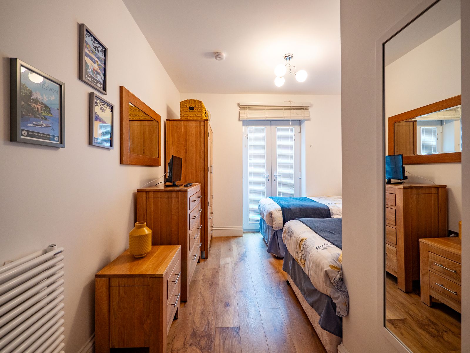 The master bedroom is a calm and inviting retreat, complete with double bed, TV, ample storage and a stylish en-suite bathroom featuring bath with shower over, heated towel rail and quality fittings. The second bedroom offers twin beds, TV and a Juliet balcony, perfect for letting in the sea air. A separate family shower room provides additional convenience.