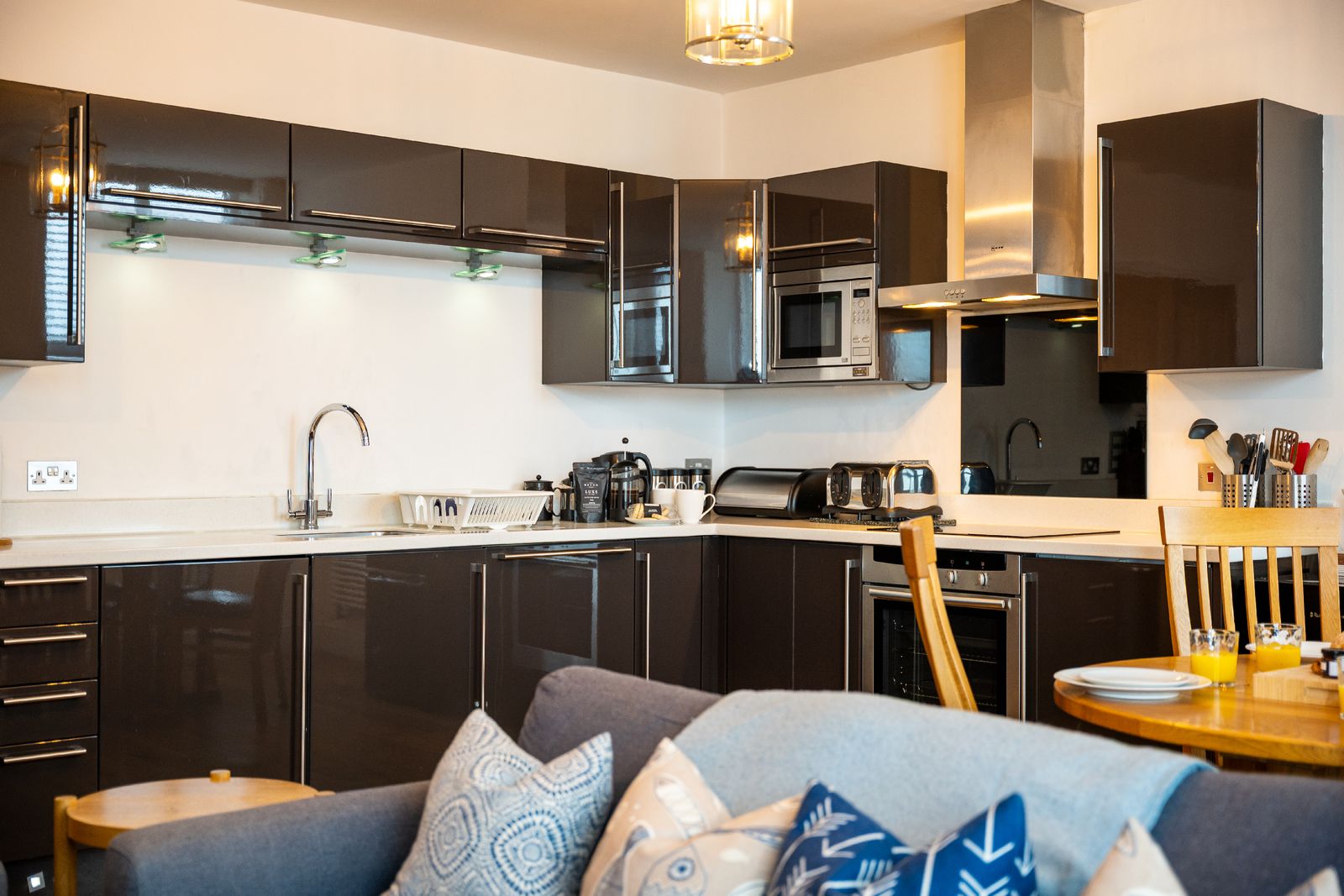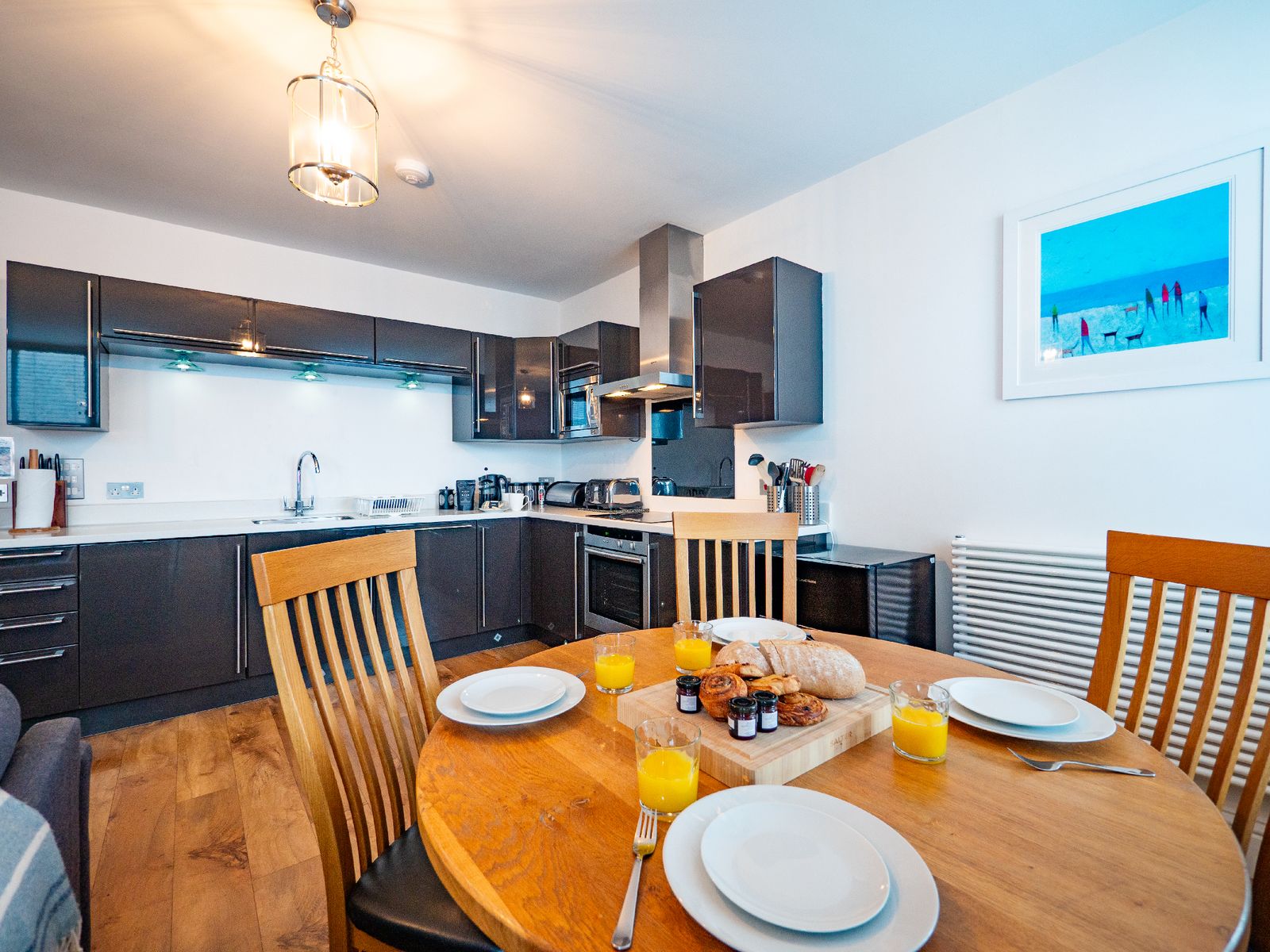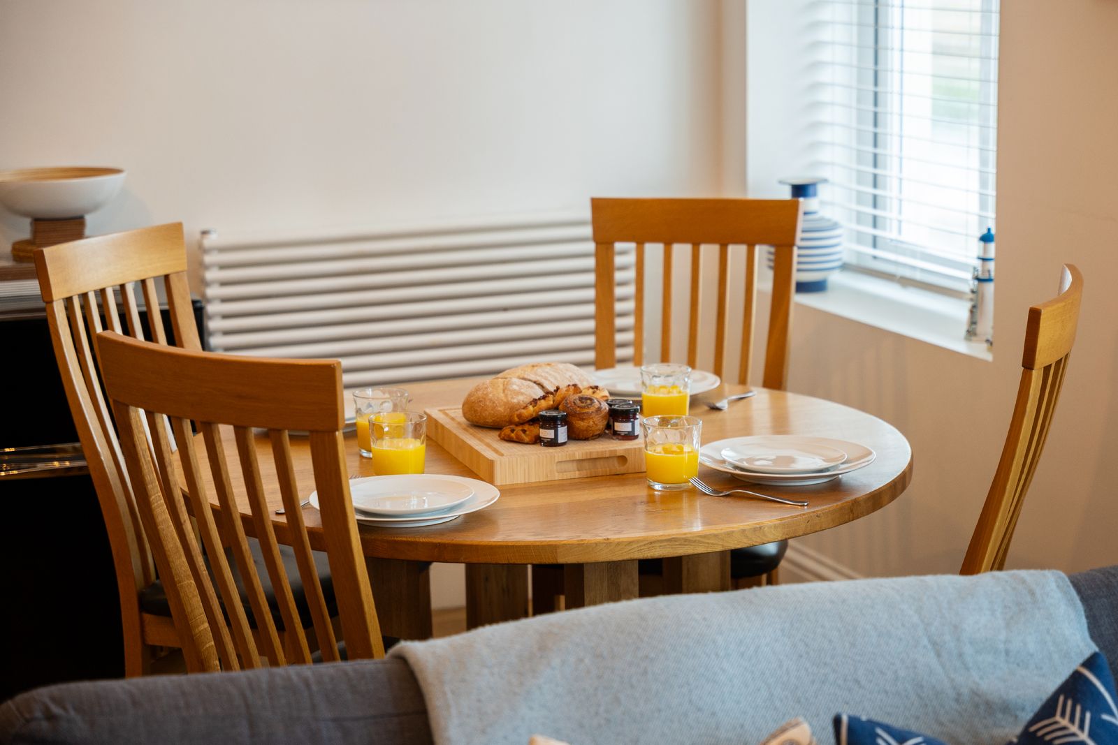 The open-plan layout makes it easy to spend time together. The well-equipped kitchen includes an electric oven and hob, dishwasher, combined washer/dryer, microwave, cafetière and two under-counter fridges with freezer compartments, everything you need for relaxed self-catering. The dining area seats six comfortably, ideal whether you’re a family of four or making use of the optional sofa bed to accommodate two additional guests (£15 per person, per day).
