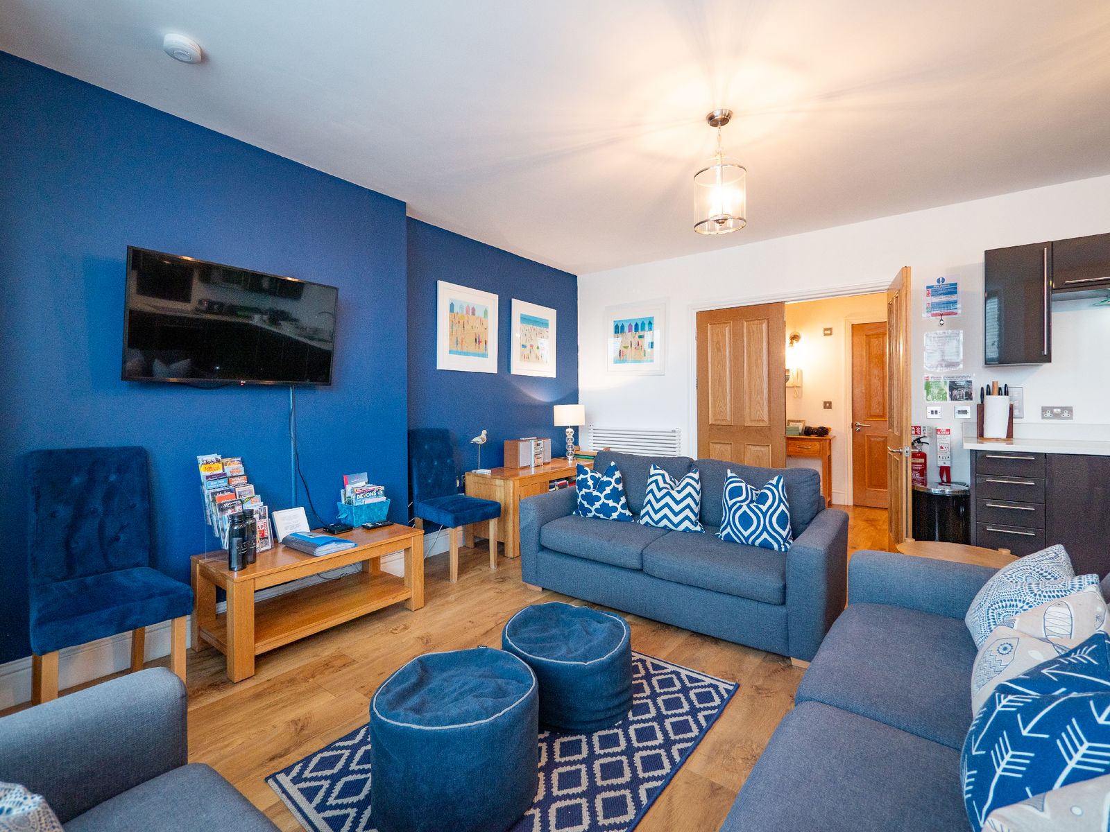 Step inside and you’re immediately welcomed by a bright, contemporary living space where deep blue accents echo the sea beyond. Large windows frame views of both the beach and Slapton Ley, creating a constantly changing backdrop whether you’re enjoying breakfast at the oak dining table or unwinding on the generous sofas after a day exploring.