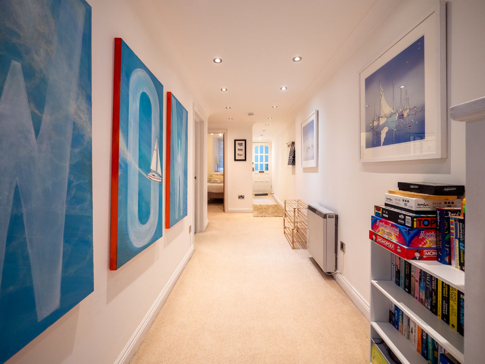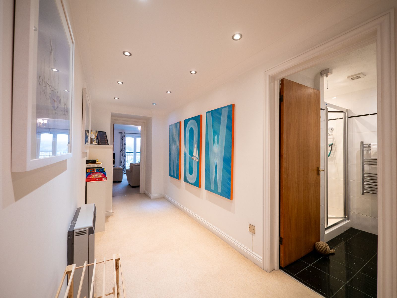 With three inviting bedrooms, the apartment is perfectly suited for families or small groups. The master bedroom offers a king-size bed, wardrobe, dressing table, and private ensuite with a shower over the bath. The second bedroom enjoys stunning river views, while the third, a cosy sea-themed room with a small double bed, is best suited for a child or small adult. A sleek family bathroom with a shower completes the accommodation.