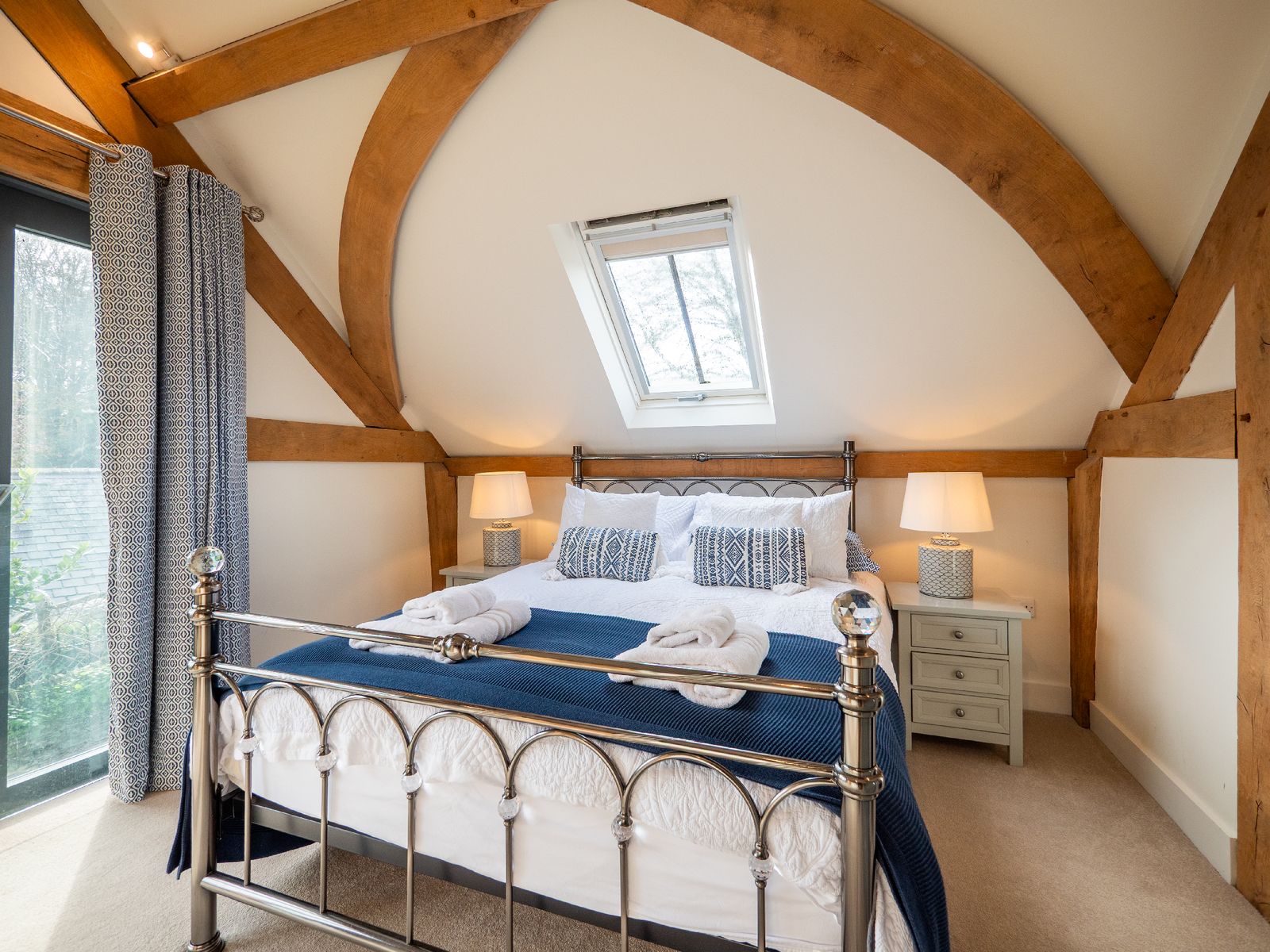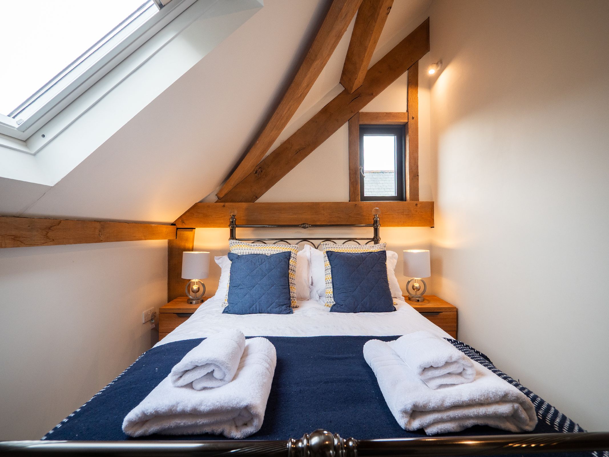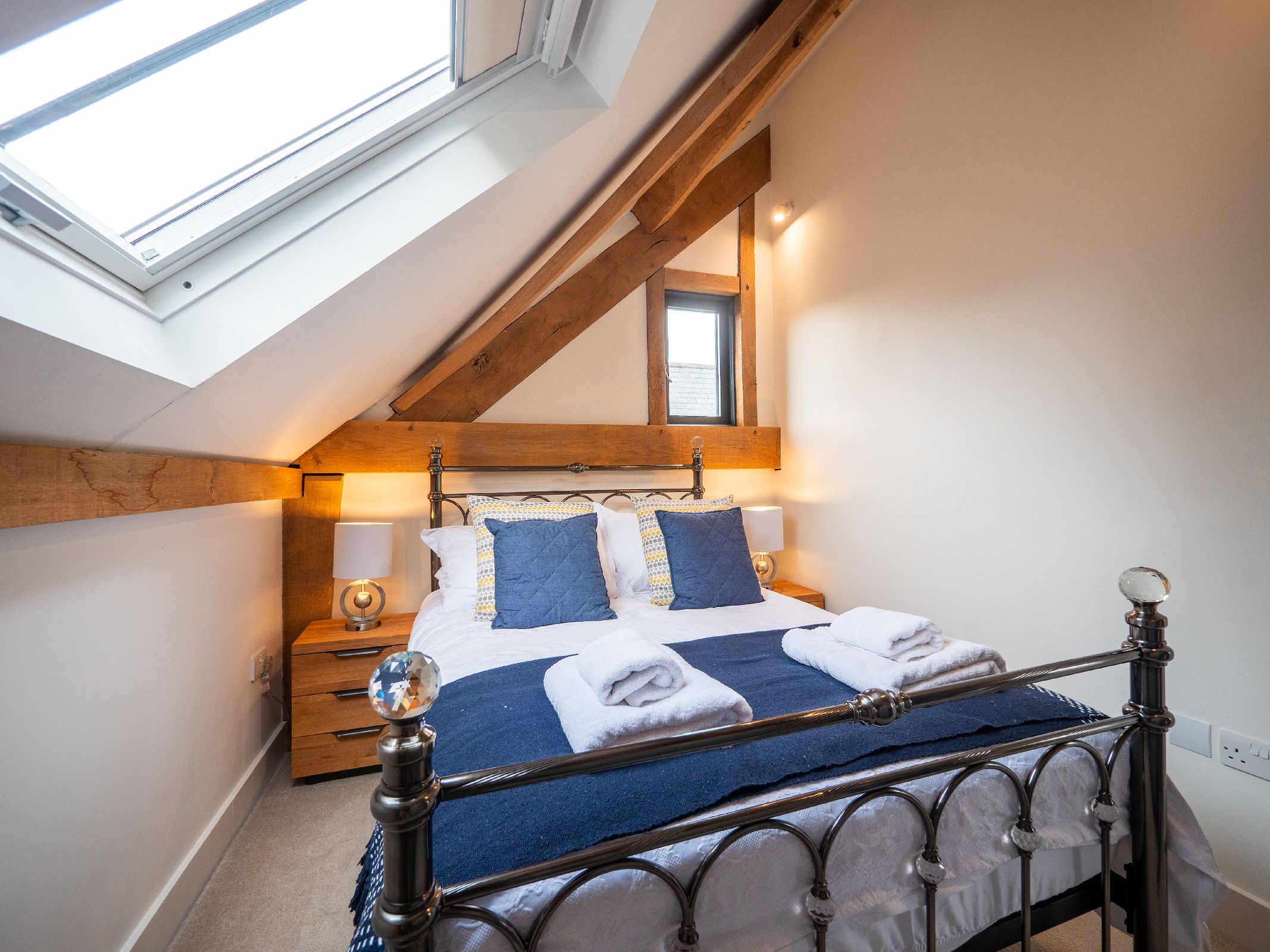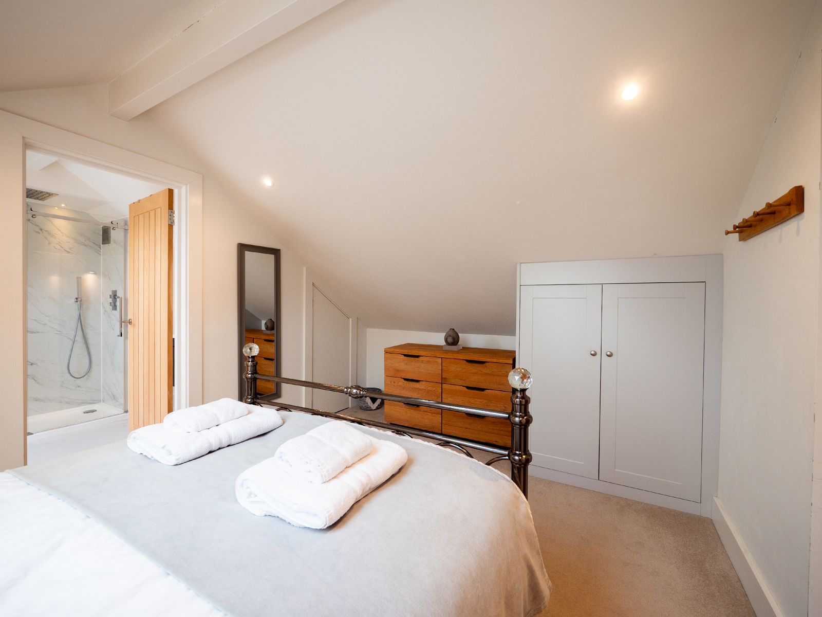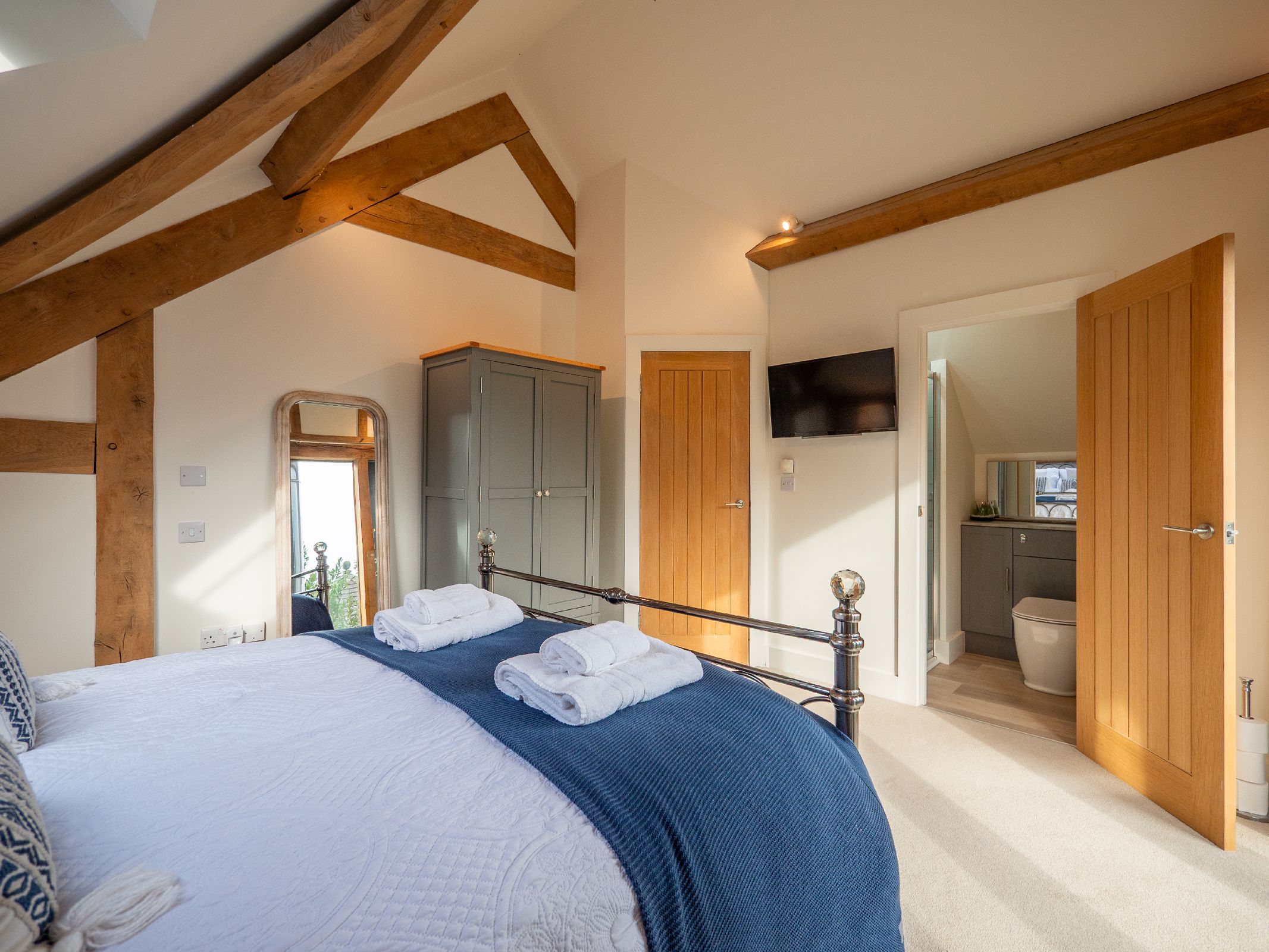 • Bedroom 2 features another king-sized bed, en suite bathroom, wardrobe, and glimpses of the sea through large opening doors that highlight the beautiful oak beams.