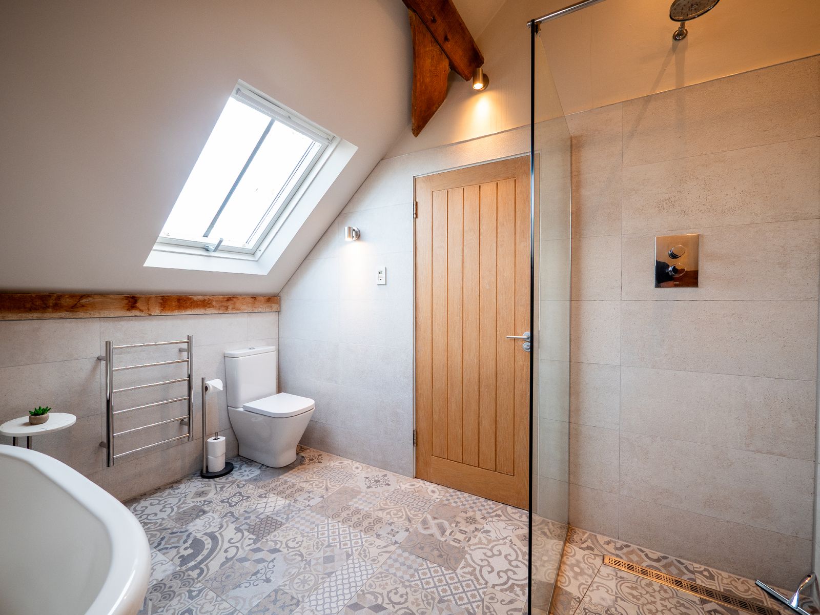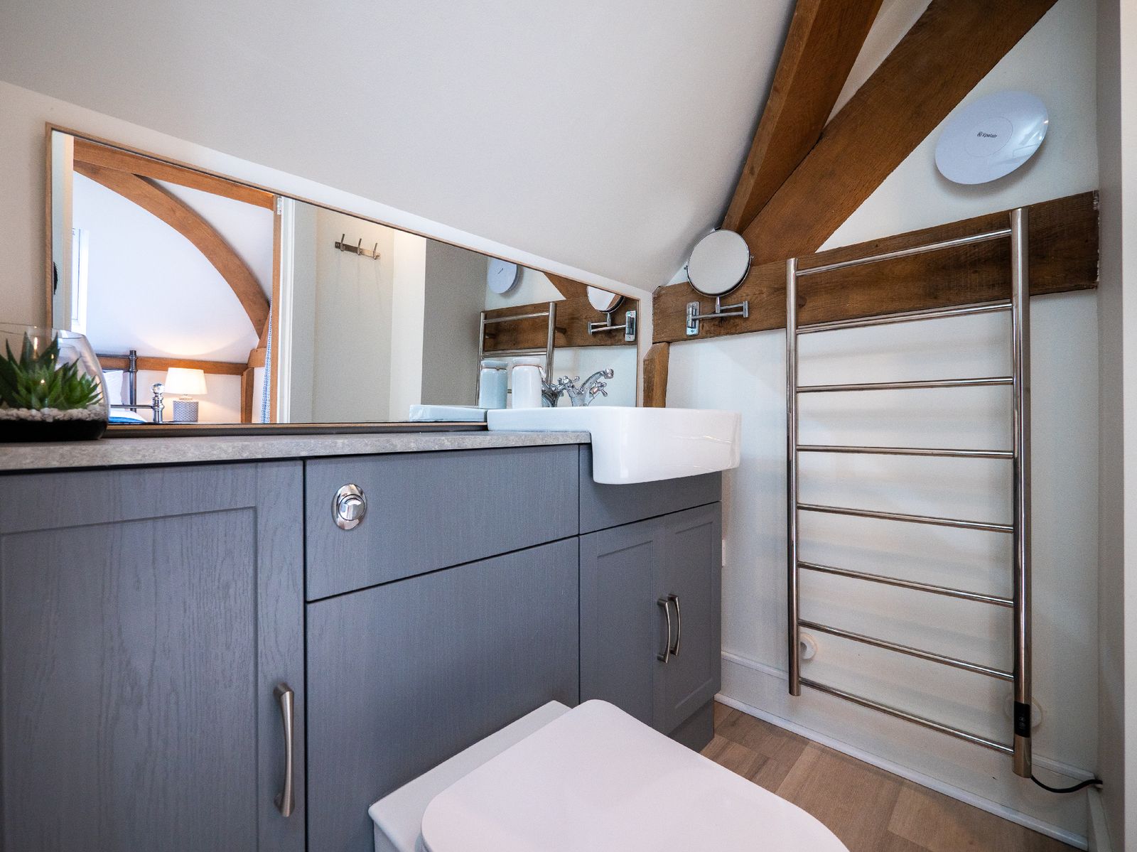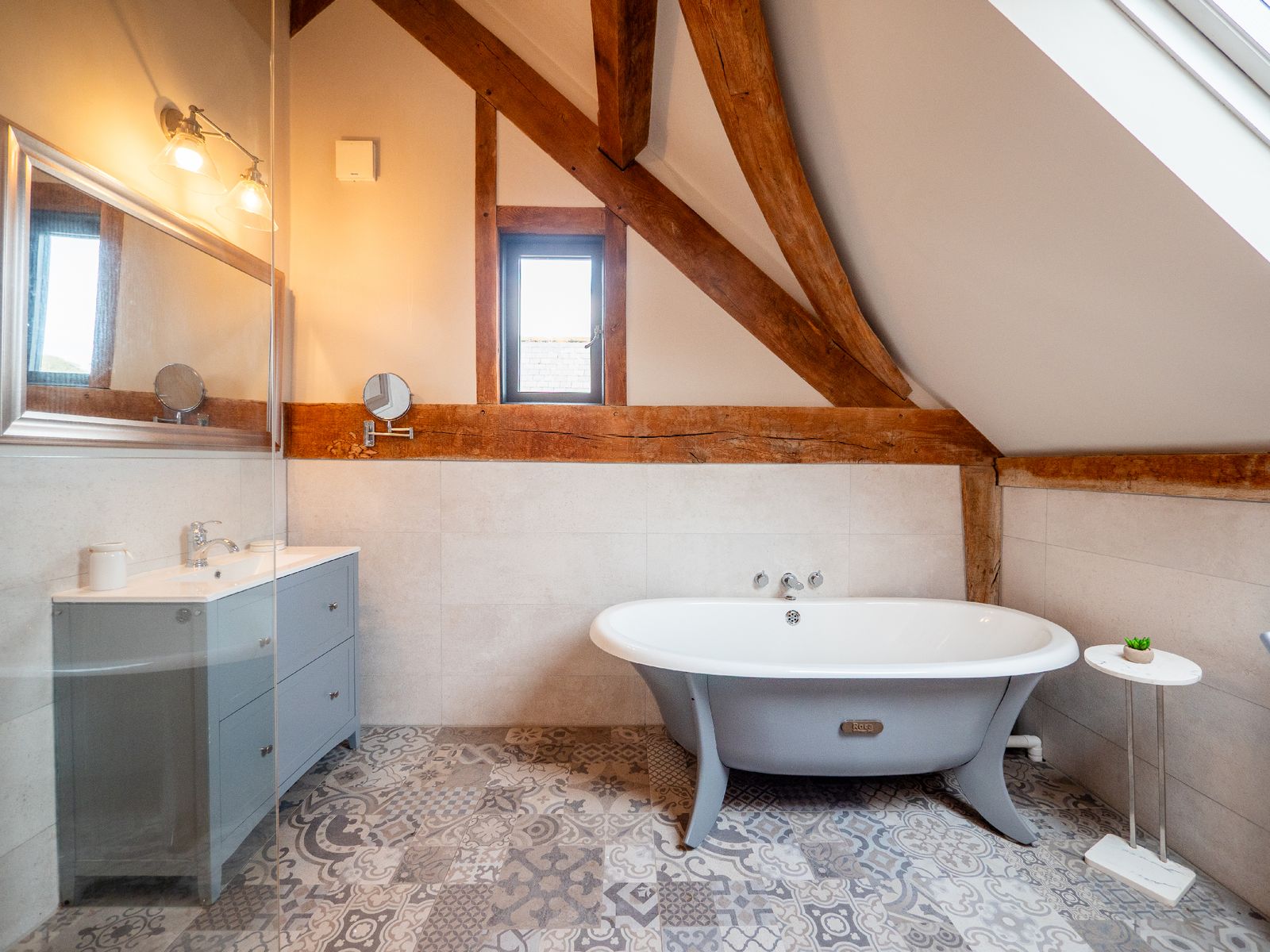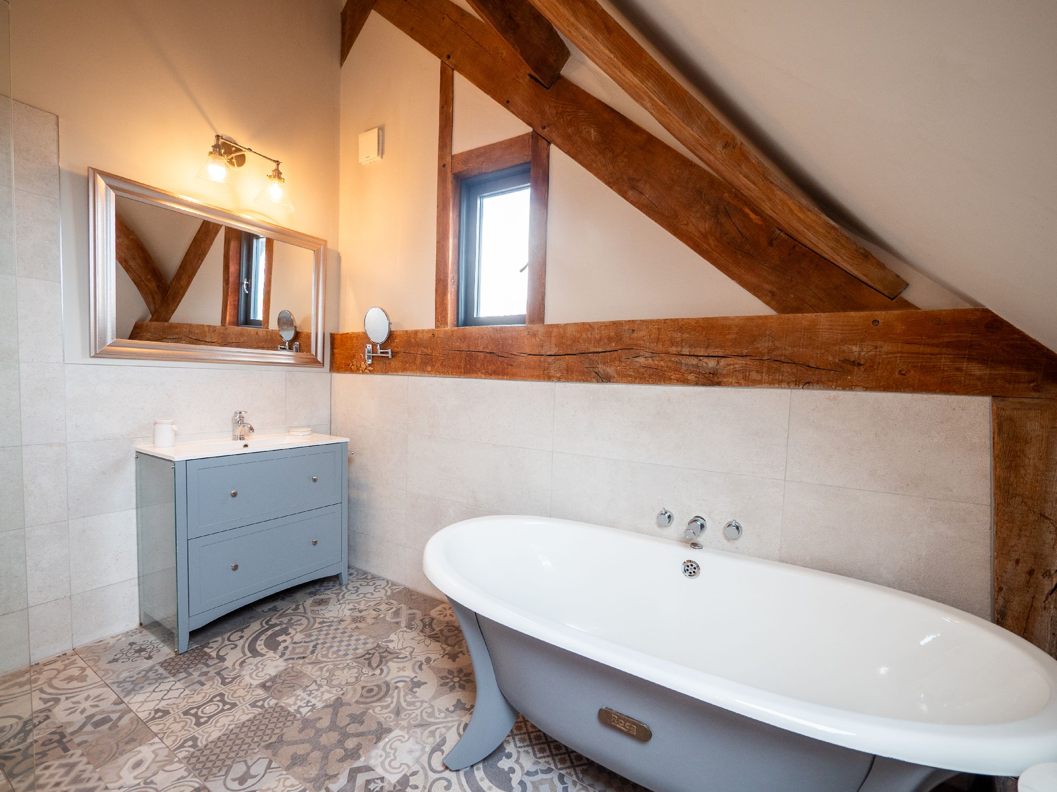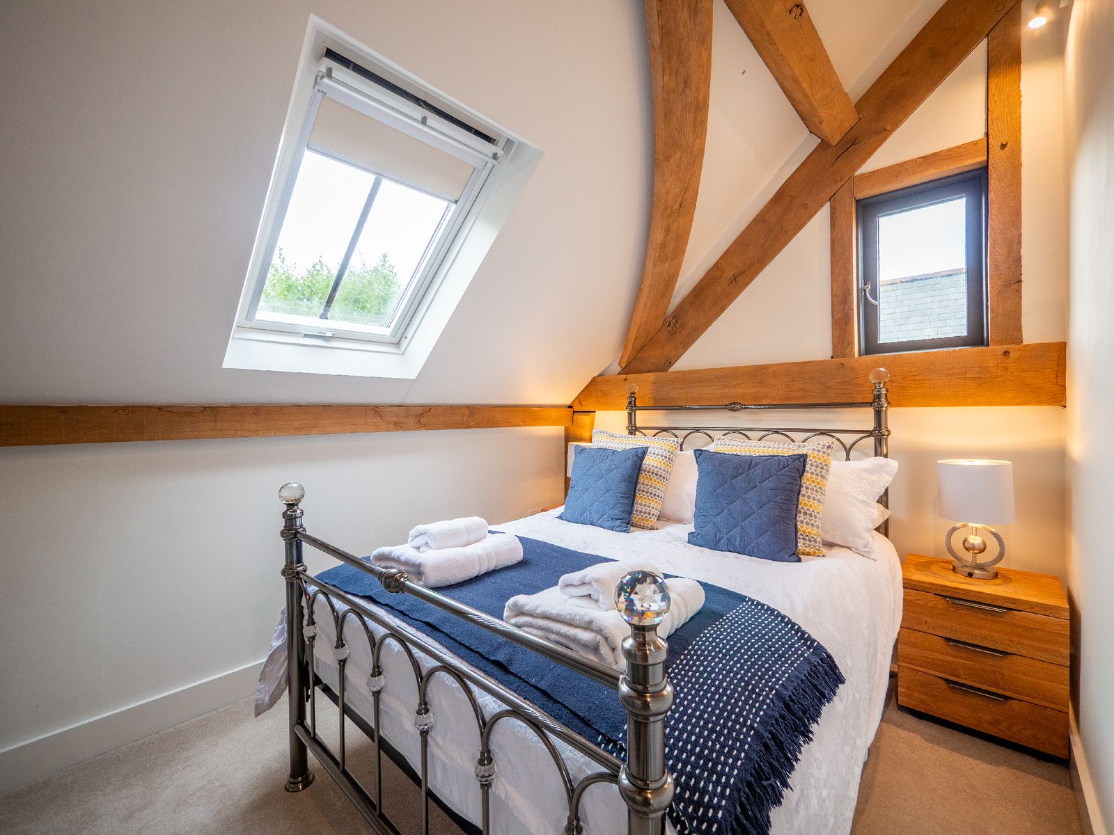 • Bedroom 2 features another king-sized bed, en suite bathroom, wardrobe, and glimpses of the sea through large opening doors that highlight the beautiful oak beams.