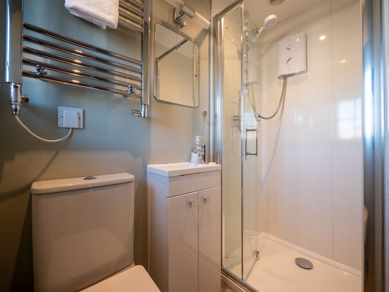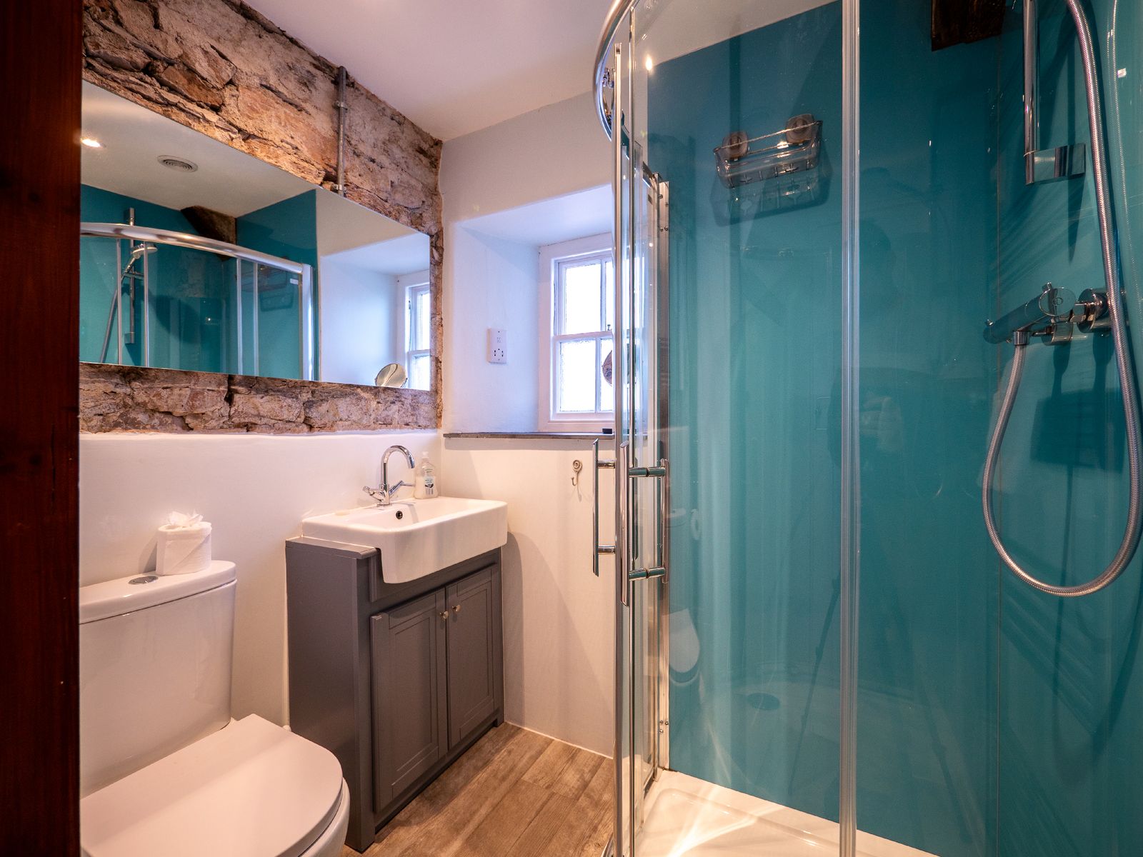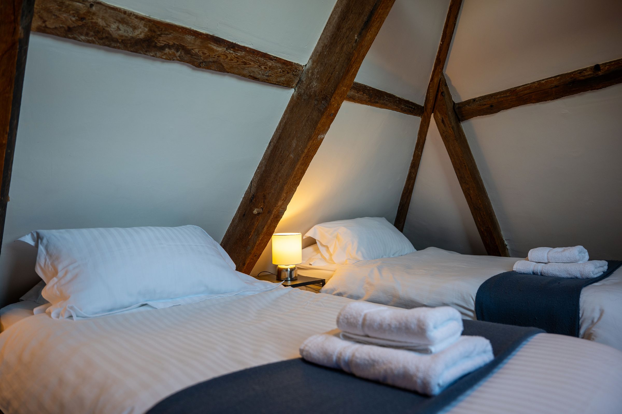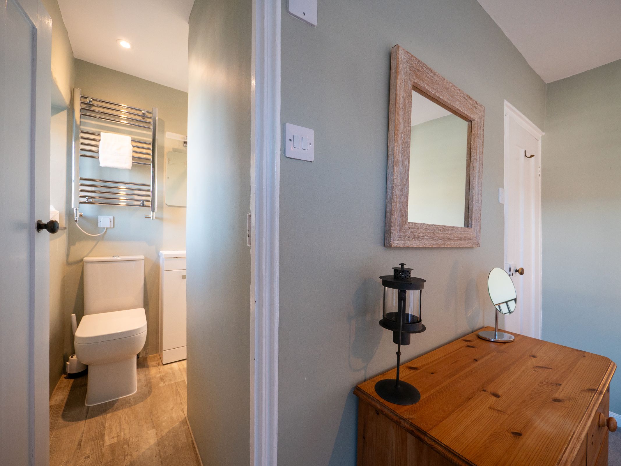 On the first floor, a contemporary shower room with walk-in shower and heated towel rail provides a refreshing space to unwind. This level also features two beautifully presented bedrooms: a super-king-size room with zip-and-link flexibility (can be made into twins on request) and a king-size bedroom with its own en-suite walk-in shower room.