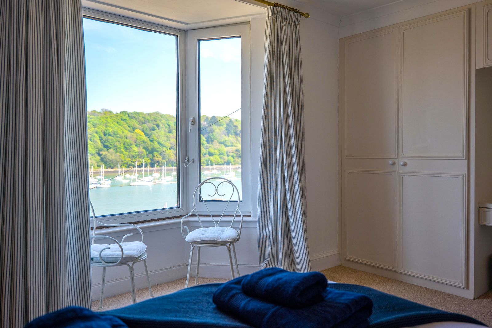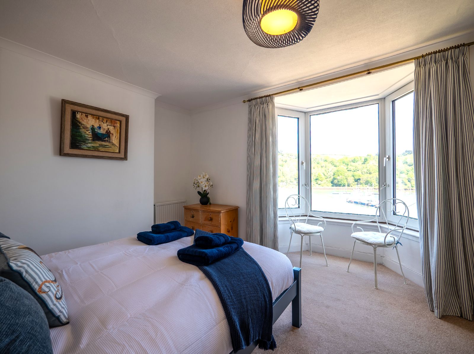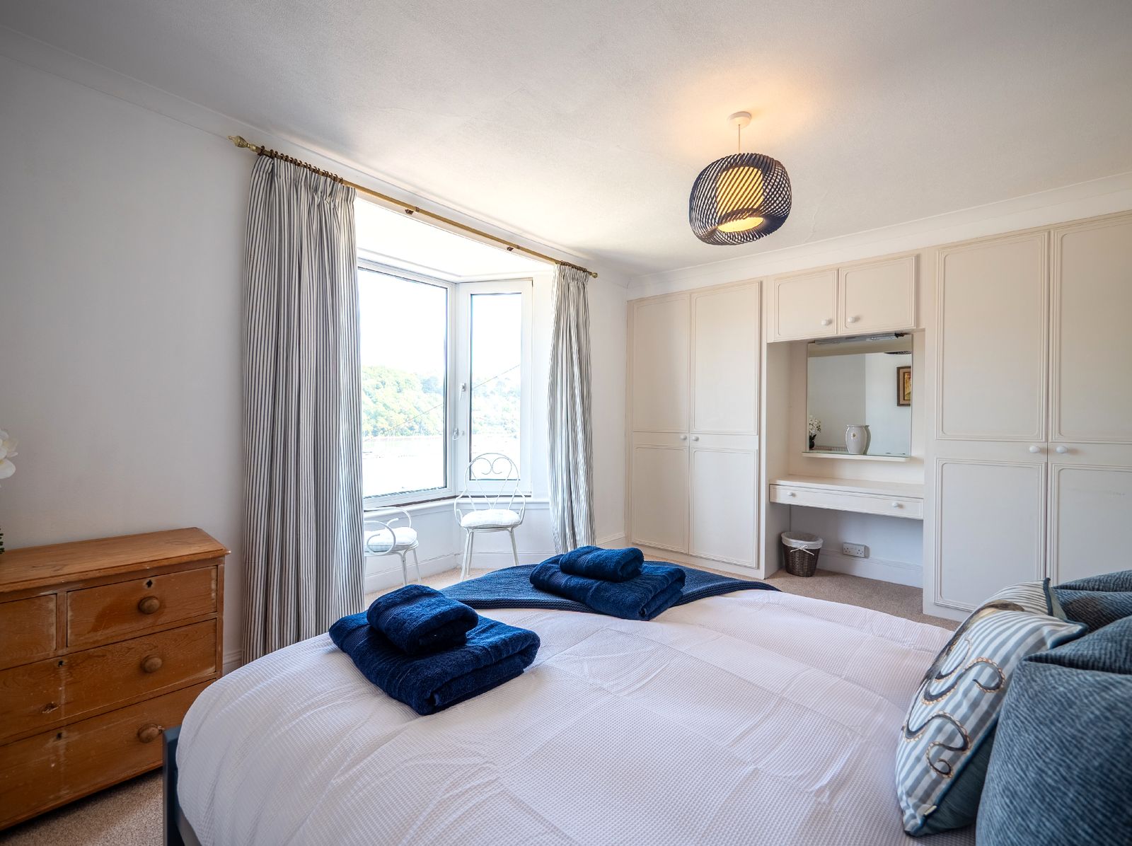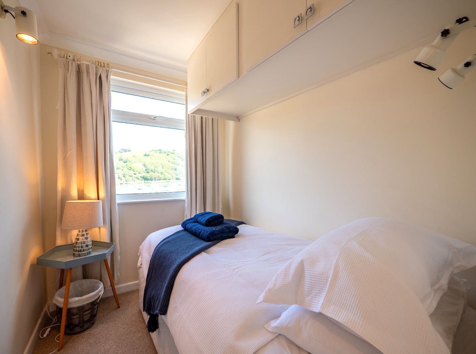 Sleeping up to six guests, Dart Lookout features four inviting bedrooms, each decorated in soft coastal tones. The master bedroom includes a bay window with panoramic river views, a dressing table, and ample wardrobe space. The twin bedroom is ideal for children or friends, while two single rooms, one with river views and one with its own washbasin, share the family bathroom, which includes a full-size bath with overhead shower.