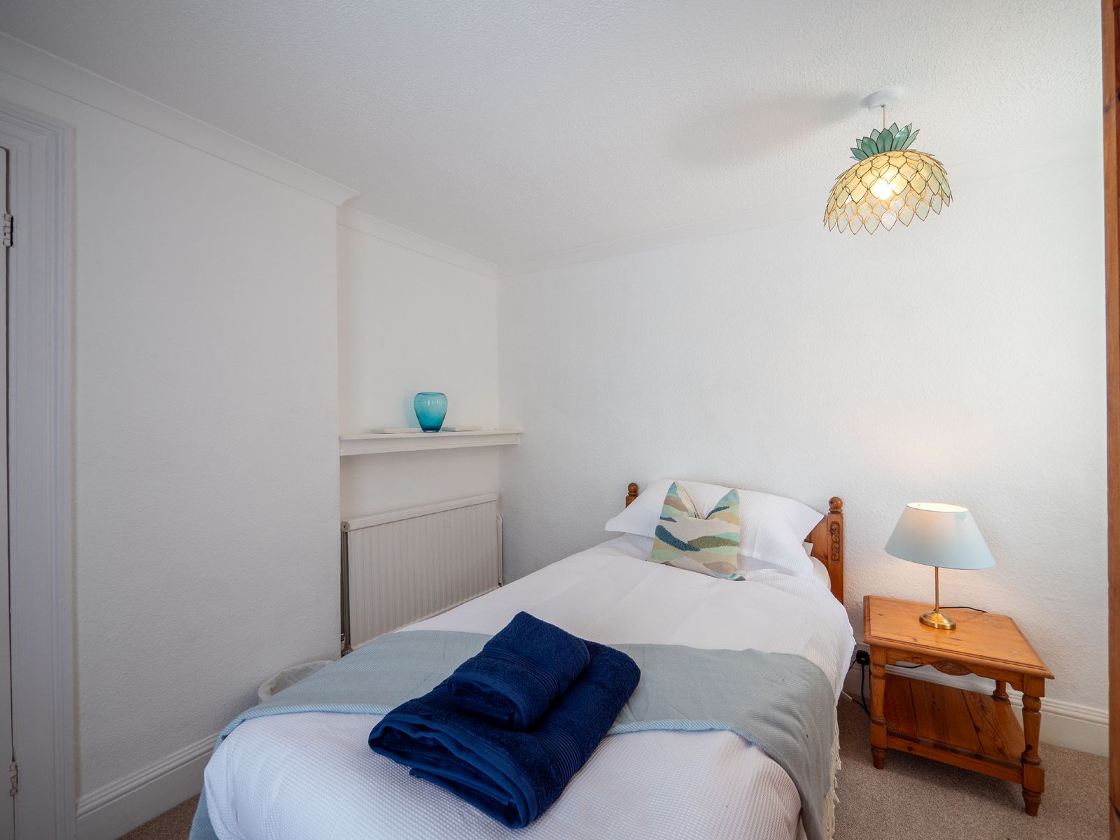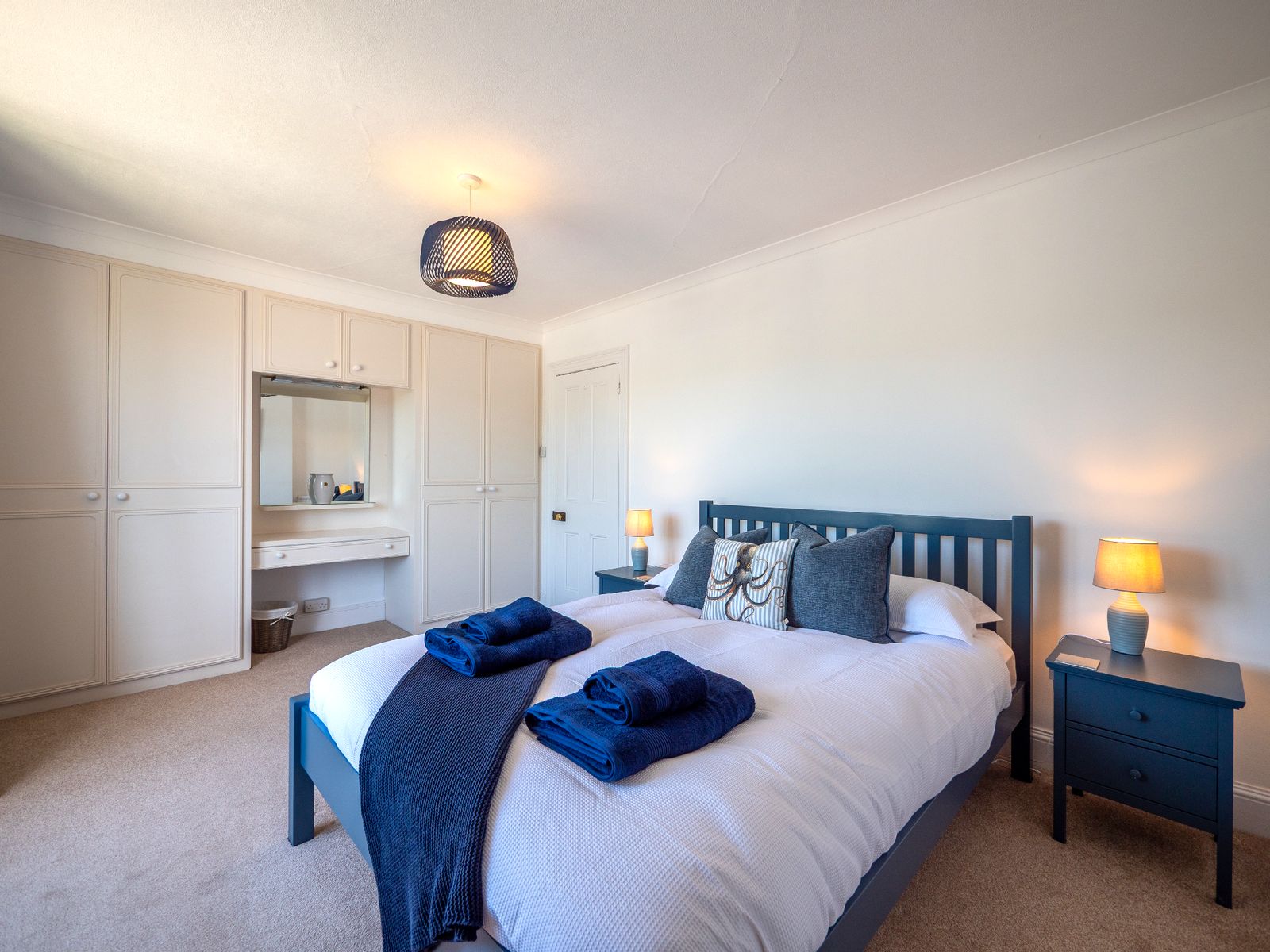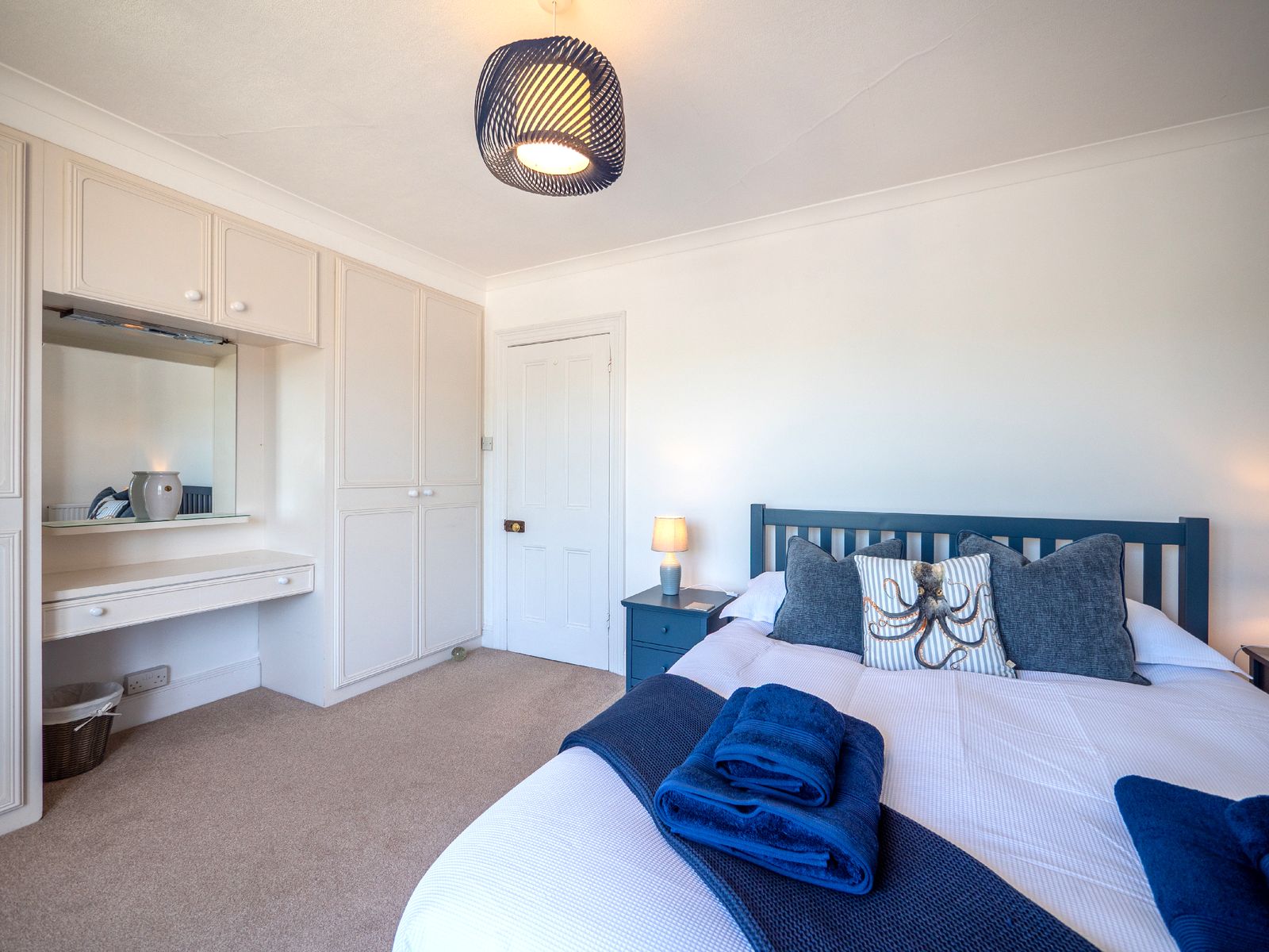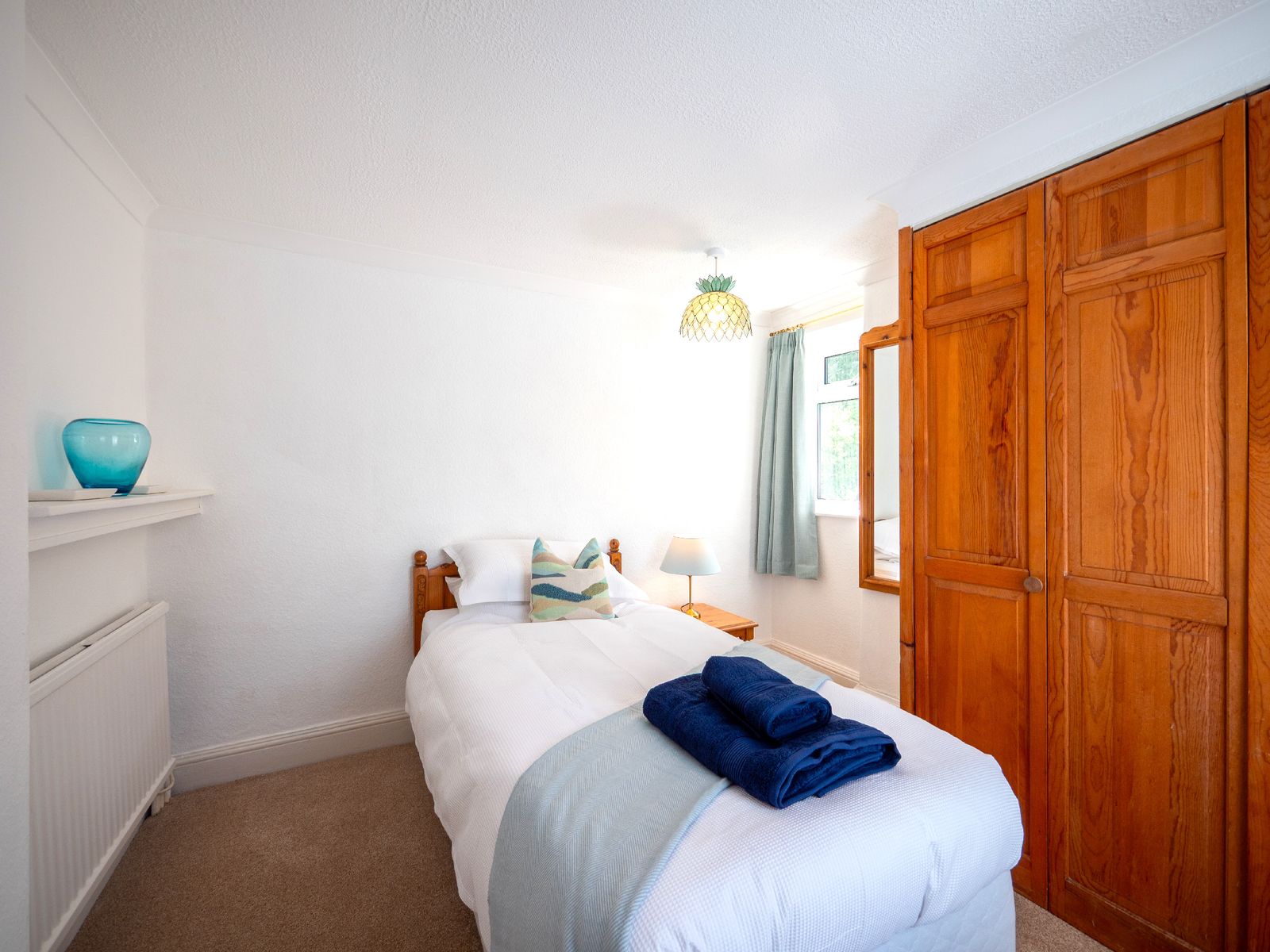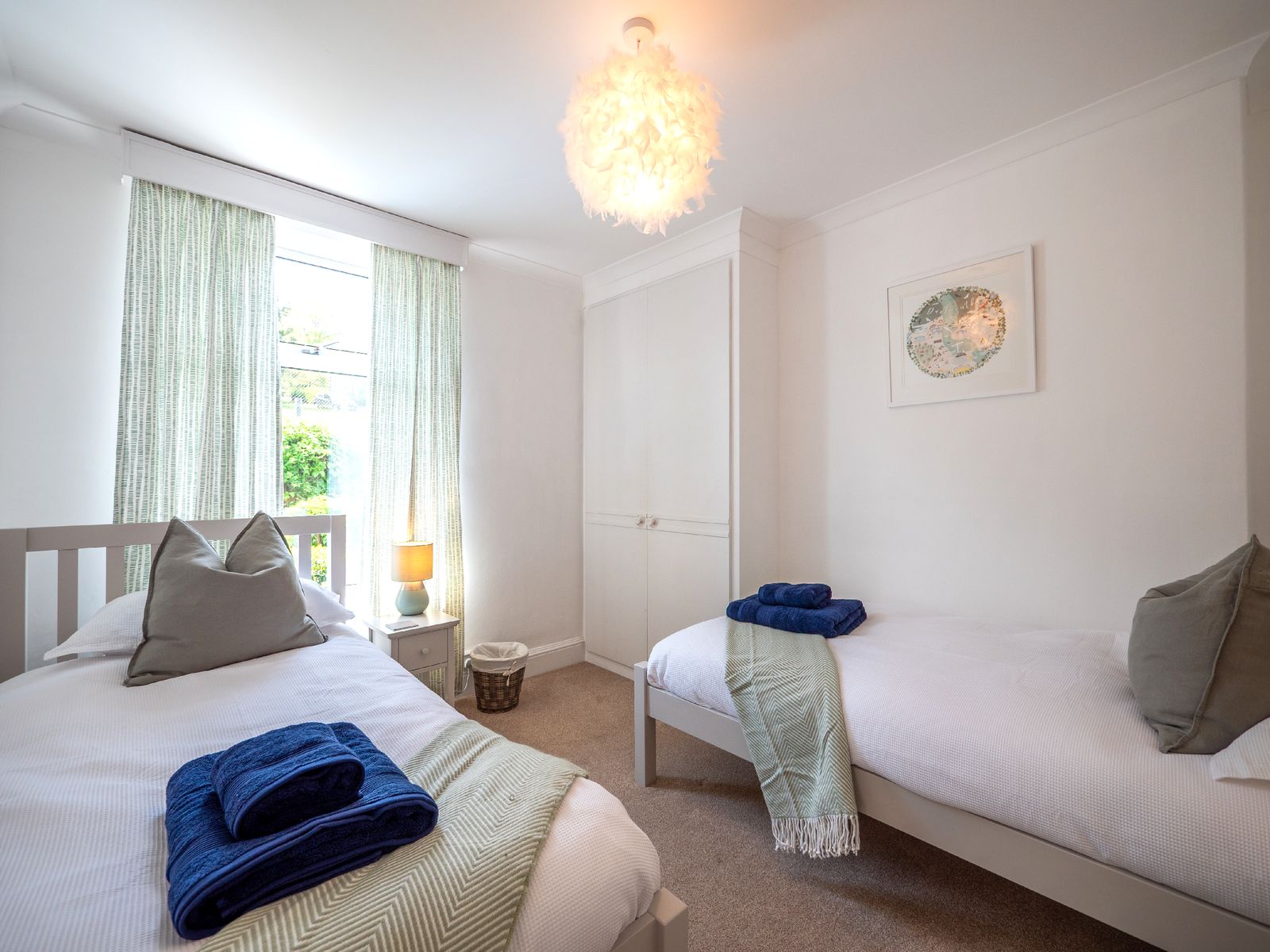 Sleeping up to six guests, Dart Lookout features four inviting bedrooms, each decorated in soft coastal tones. The master bedroom includes a bay window with panoramic river views, a dressing table, and ample wardrobe space. The twin bedroom is ideal for children or friends, while two single rooms, one with river views and one with its own washbasin, share the family bathroom, which includes a full-size bath with overhead shower.