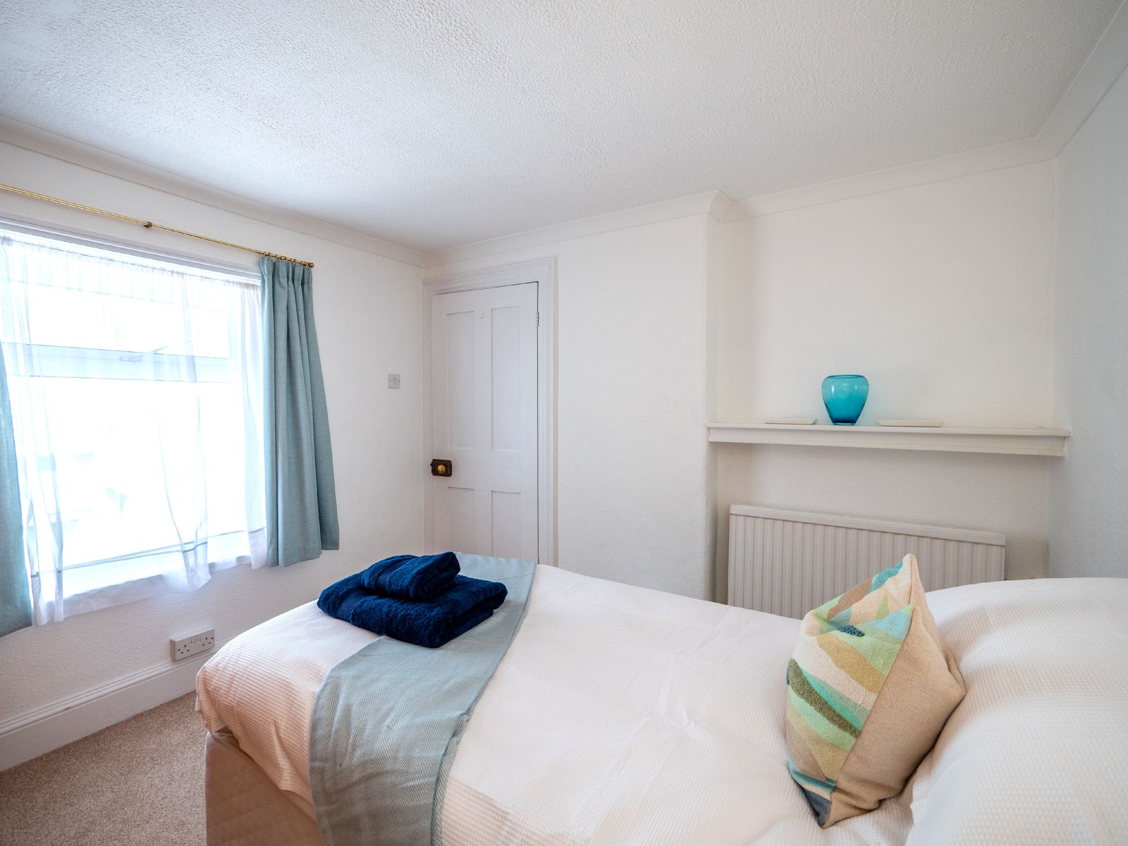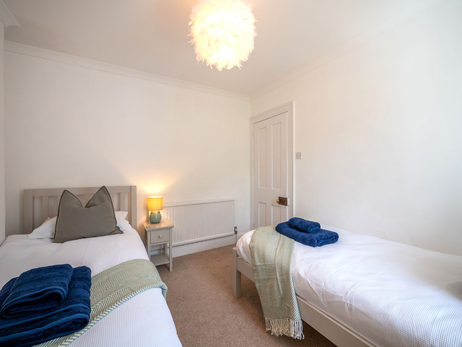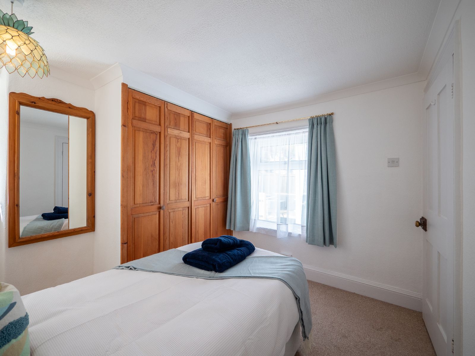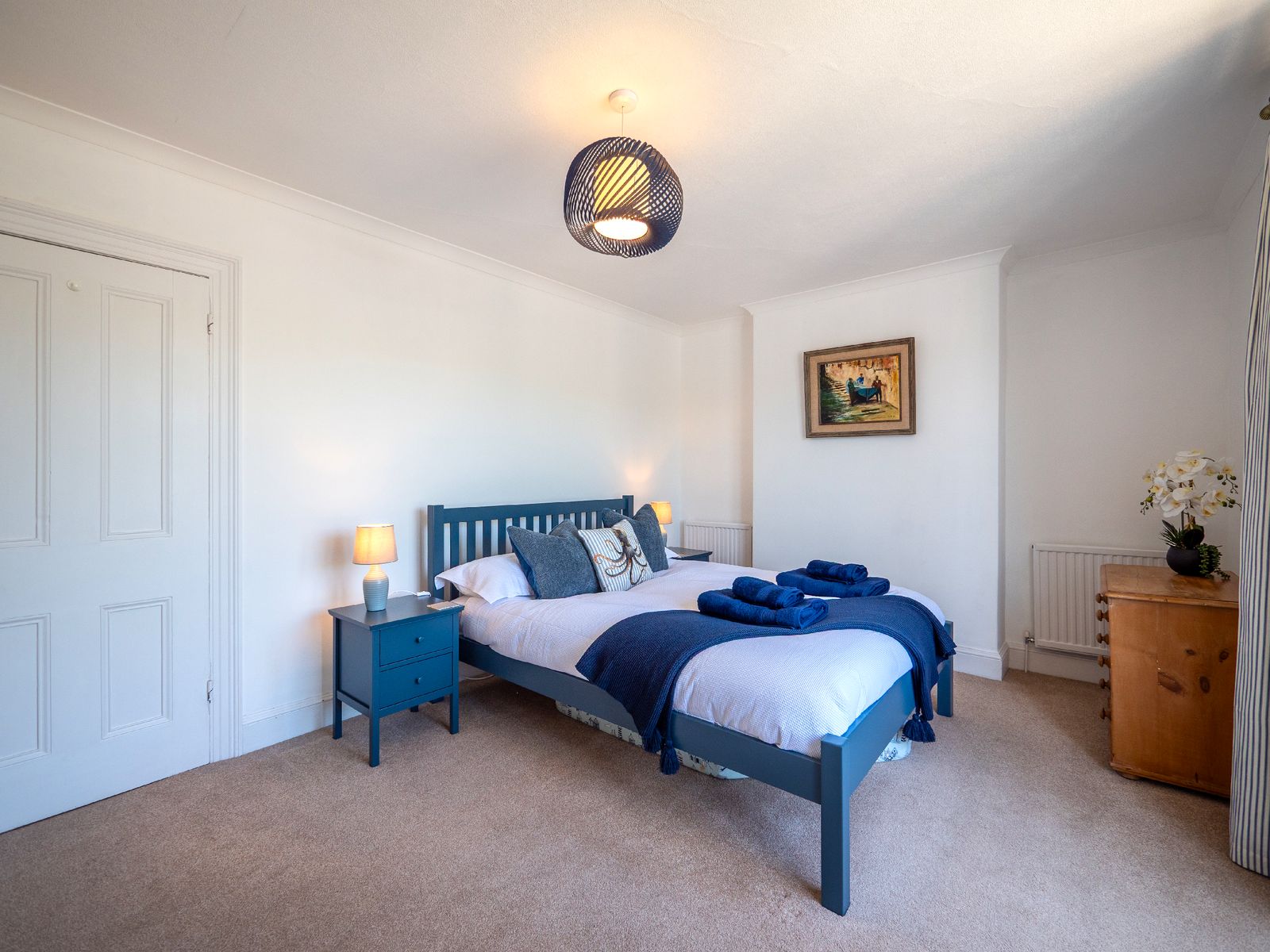 Sleeping up to six guests, Dart Lookout features four inviting bedrooms, each decorated in soft coastal tones. The master bedroom includes a bay window with panoramic river views, a dressing table, and ample wardrobe space. The twin bedroom is ideal for children or friends, while two single rooms, one with river views and one with its own washbasin, share the family bathroom, which includes a full-size bath with overhead shower.