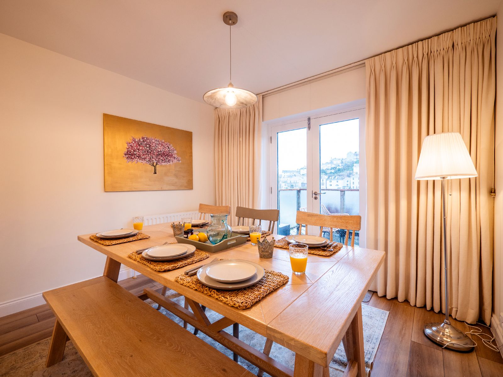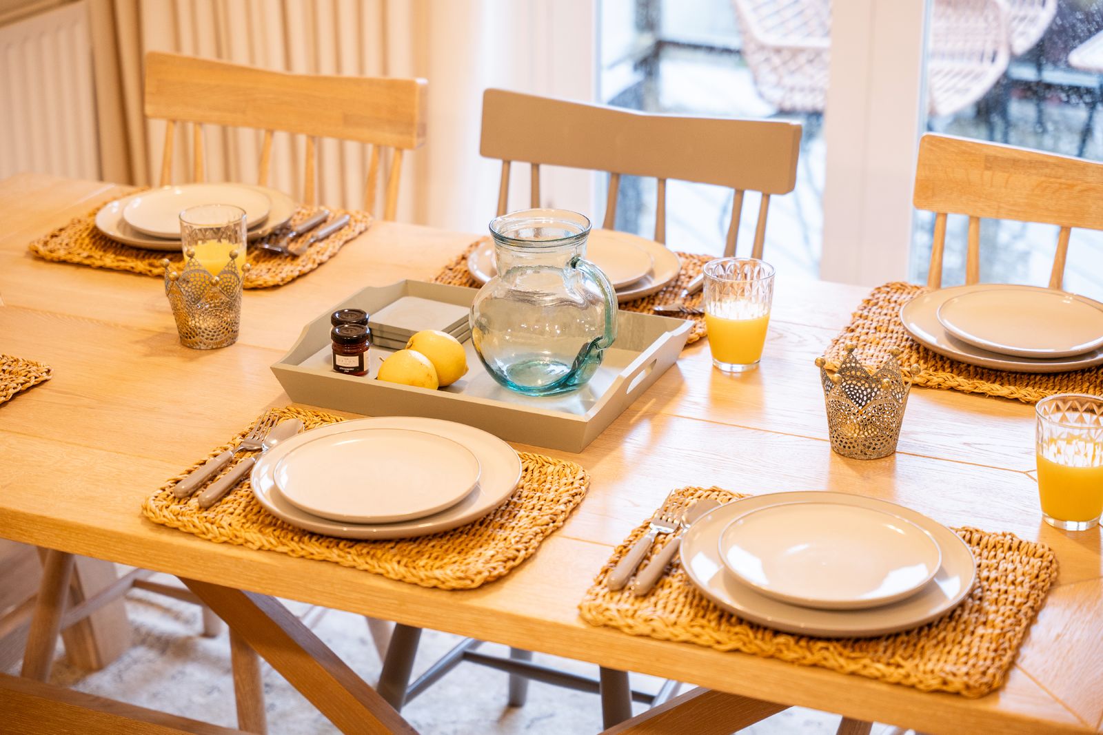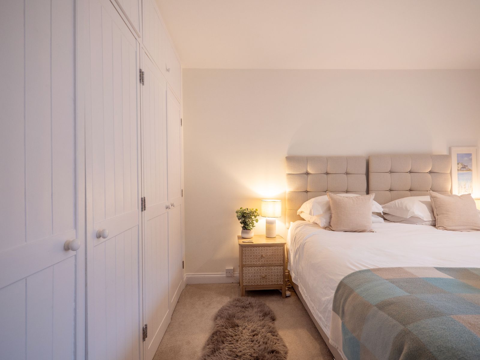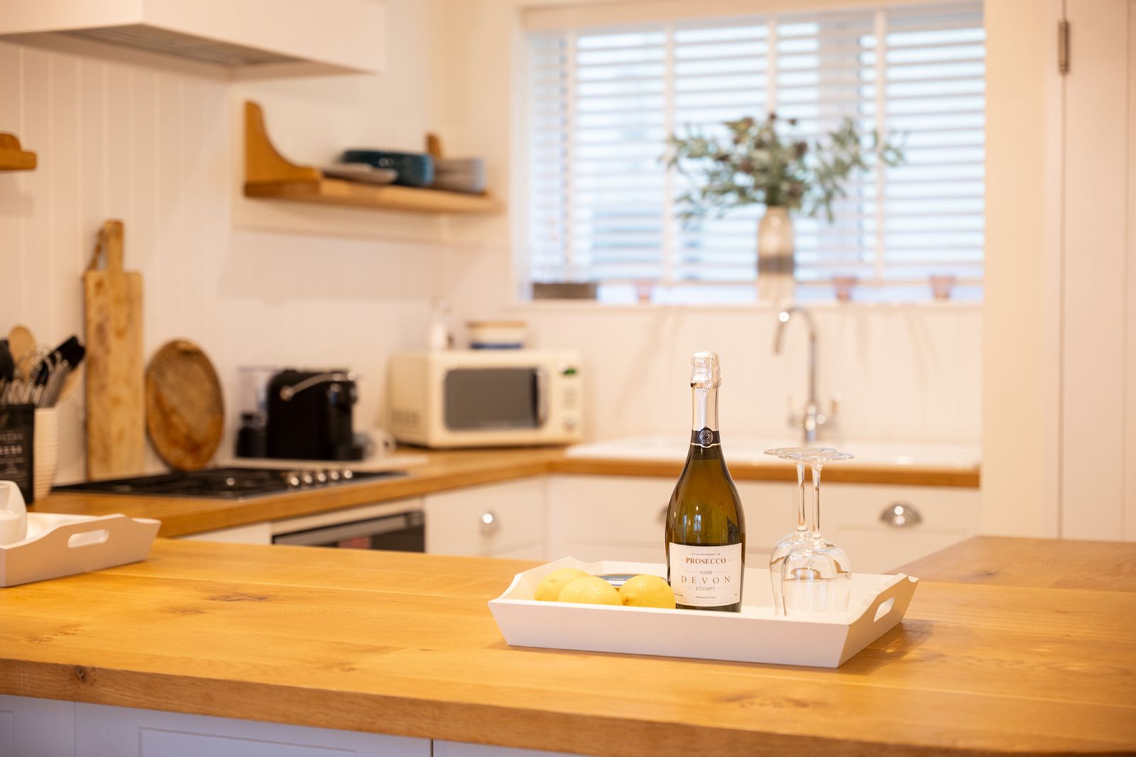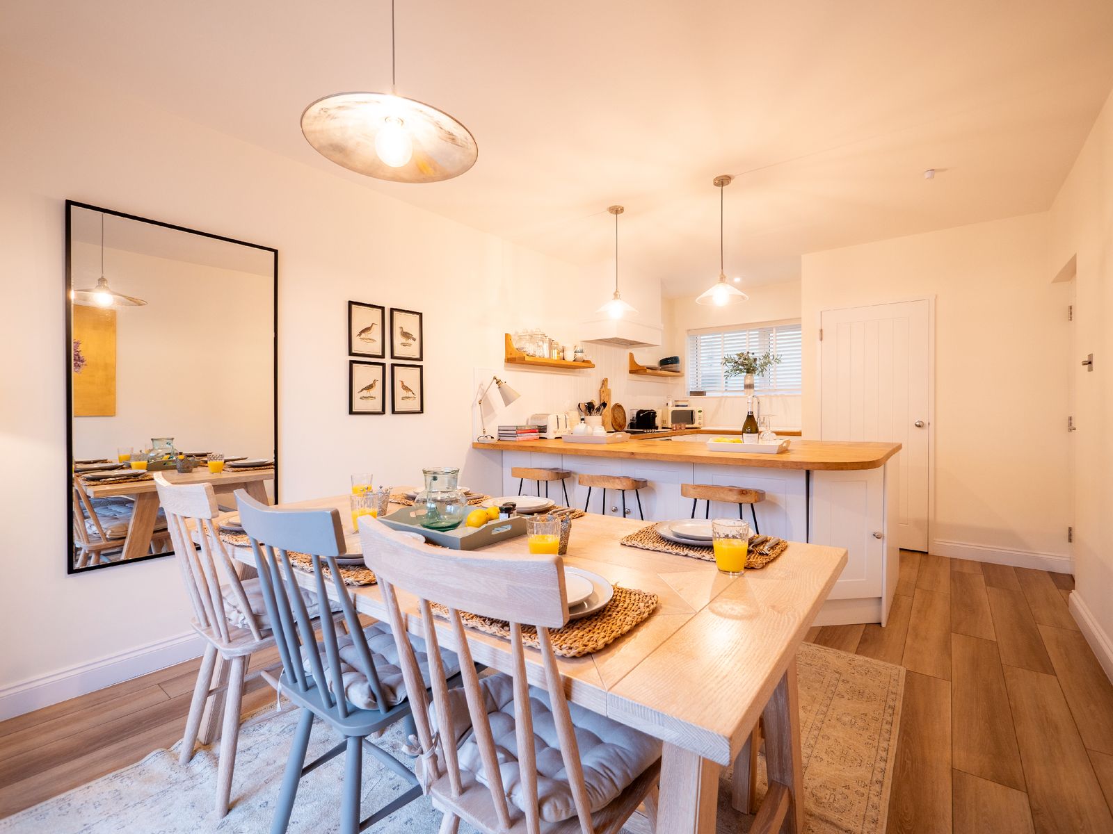 The adjoining kitchen and dining space is equally inviting. A pale oak dining table comfortably seats six, while the white wooden kitchen, topped with solid oak worktops, is fully equipped for self-catering holidays. There’s a coffee machine (pods provided), dishwasher, washing machine and all the essentials needed for relaxed family meals or celebratory suppers.