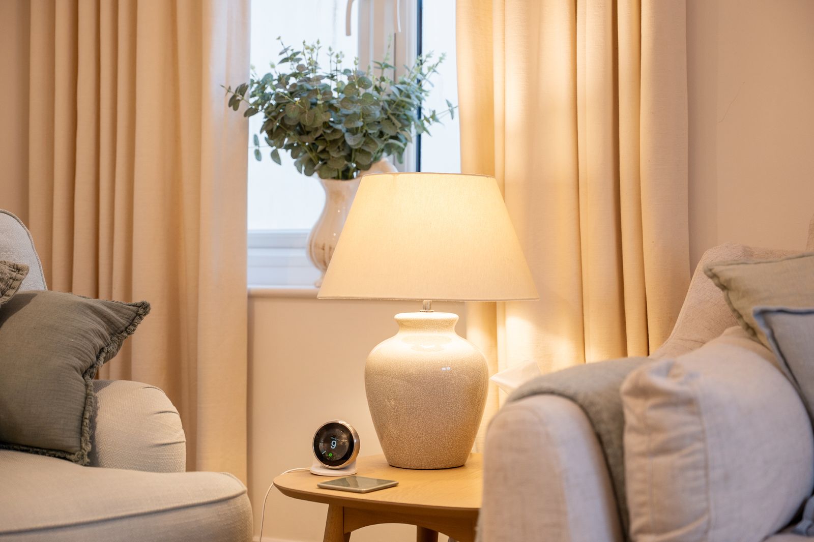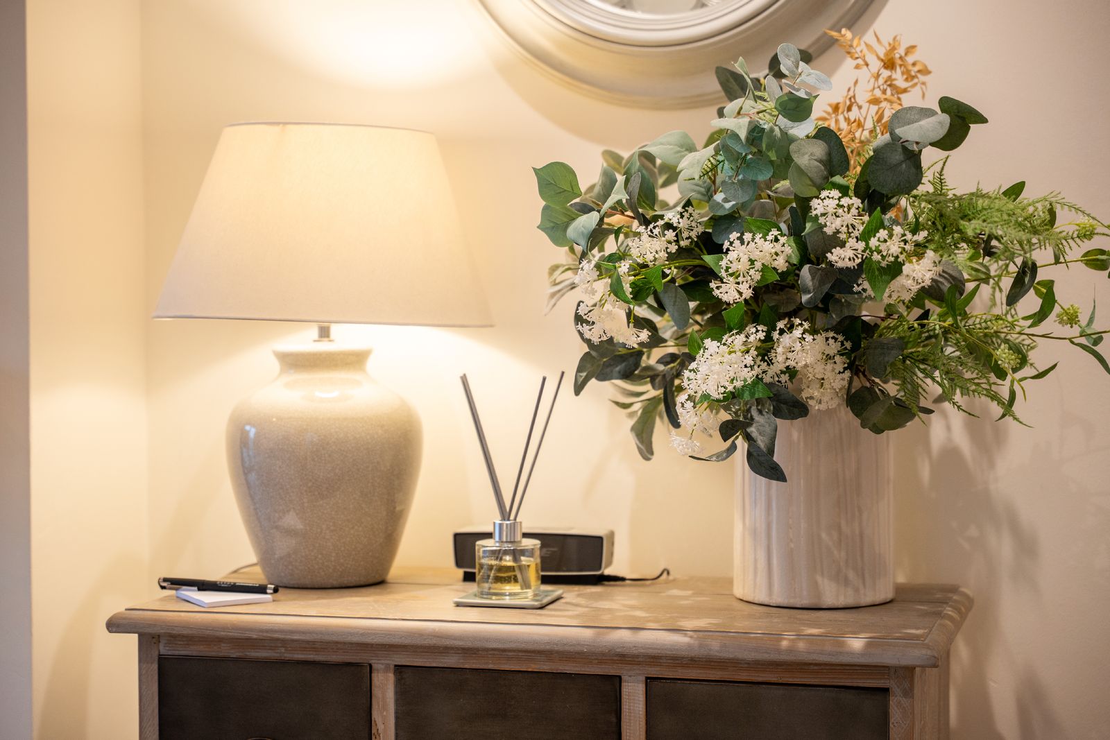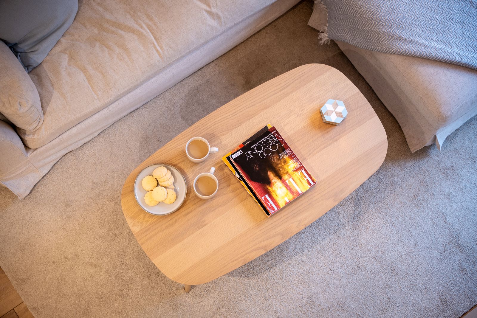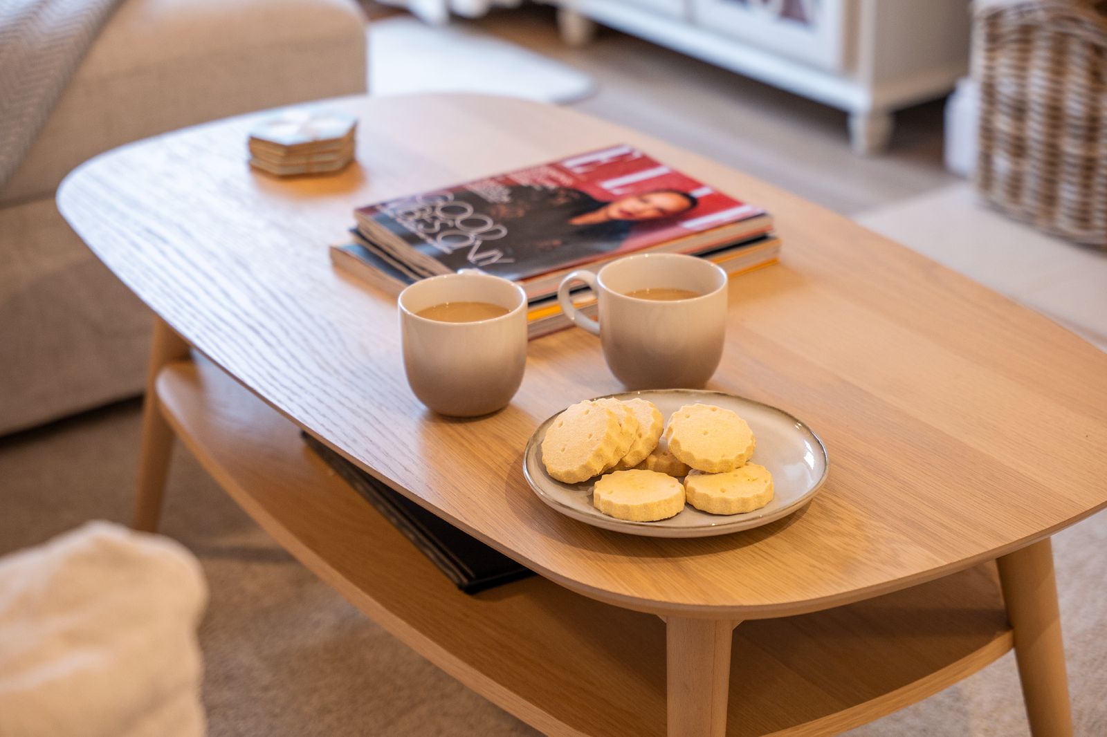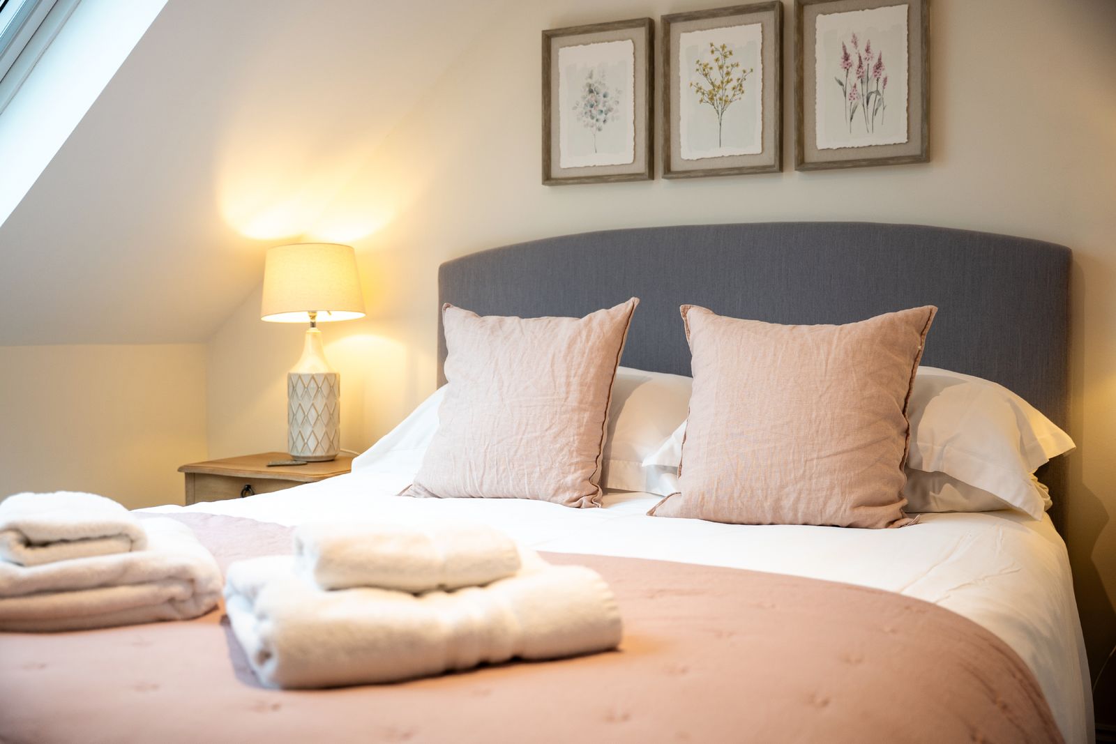 The adjoining kitchen and dining space is equally inviting. A pale oak dining table comfortably seats six, while the white wooden kitchen, topped with solid oak worktops, is fully equipped for self-catering holidays. There’s a coffee machine (pods provided), dishwasher, washing machine and all the essentials needed for relaxed family meals or celebratory suppers.