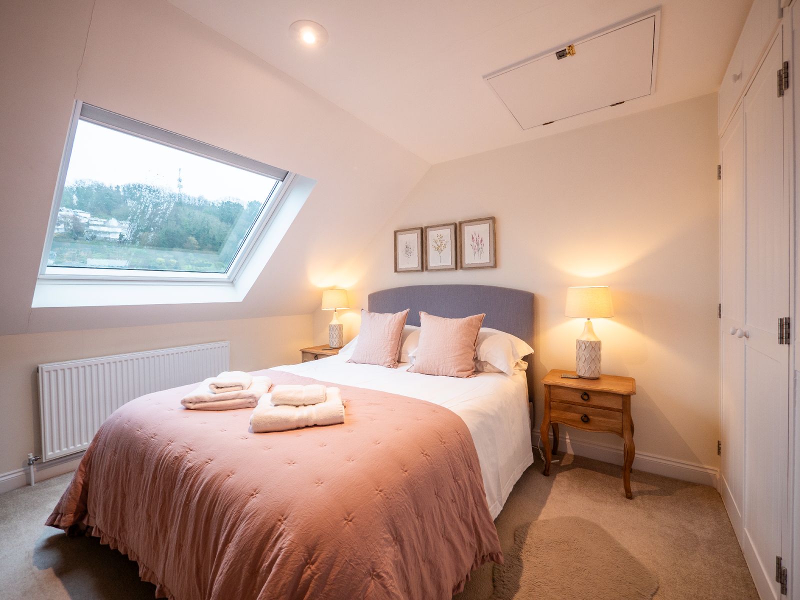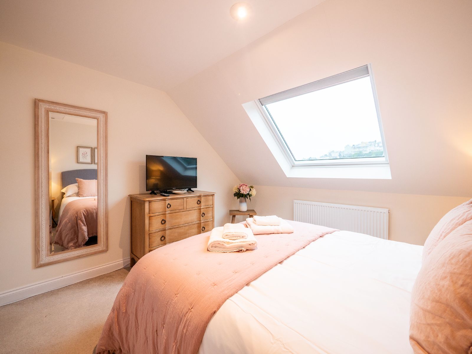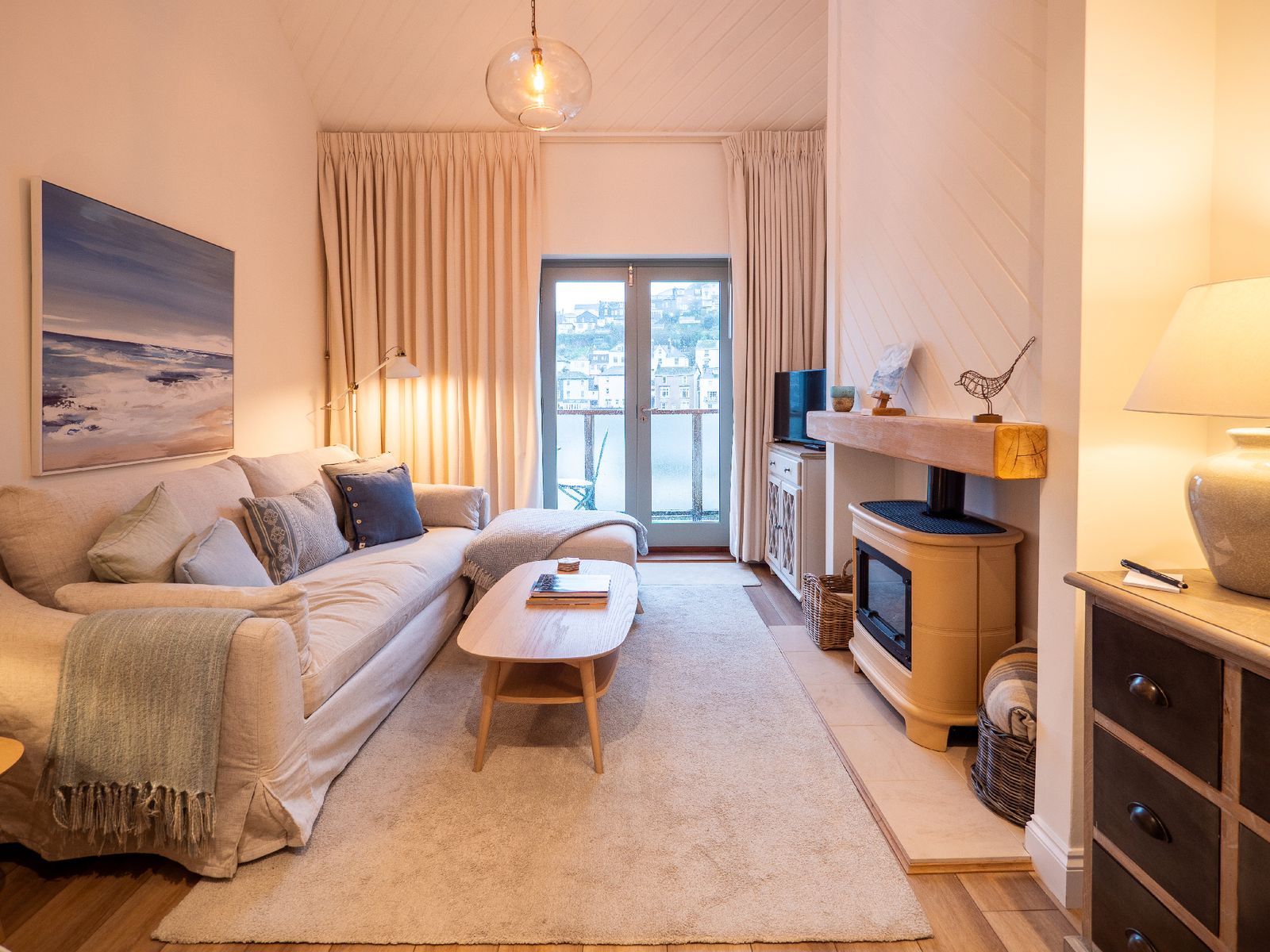 Arranged over three floors, the house has been thoughtfully updated to create light-filled, sociable spaces while retaining a calm and welcoming feel. The middle floor is the heart of the home, a large open-plan living area with vaulted ceiling and cosy gas-fired burner, perfect for relaxed evenings after coastal walks. French doors open onto a wooden balcony where you can sit with morning coffee or an evening glass of wine, gazing across Dartmouth’s rooftops towards the harbour.