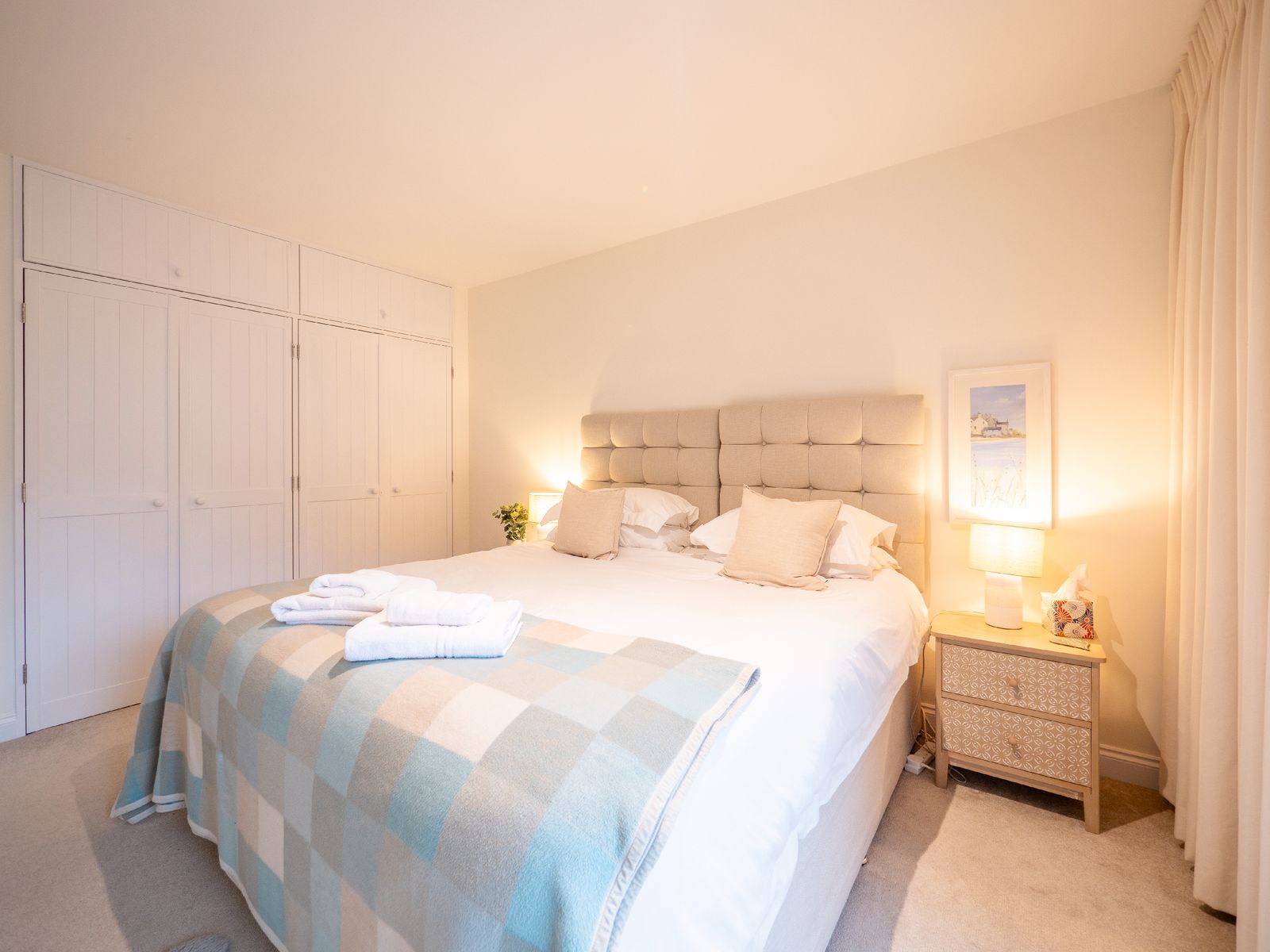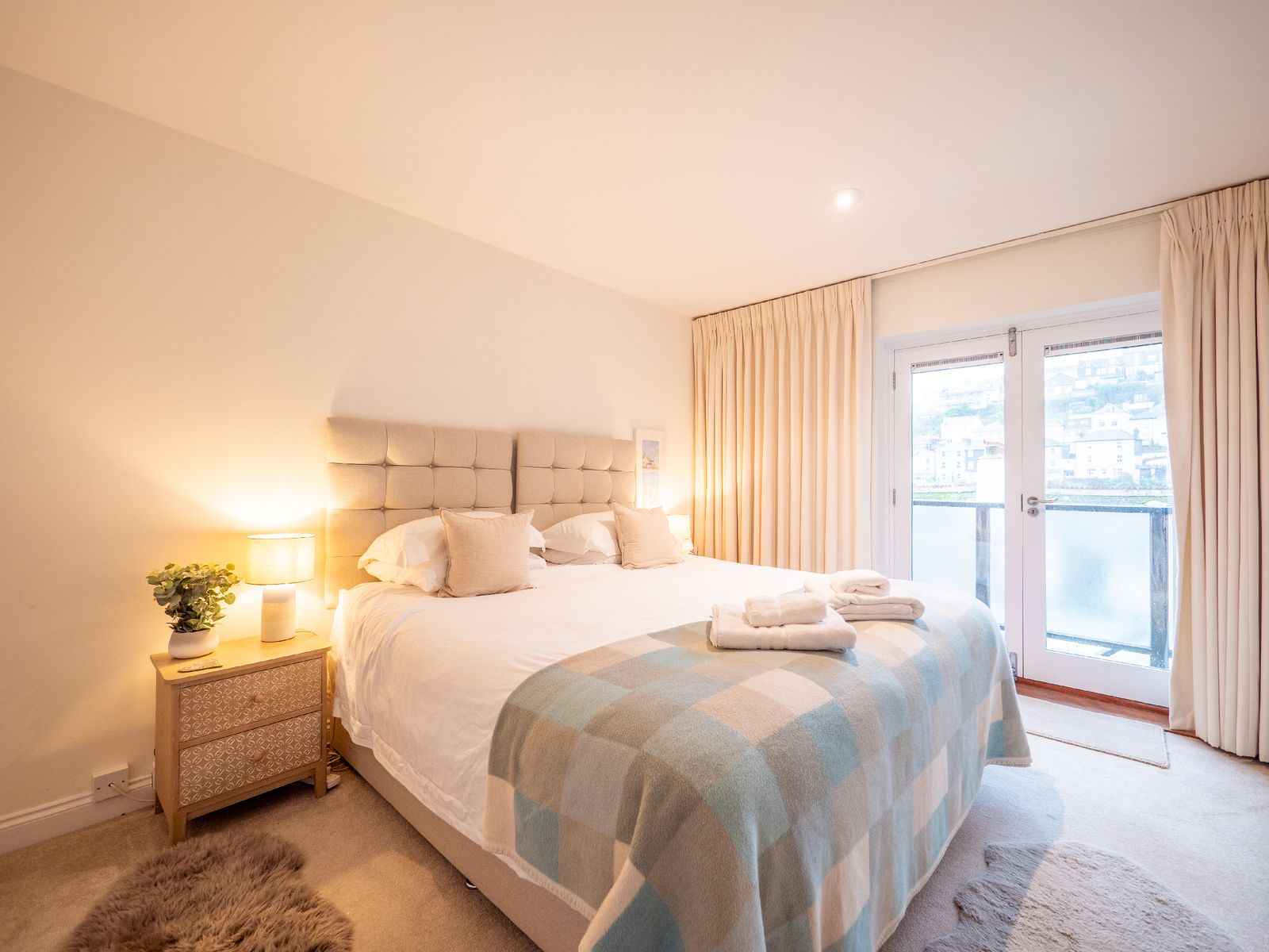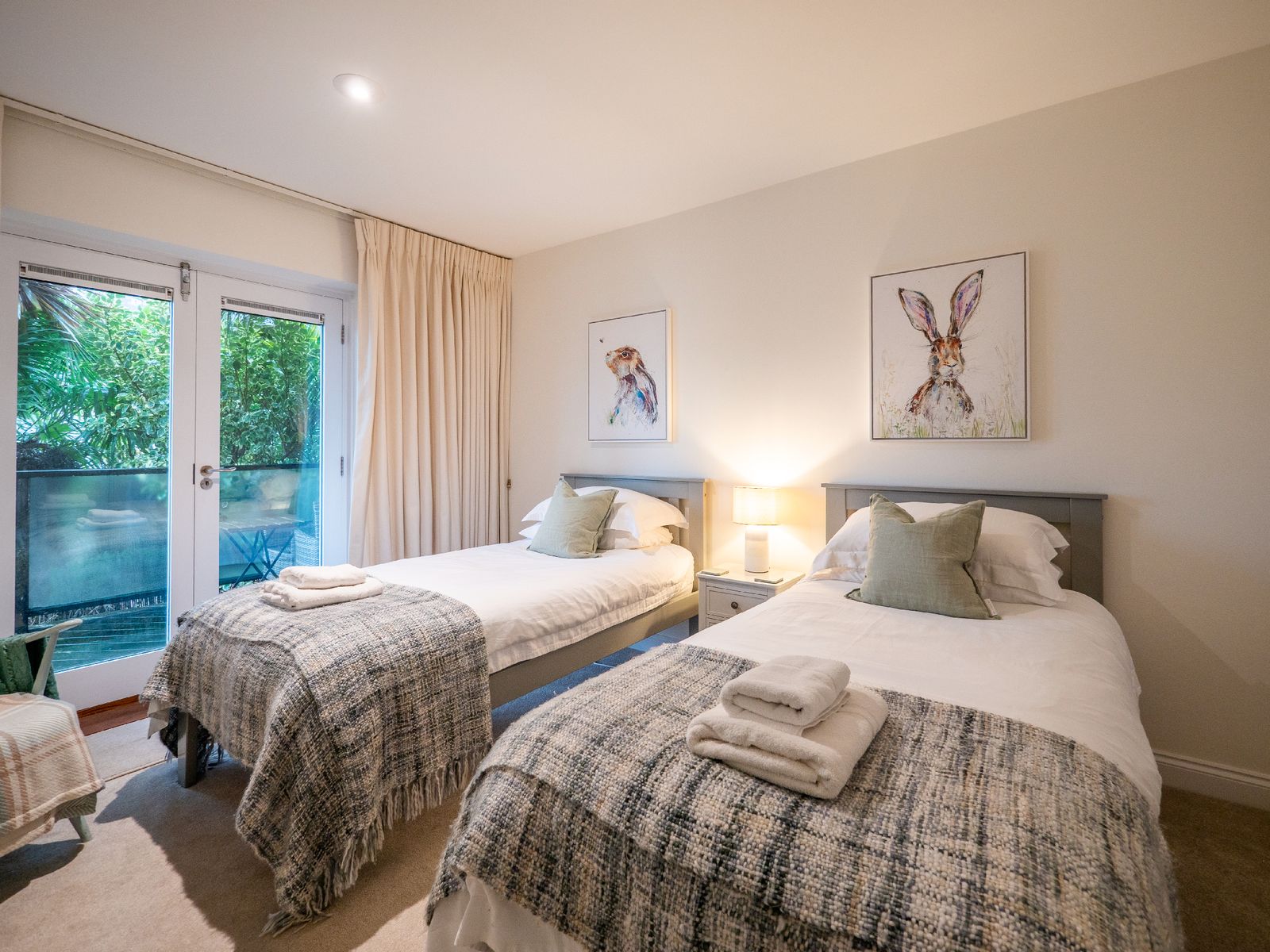 Sleeping up to six guests across three generous double bedrooms, comfort is assured. The superking room (zip-link, can be twin on request) and twin bedroom are located on the ground floor, each opening via French doors onto a balcony with steps leading to a small garden area. These rooms share a stylish family bathroom and separate cloakroom. On the top floor, the king-size suite enjoys exclusive use of a spacious shower room. All beds feature high-quality mattresses with Egyptian cotton, hotel-quality bedding, and white bath and hand towels are provided.