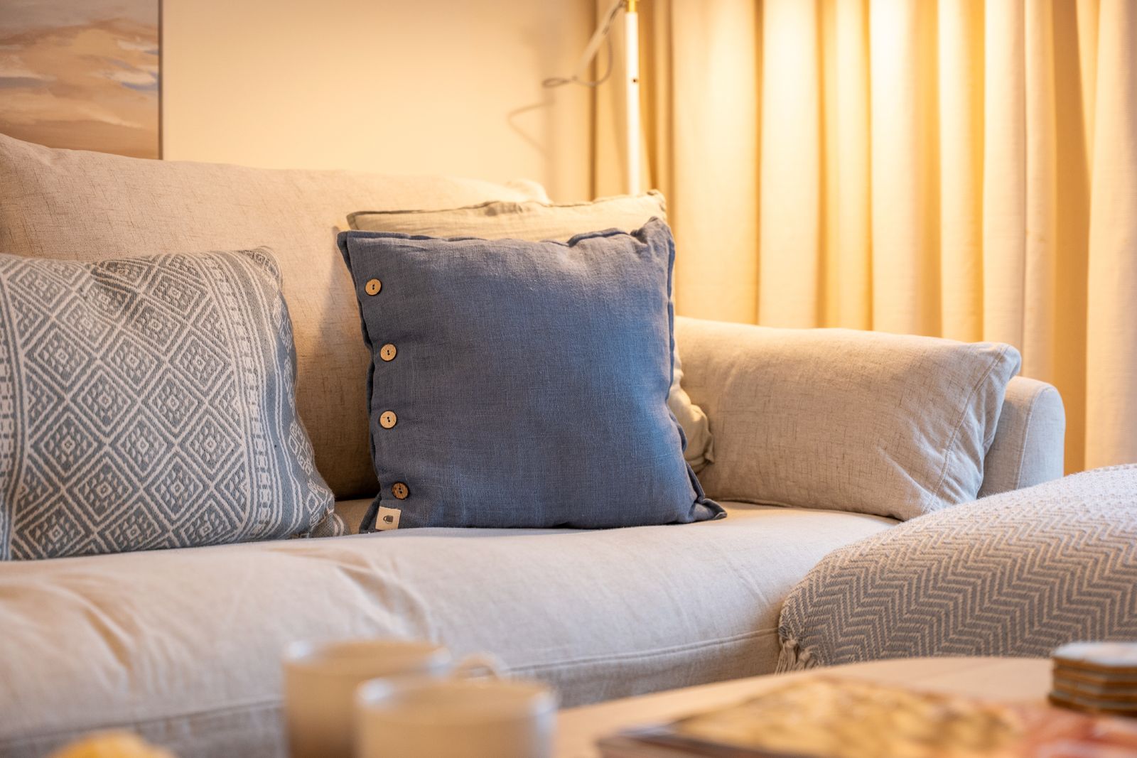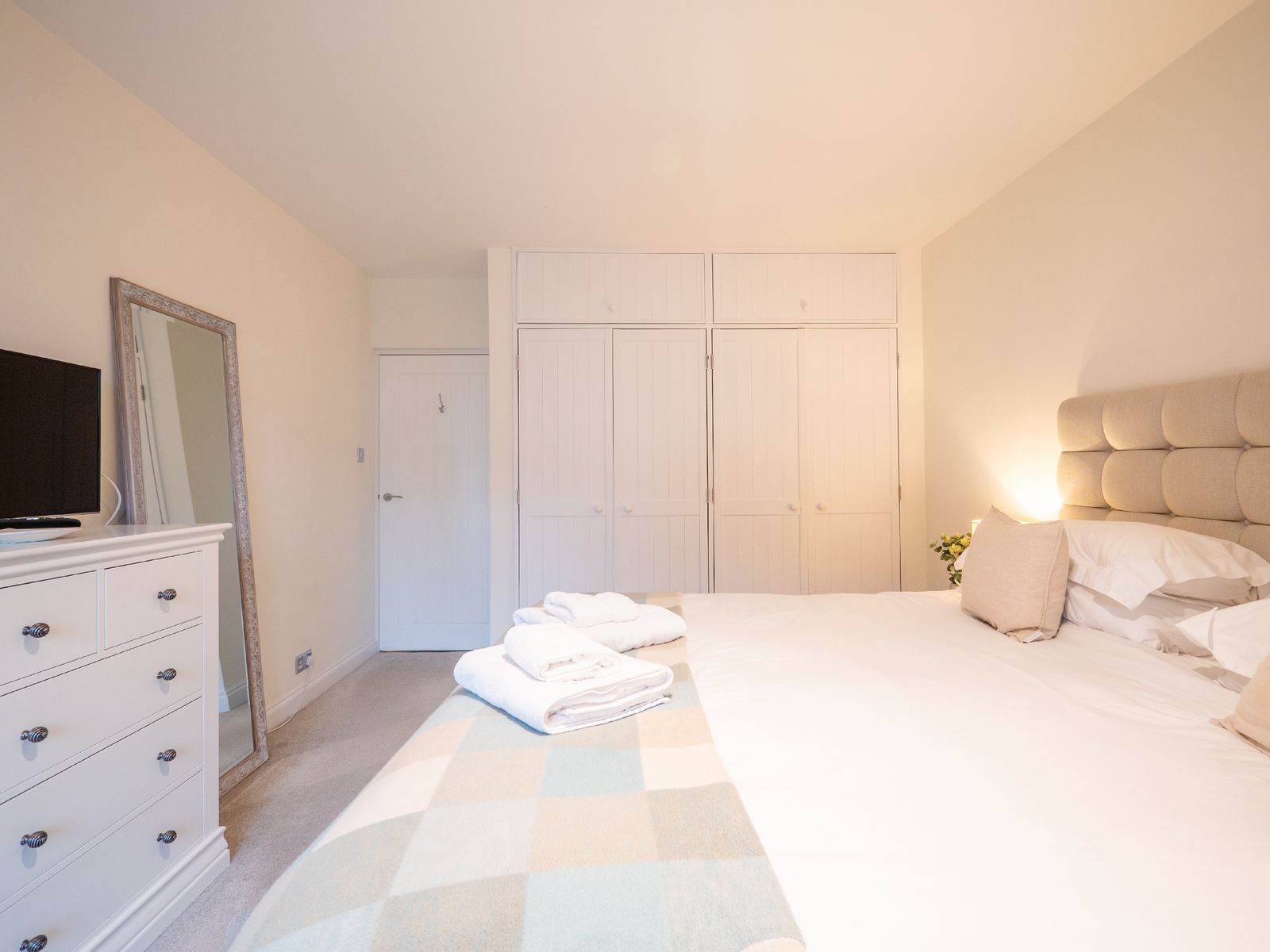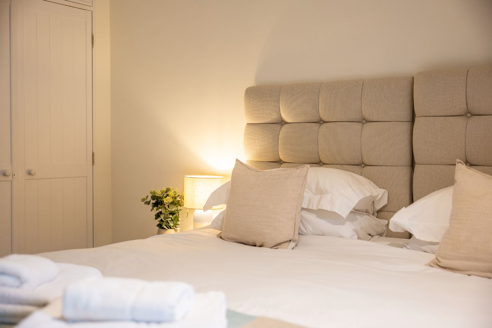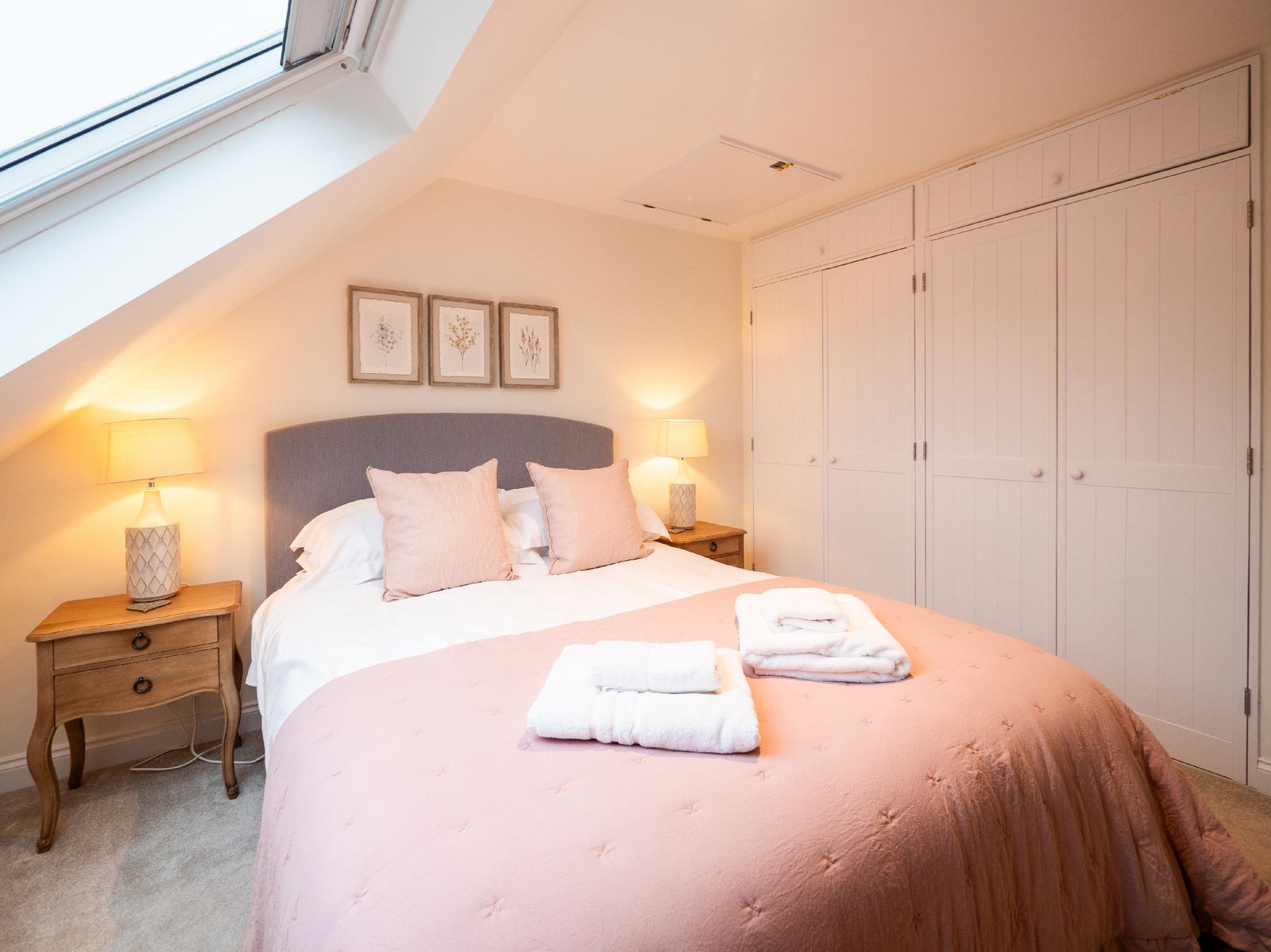 Sleeping up to six guests across three generous double bedrooms, comfort is assured. The superking room (zip-link, can be twin on request) and twin bedroom are located on the ground floor, each opening via French doors onto a balcony with steps leading to a small garden area. These rooms share a stylish family bathroom and separate cloakroom. On the top floor, the king-size suite enjoys exclusive use of a spacious shower room. All beds feature high-quality mattresses with Egyptian cotton, hotel-quality bedding, and white bath and hand towels are provided.