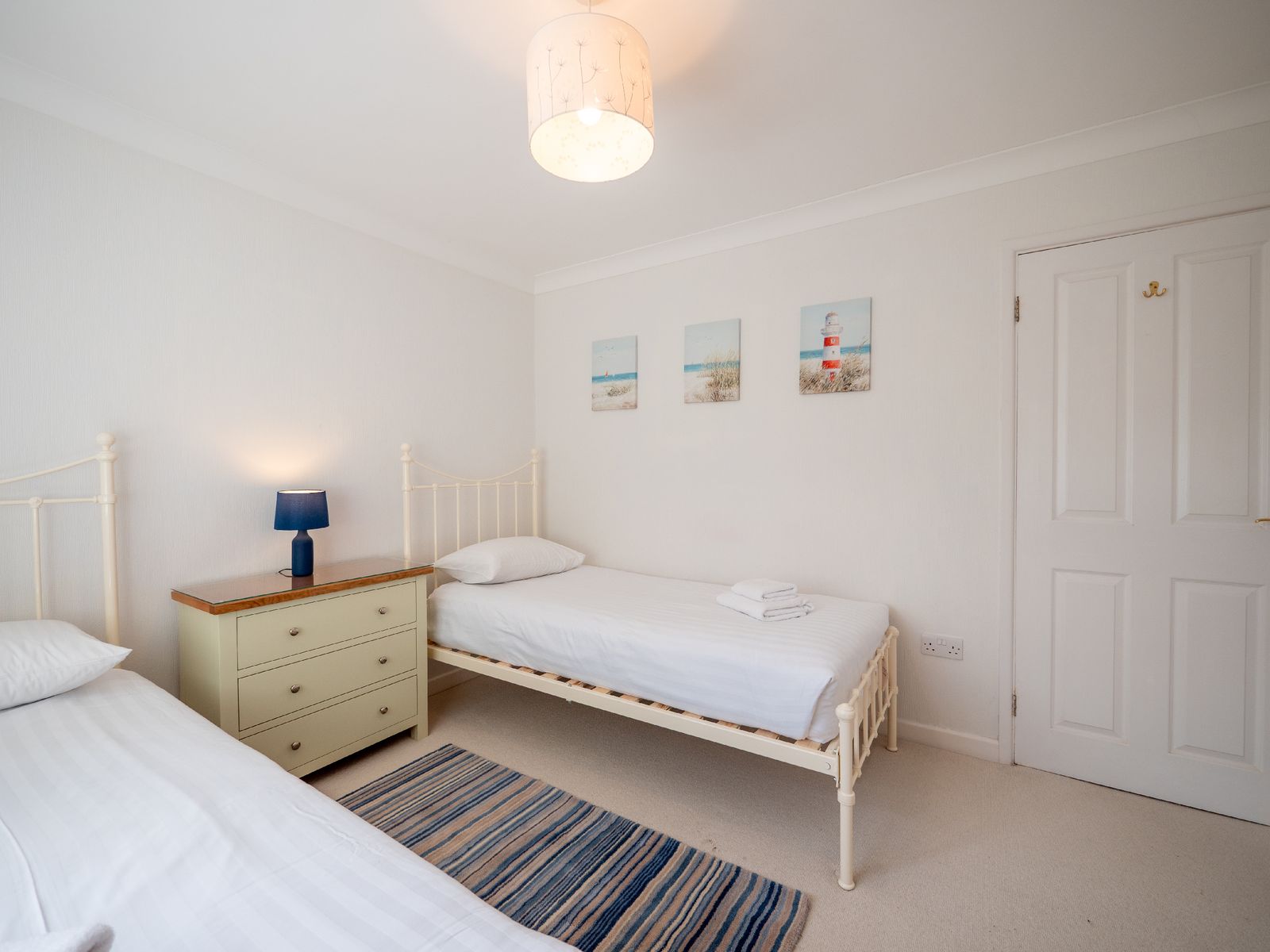 The family bathroom, positioned conveniently between the bedrooms, features a spacious walk-in shower, perfect for refreshing after beach days or long coastal walks. A second bathroom located in the separate utility room adds extra convenience during your stay.