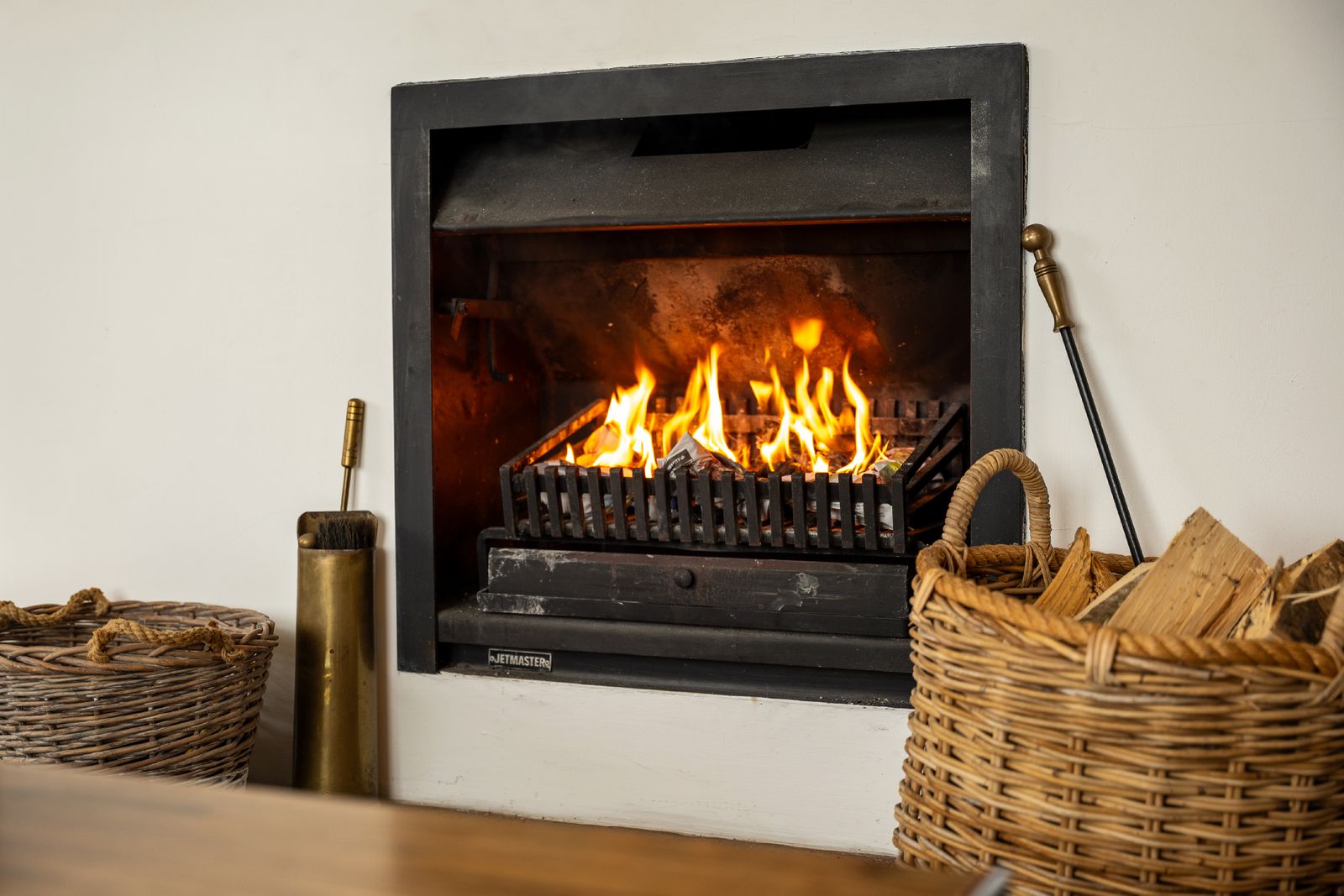 At the heart of the home is a large, sociable country-style kitchen with dining table, leather sofa and TV. Sliding doors open directly onto the terrace, creating a perfect space for shared meals, relaxed mornings and sunny afternoons. In the evenings, retreat to the cosy sitting room, where a glowing open fire and glass terrace doors create a warm, welcoming atmosphere.