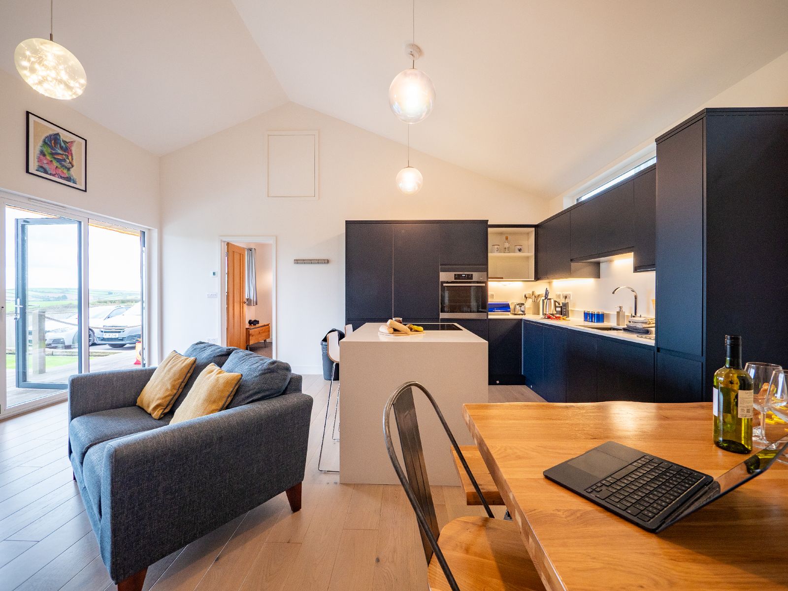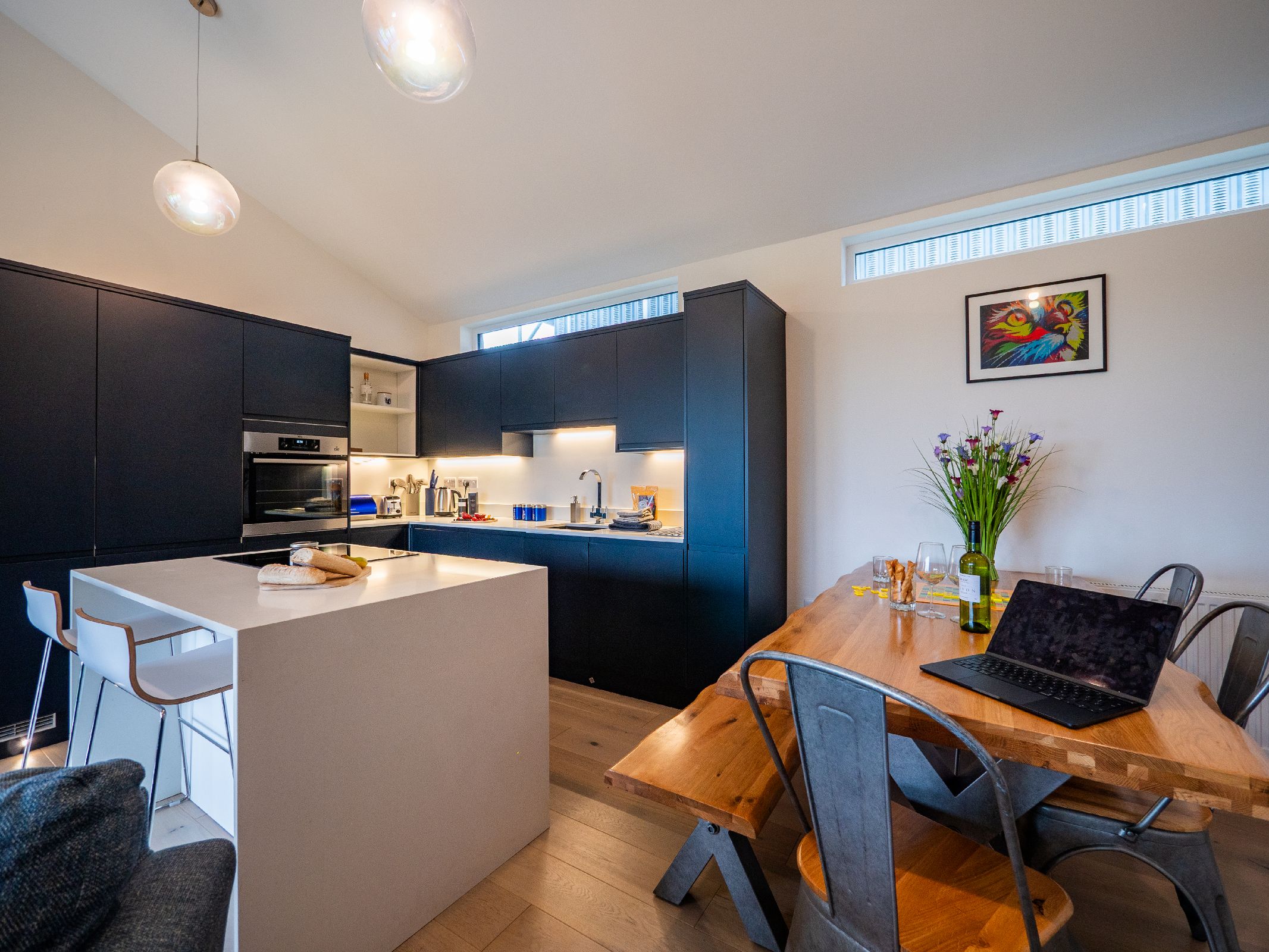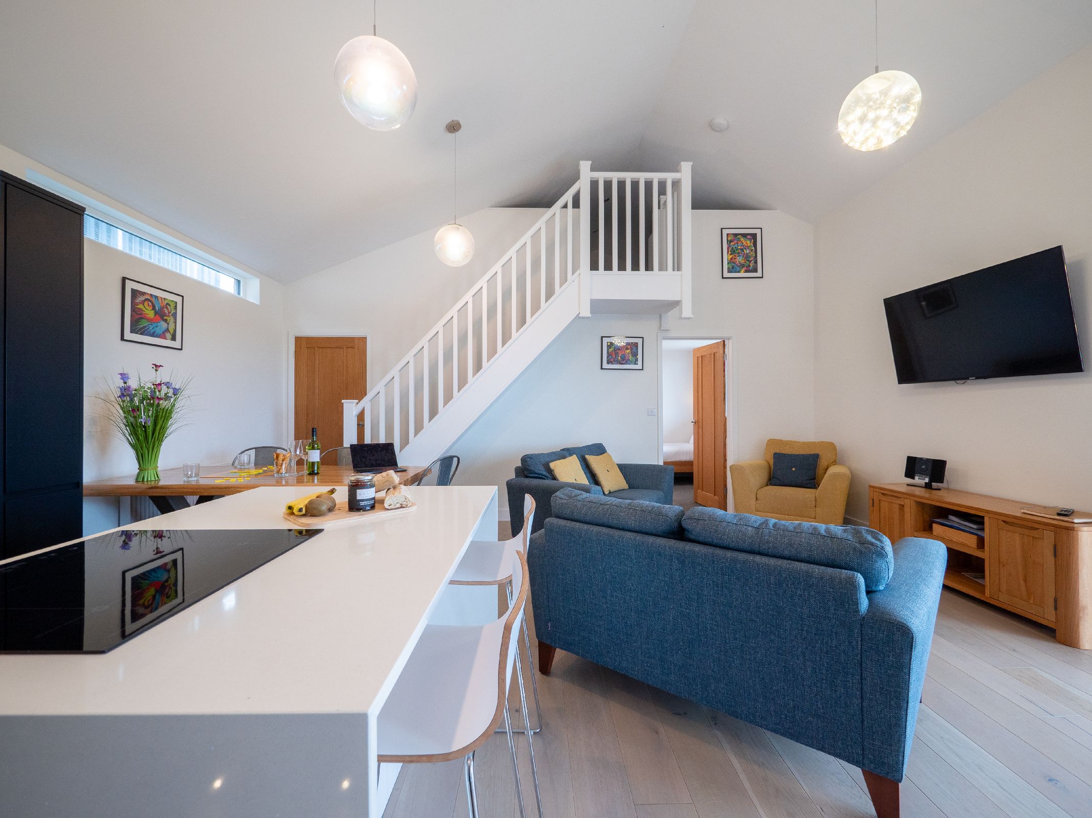 Step inside and you’ll find an expansive open-plan living area with vaulted ceilings and warm, natural finishes. The contemporary kitchen is a highlight, featuring quartz countertops, a central island, and top of the range appliances, ideal for anything from a celebratory dinner to a relaxed morning brunch. The lounge area offers cosy sofas, oak furnishings, a wall-mounted Smart TV, and striking LED globe lighting, creating an inviting and modern yet rustic atmosphere.