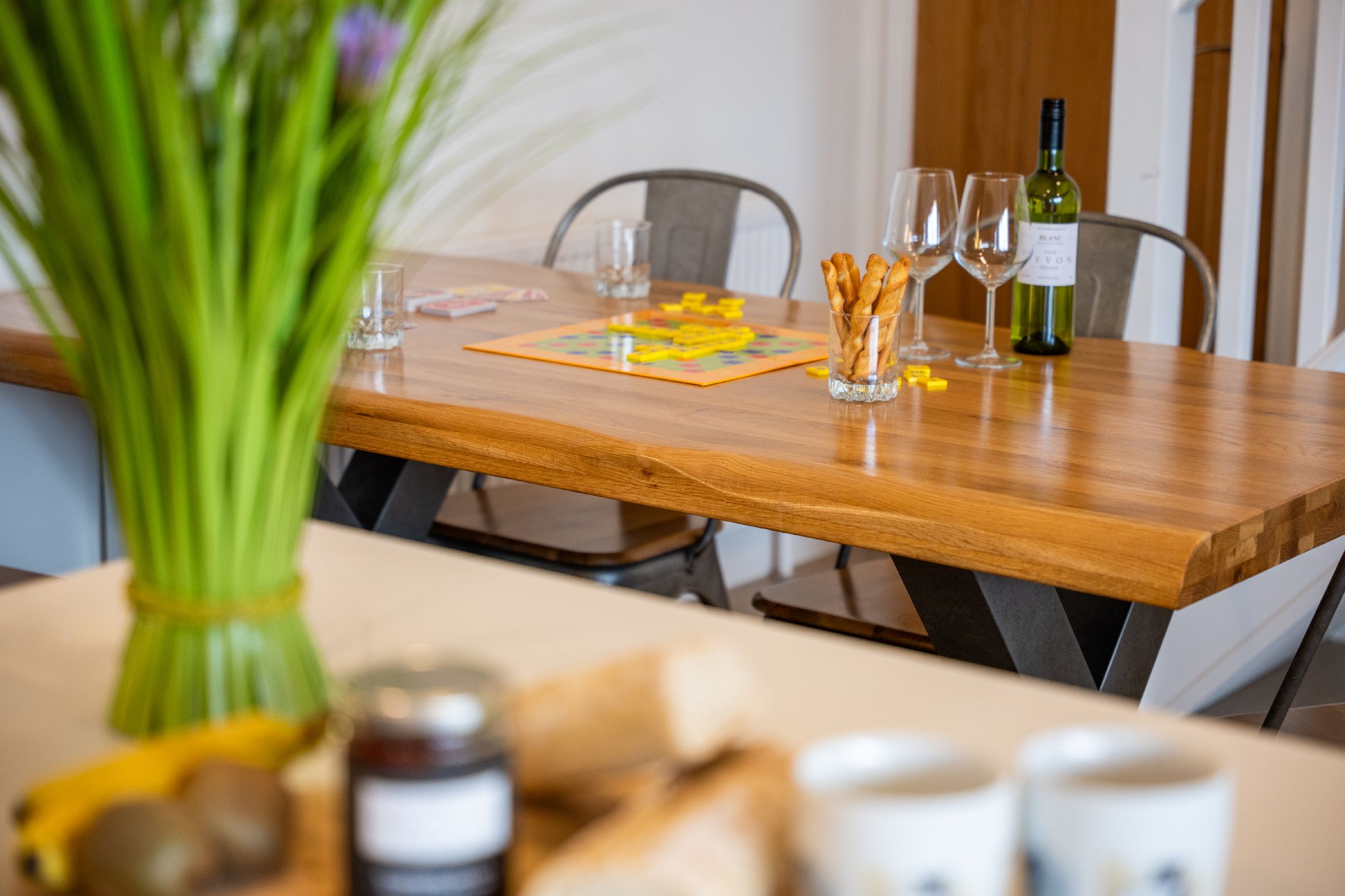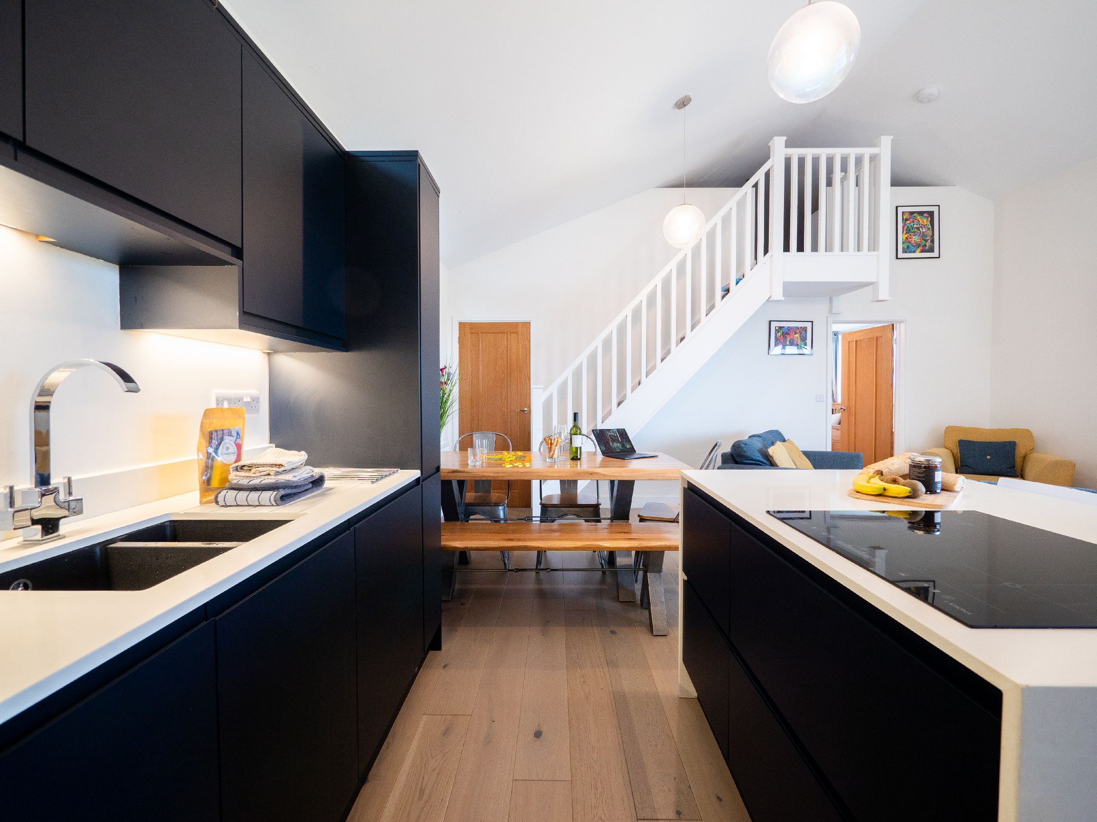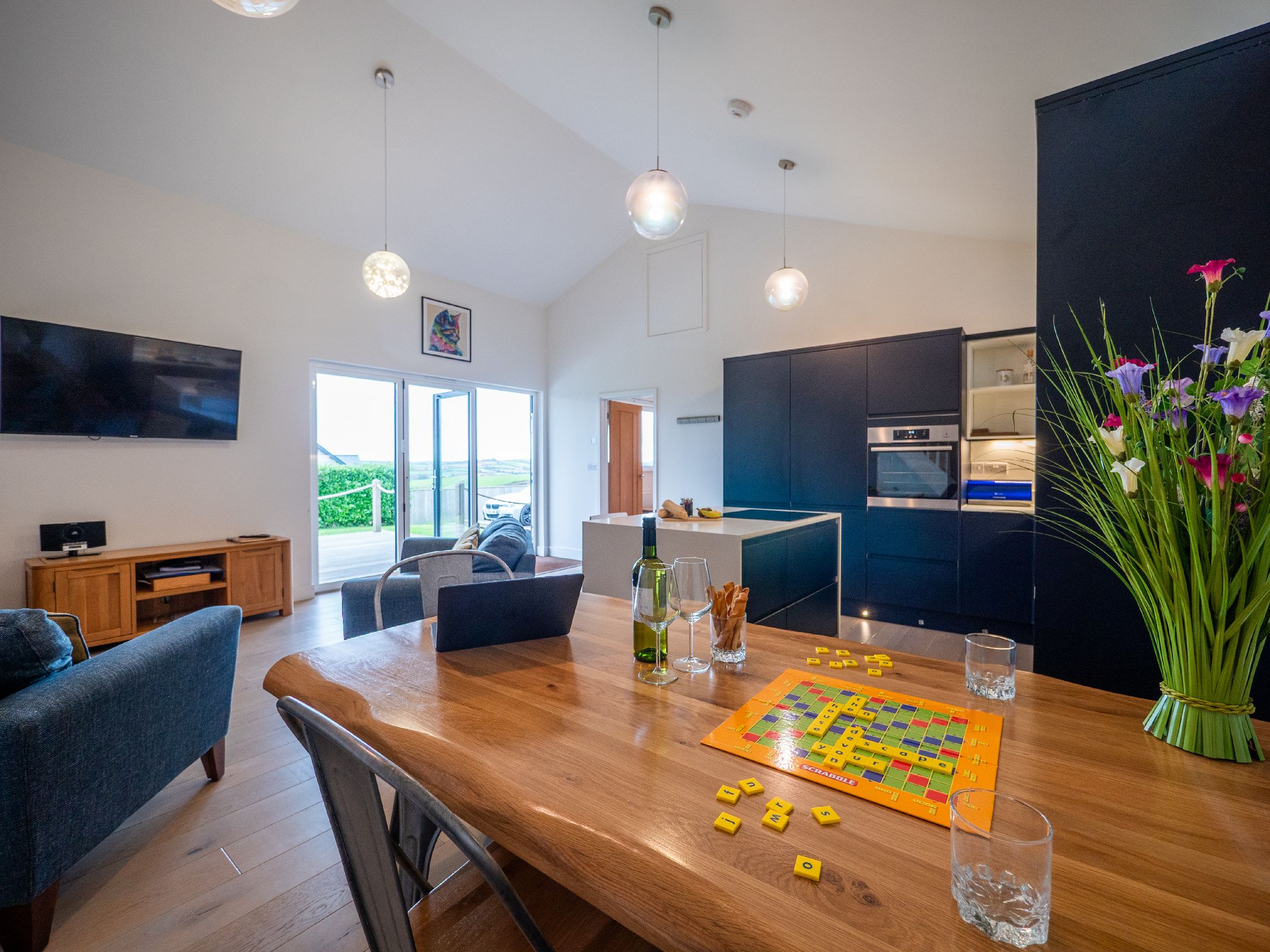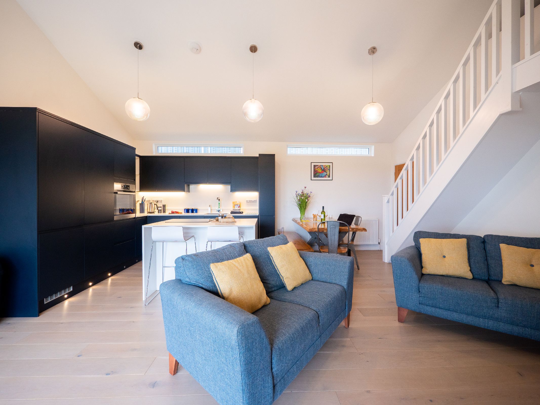 Step inside and you’ll find an expansive open-plan living area with vaulted ceilings and warm, natural finishes. The contemporary kitchen is a highlight, featuring quartz countertops, a central island, and top of the range appliances, ideal for anything from a celebratory dinner to a relaxed morning brunch. The lounge area offers cosy sofas, oak furnishings, a wall-mounted Smart TV, and striking LED globe lighting, creating an inviting and modern yet rustic atmosphere.