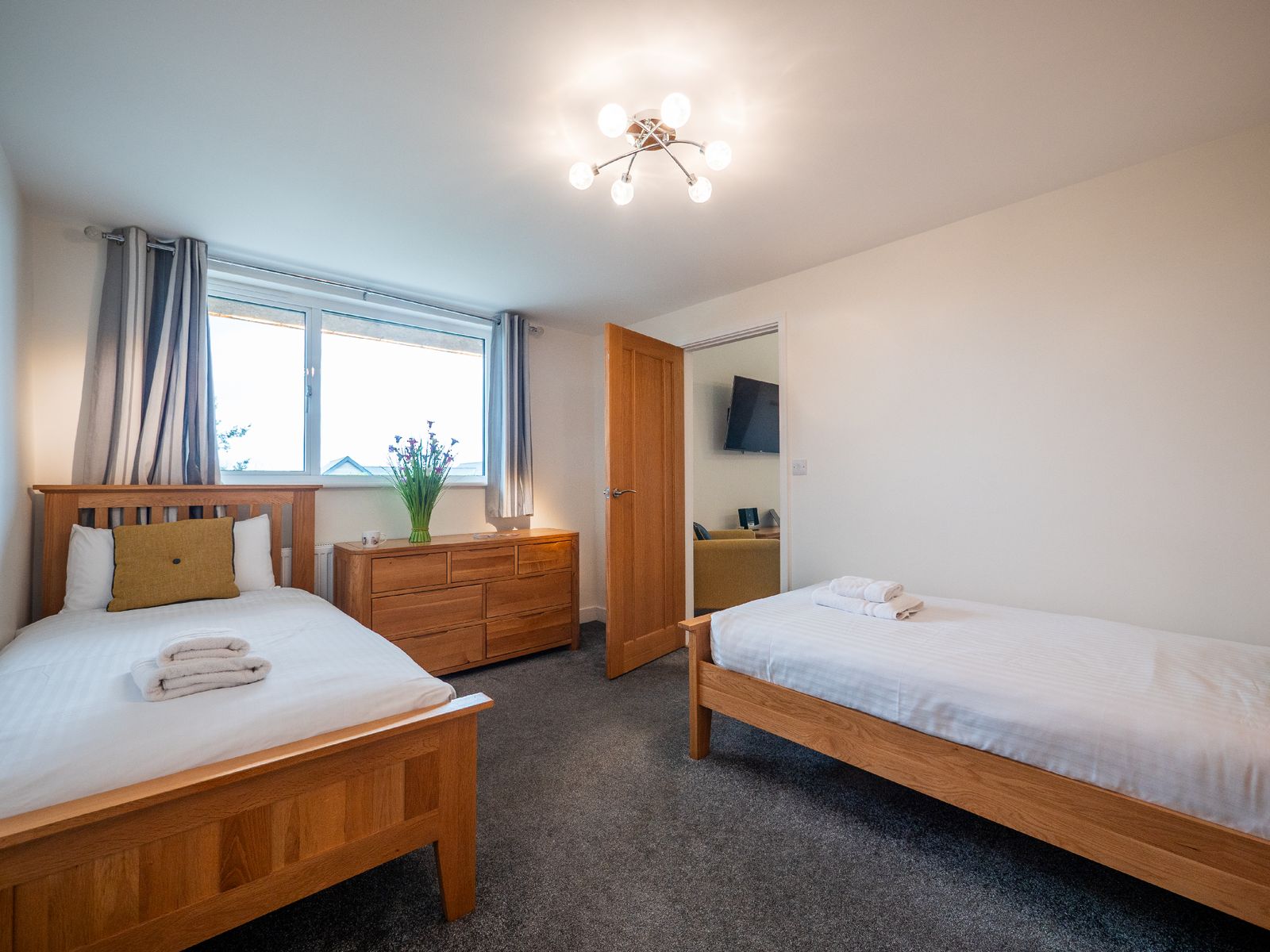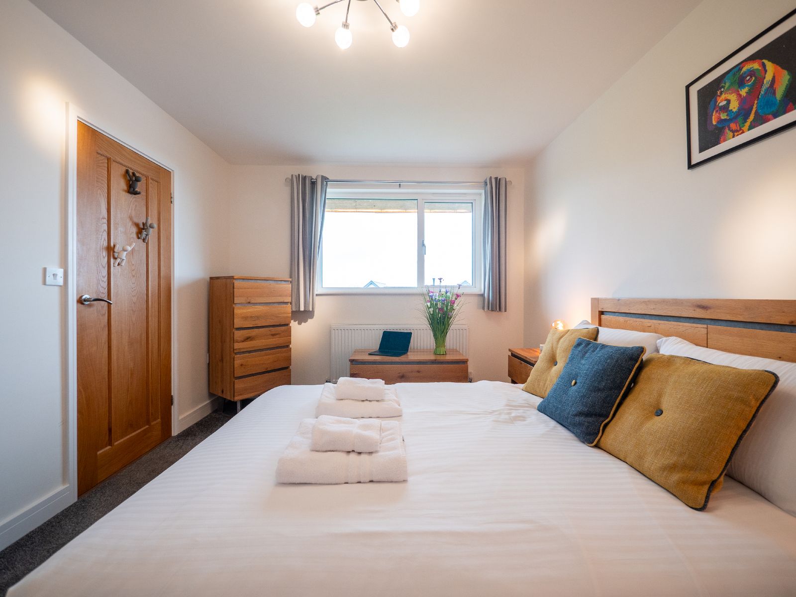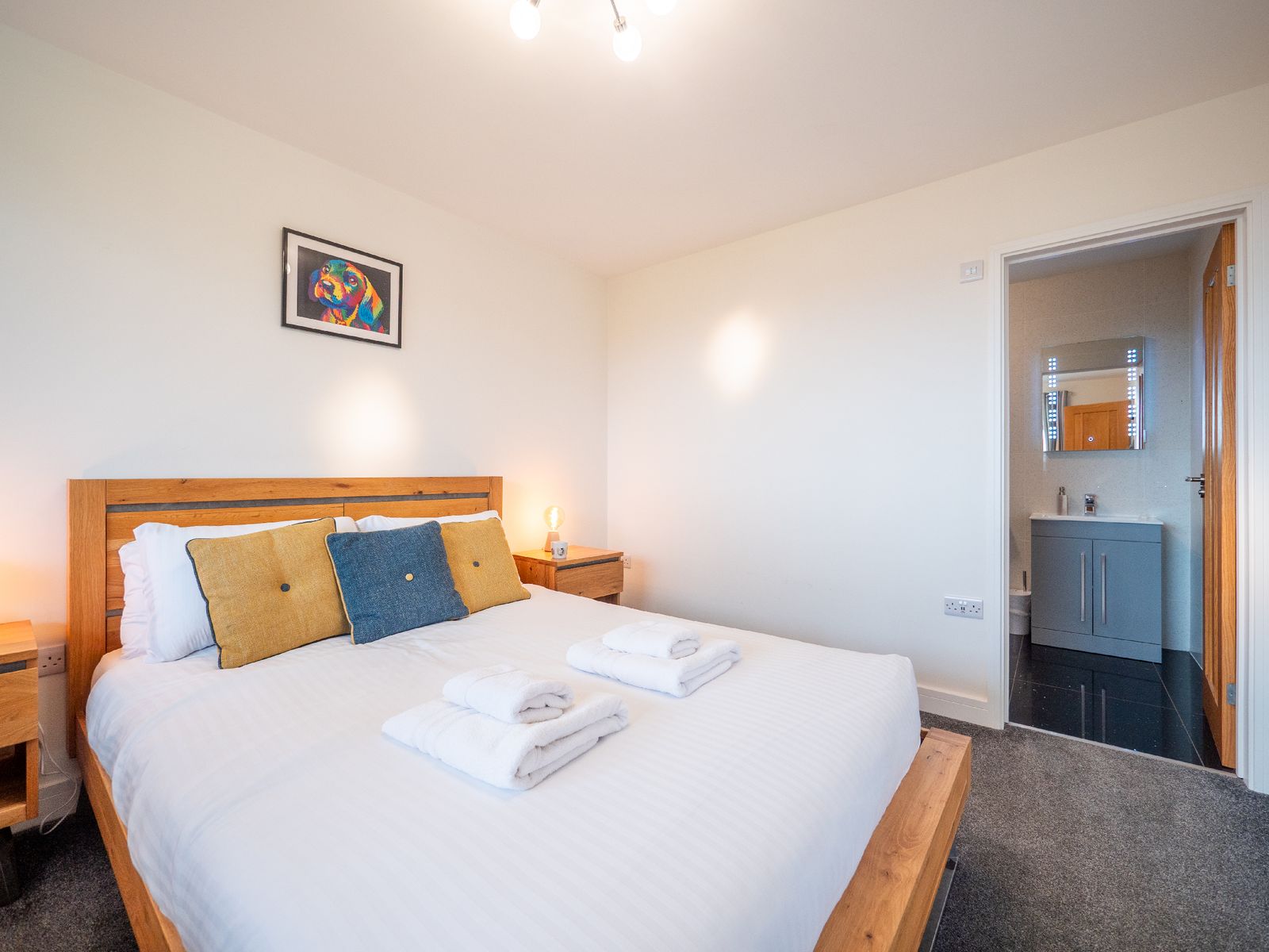 The cabin features two generously sized bedrooms: one with a king-sized bed and ensuite shower bath, and the other a stylish twin room with its own ensuite shower room. Both bathrooms are finished to a high standard with floor to ceiling quartz tiling, powerful showers, heated towel rails, and LED lit mirrors for that extra touch of luxury.