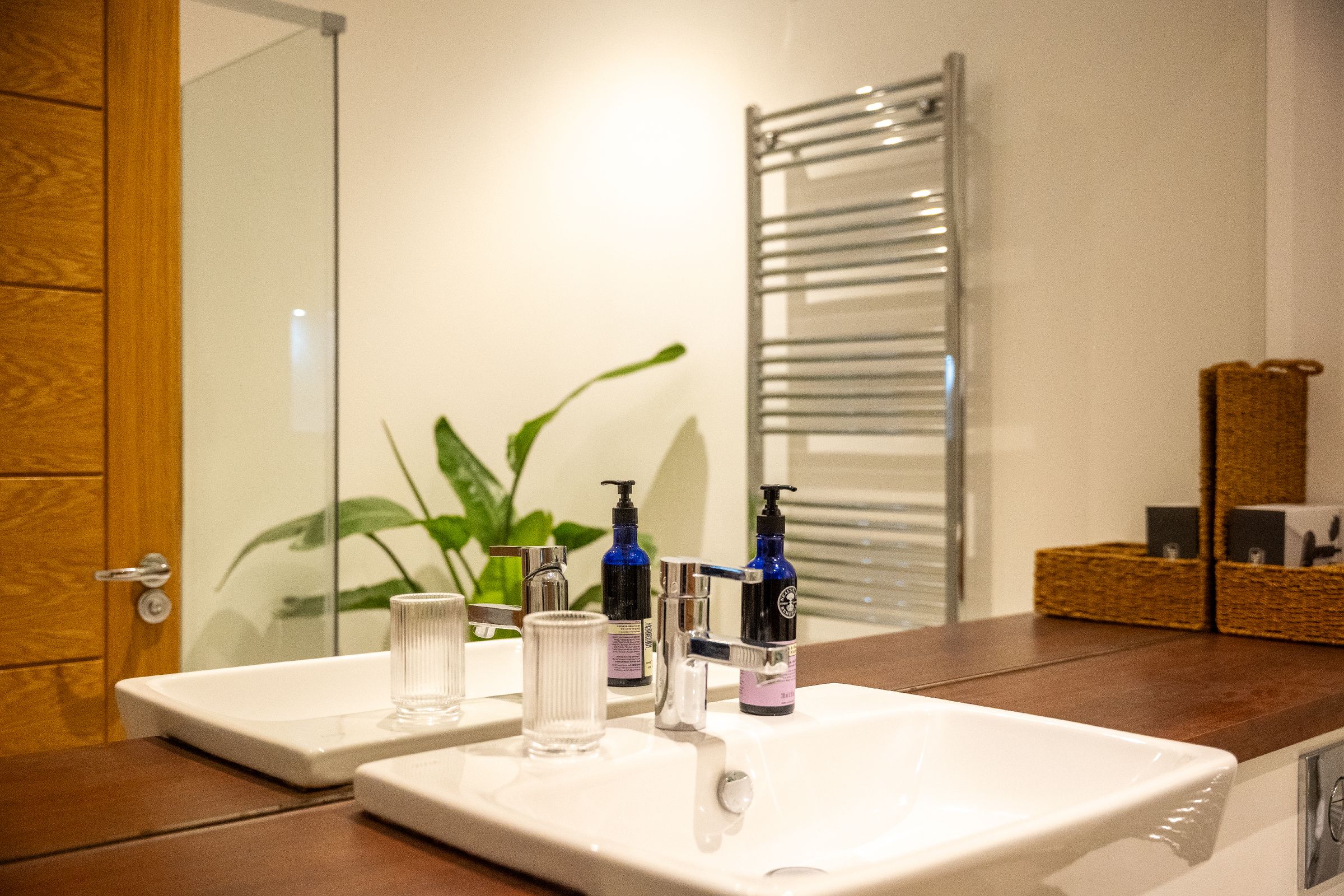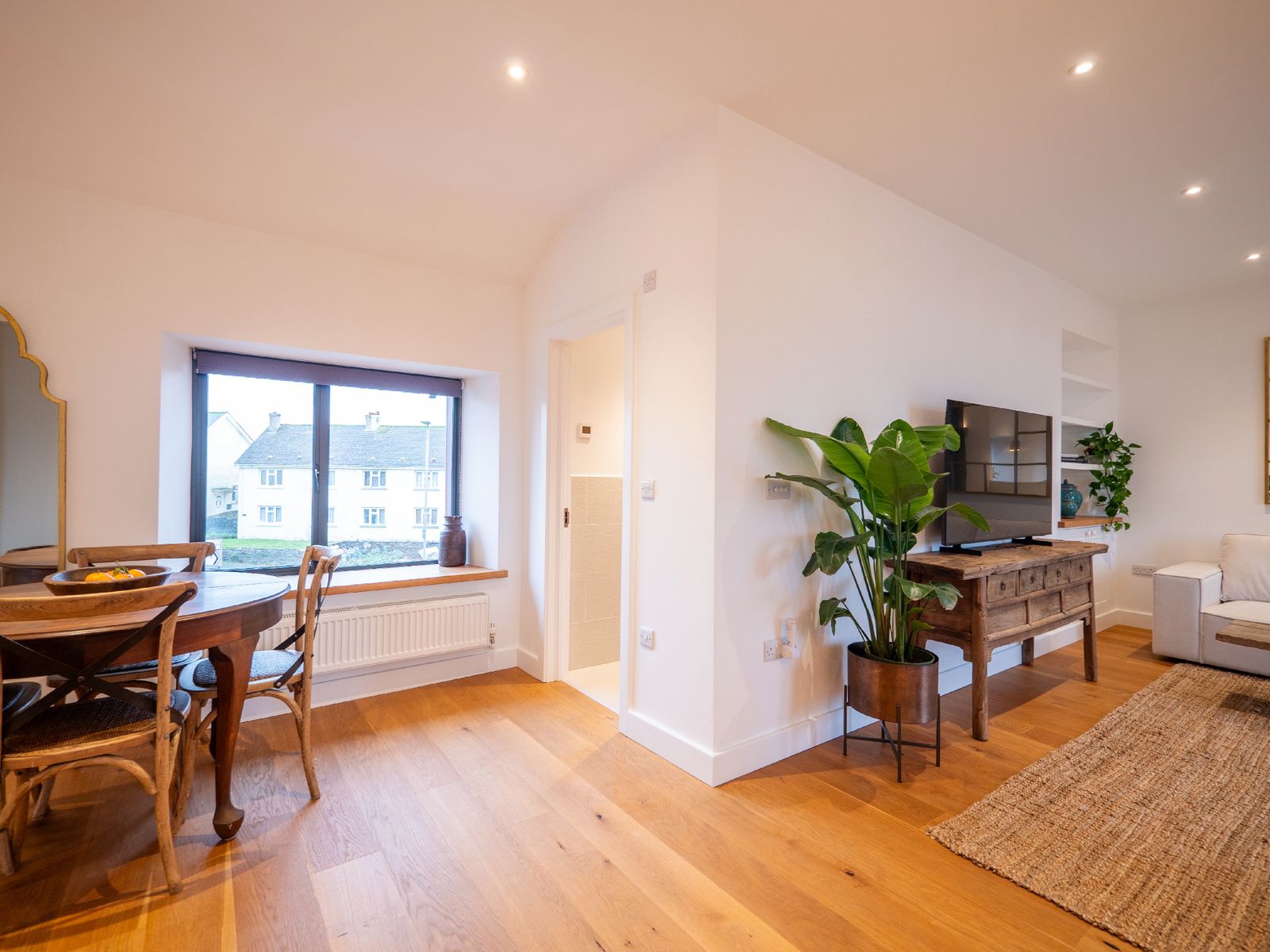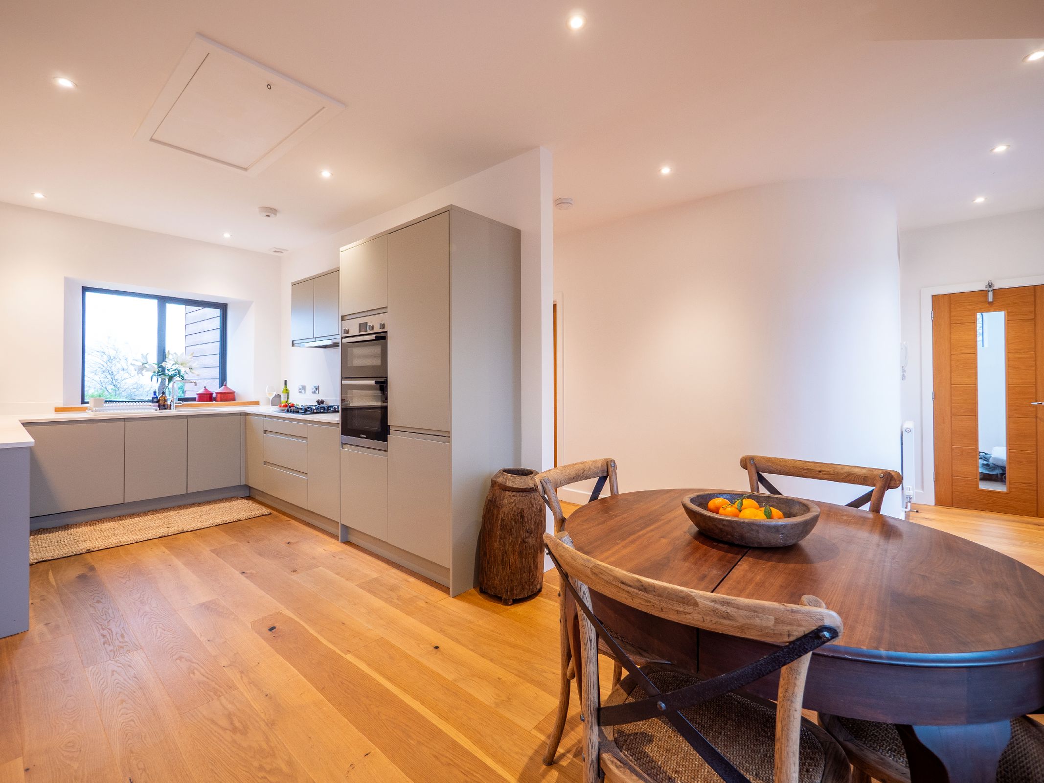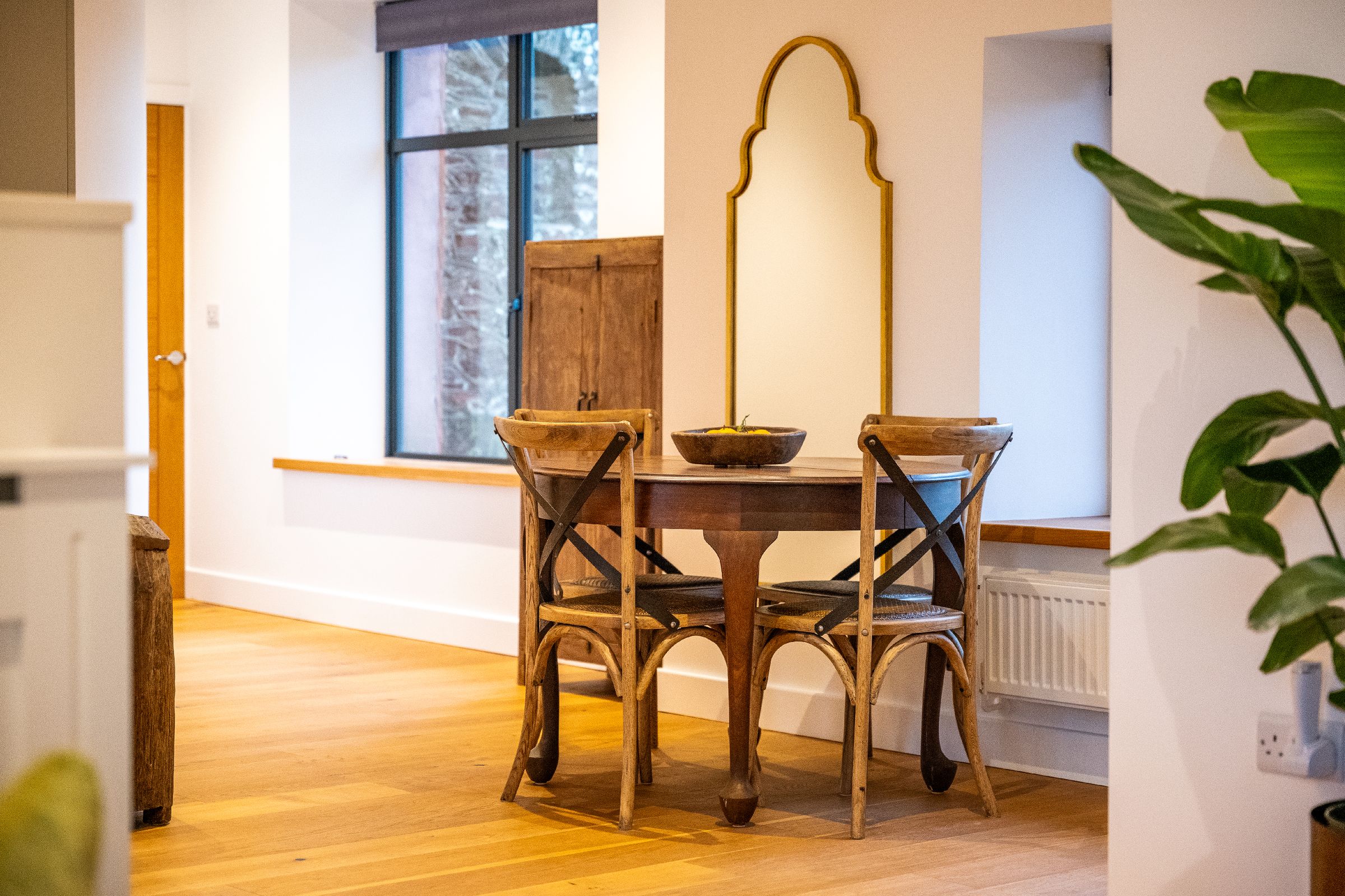 The contemporary kitchen is centrally placed making it convenient to entertain from. It comes fully equipped with everything you might need, including an electric oven, gas hob, large fridge-freezer and a bean-to-cup coffee machine, making holiday meals a pleasure to prepare. The adjoining dining area, with a table for four, offers a cosy spot to share stories over a relaxed meal.