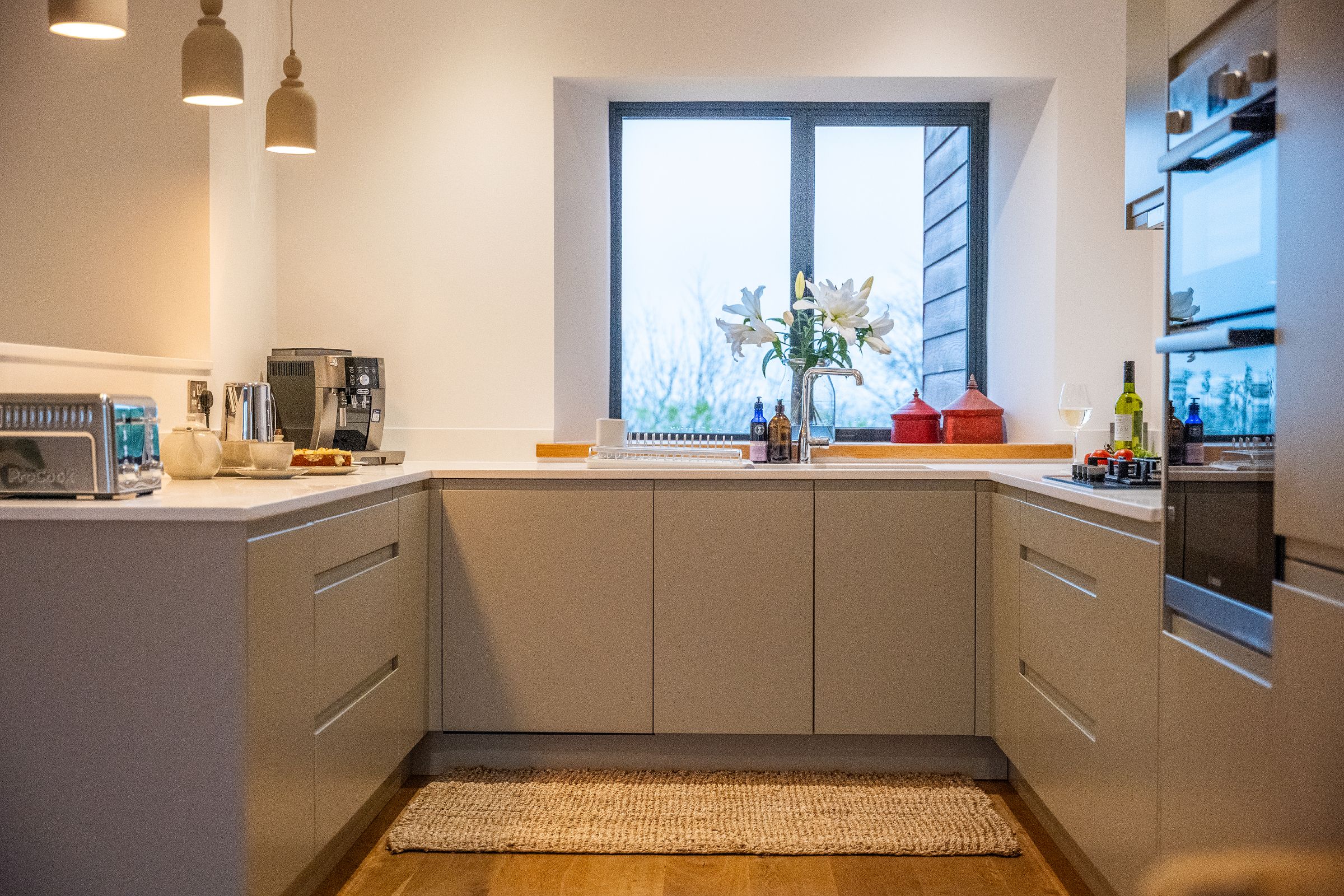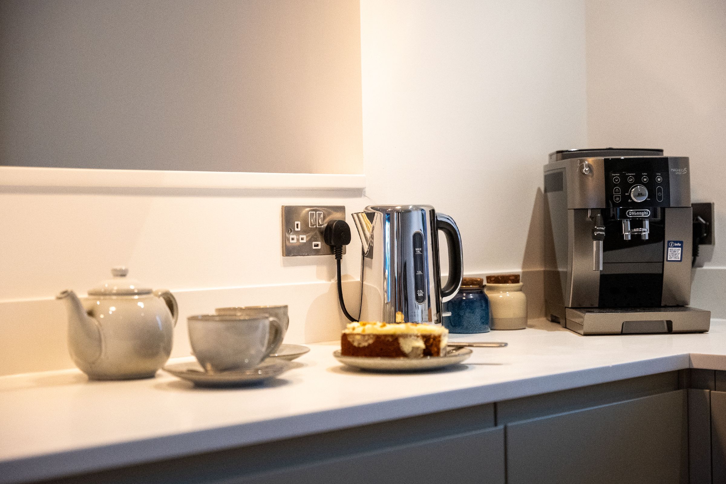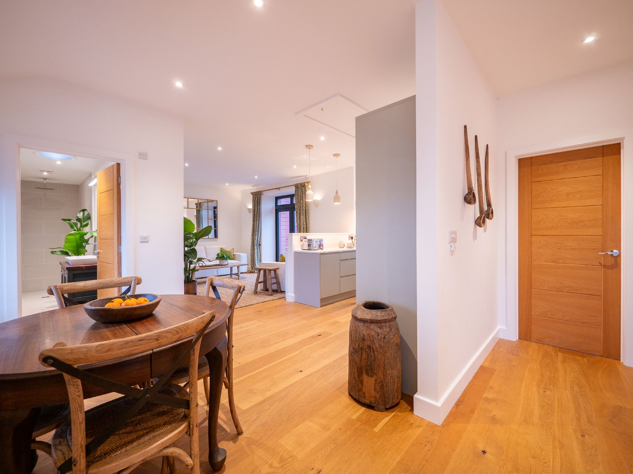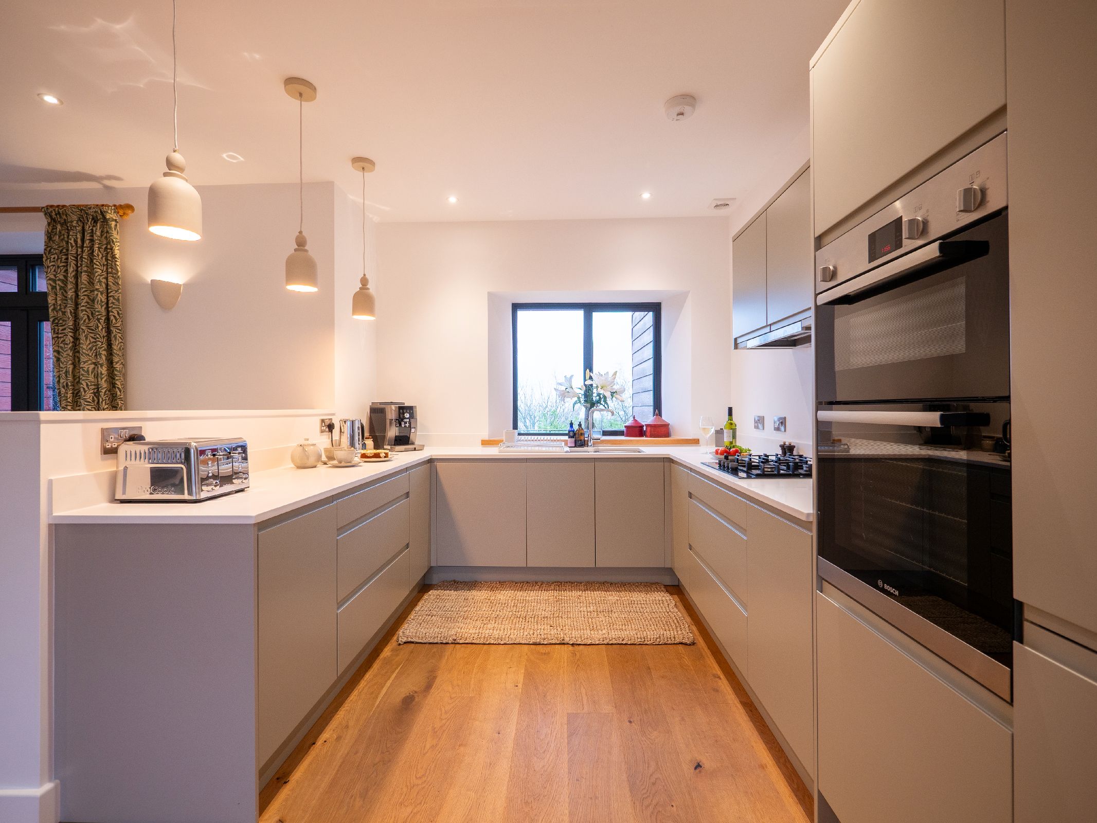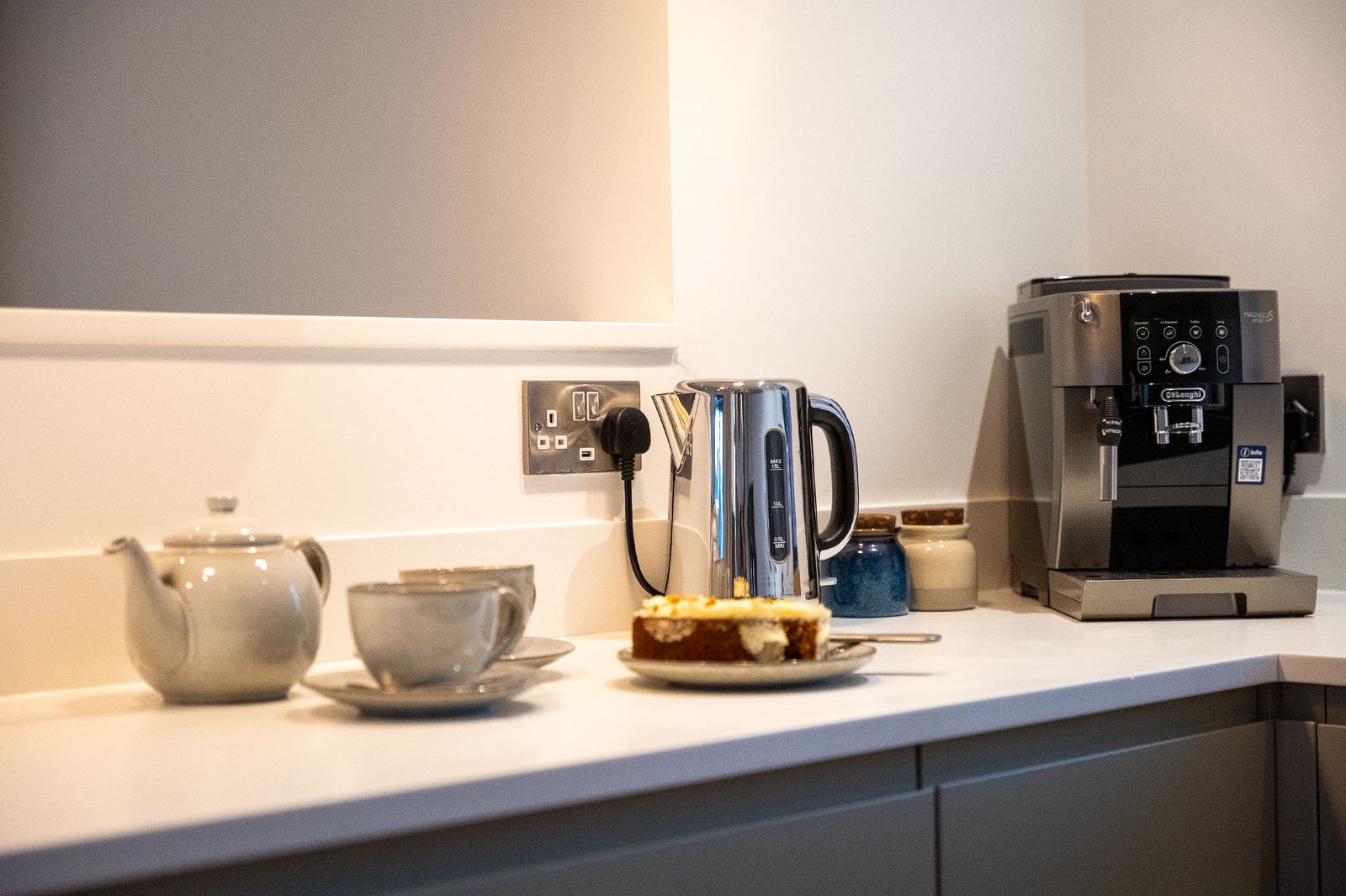 The contemporary kitchen is centrally placed making it convenient to entertain from. It comes fully equipped with everything you might need, including an electric oven, gas hob, large fridge-freezer and a bean-to-cup coffee machine, making holiday meals a pleasure to prepare. The adjoining dining area, with a table for four, offers a cosy spot to share stories over a relaxed meal.