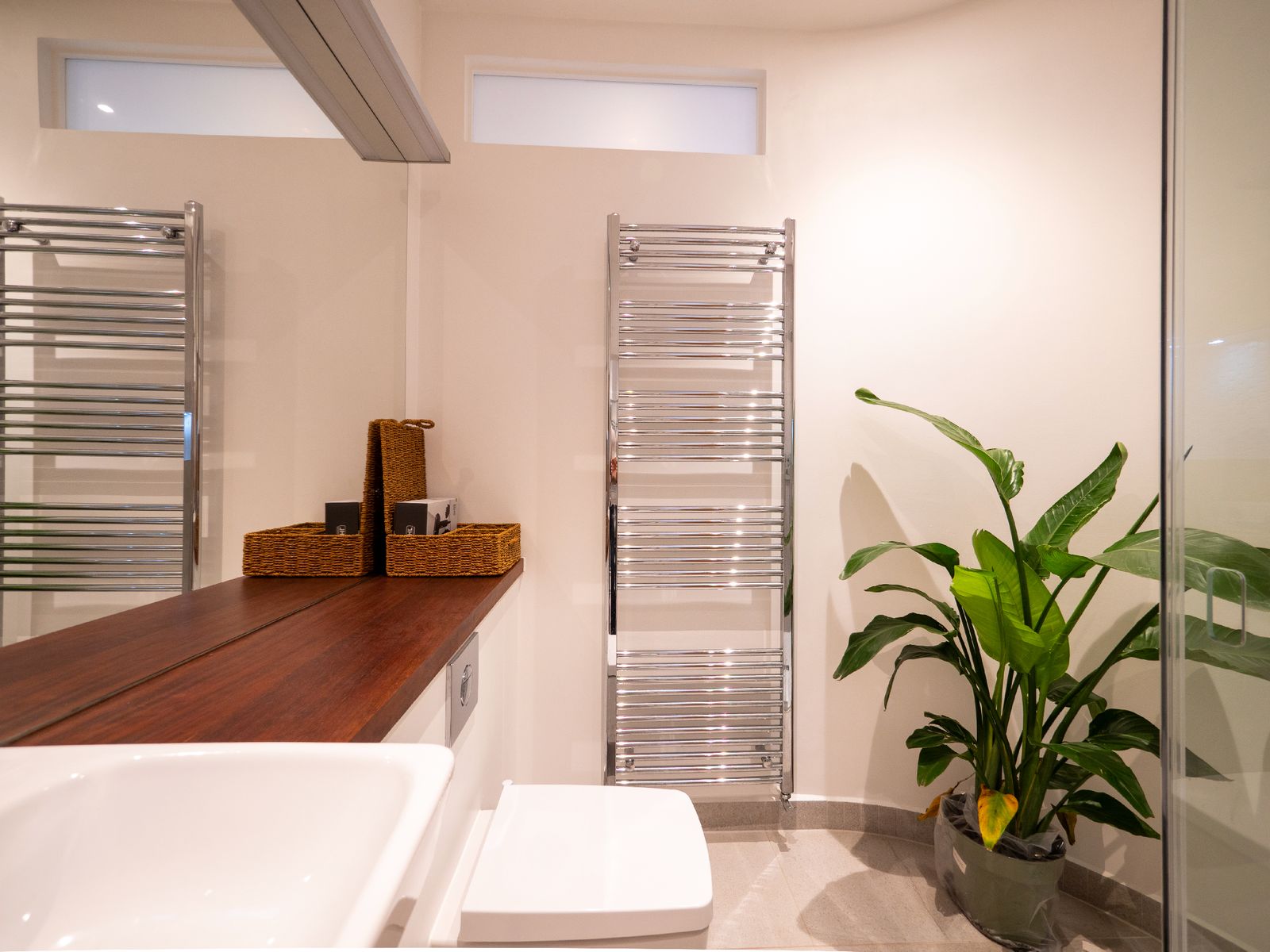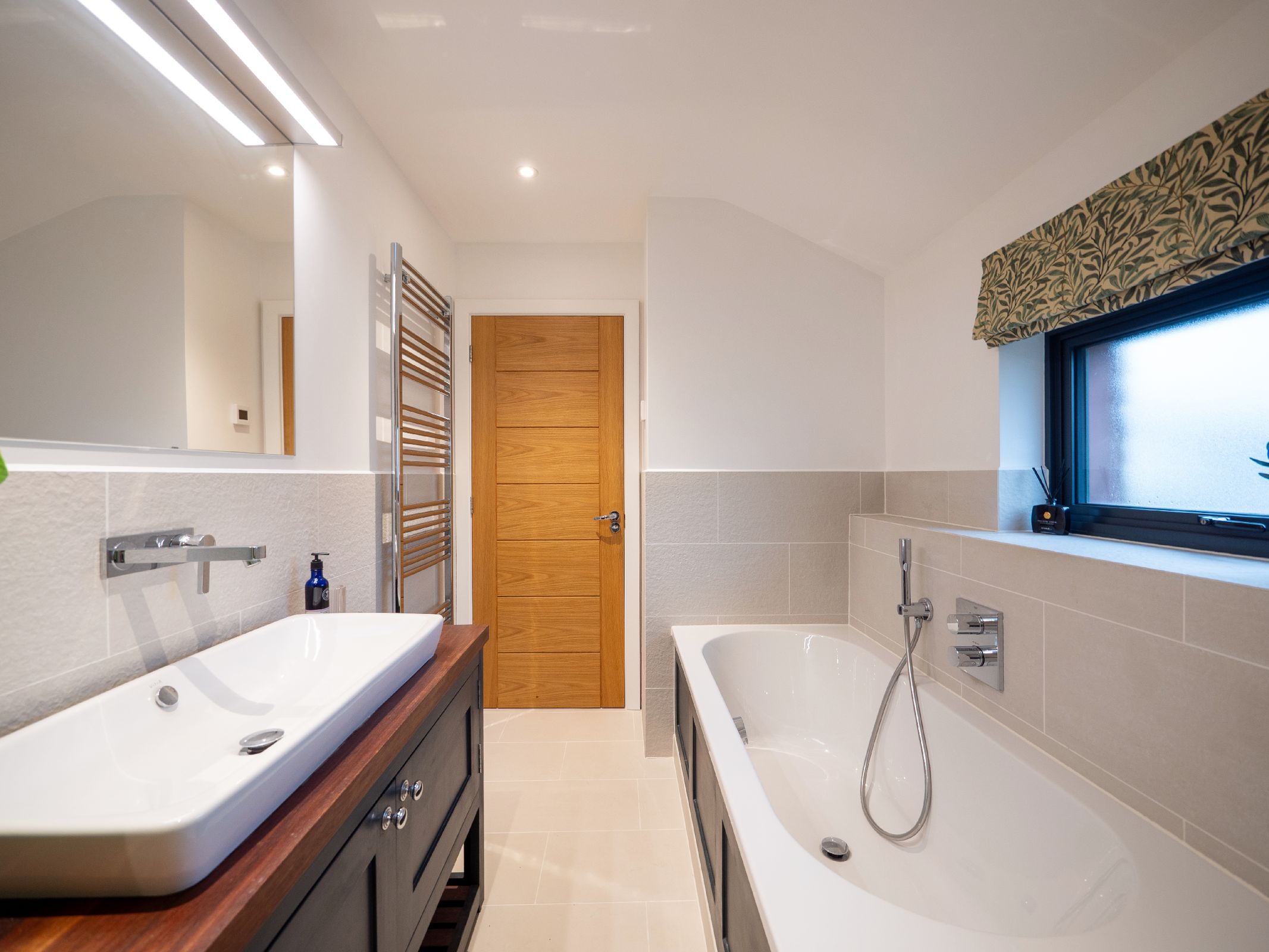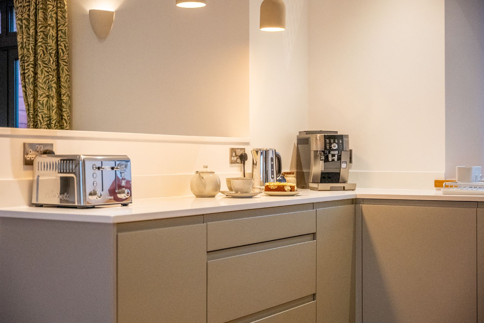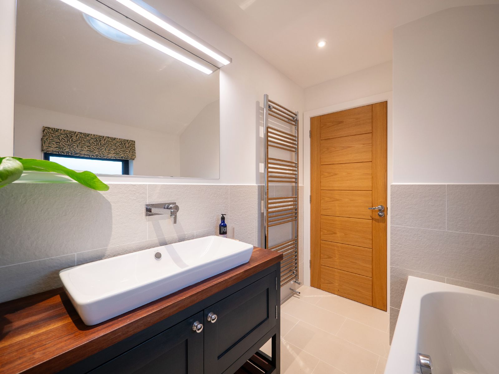 The contemporary kitchen is centrally placed making it convenient to entertain from. It comes fully equipped with everything you might need, including an electric oven, gas hob, large fridge-freezer and a bean-to-cup coffee machine, making holiday meals a pleasure to prepare. The adjoining dining area, with a table for four, offers a cosy spot to share stories over a relaxed meal.
