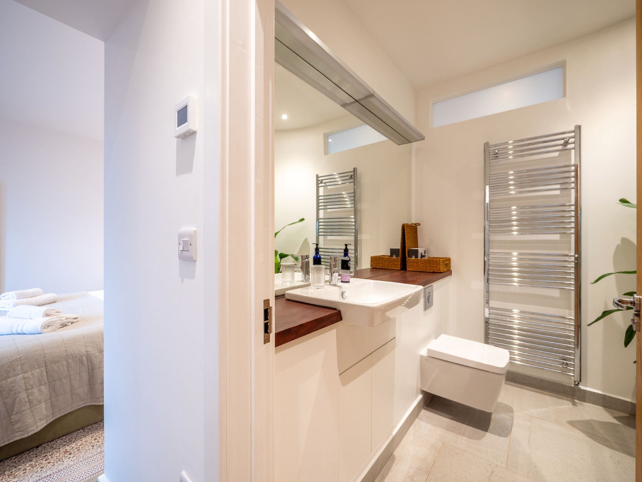 The apartment offers two beautifully presented bedrooms: one with a king-size bed, and a serene super-king master suite complete with its own modern ensuite. The master bedroom also benefits from a private balcony furnished with a bistro table and chairs, perfect for slow starts and tranquil moments overlooking the surroundings. A centrally positioned second stylish bathroom completes the layout.