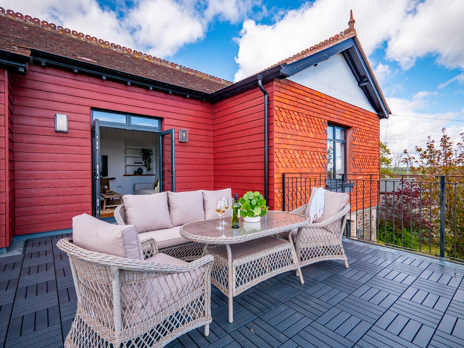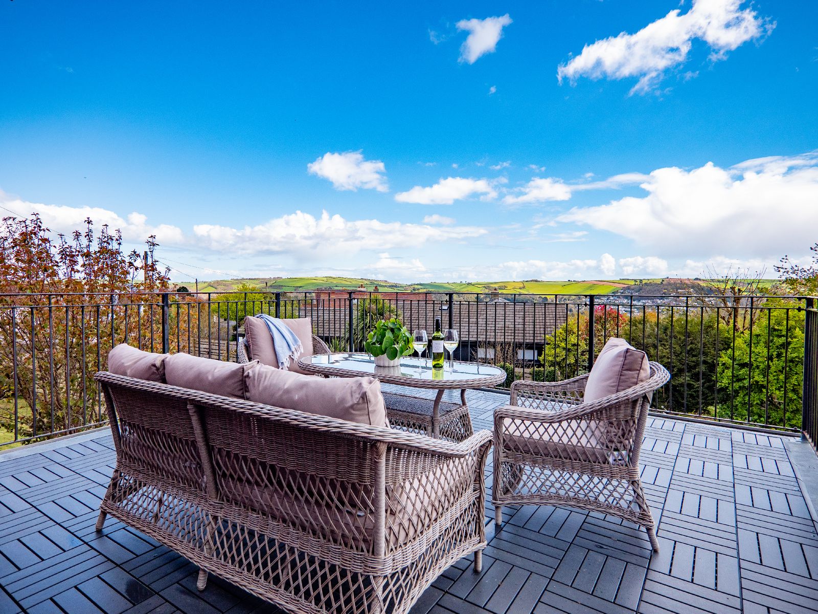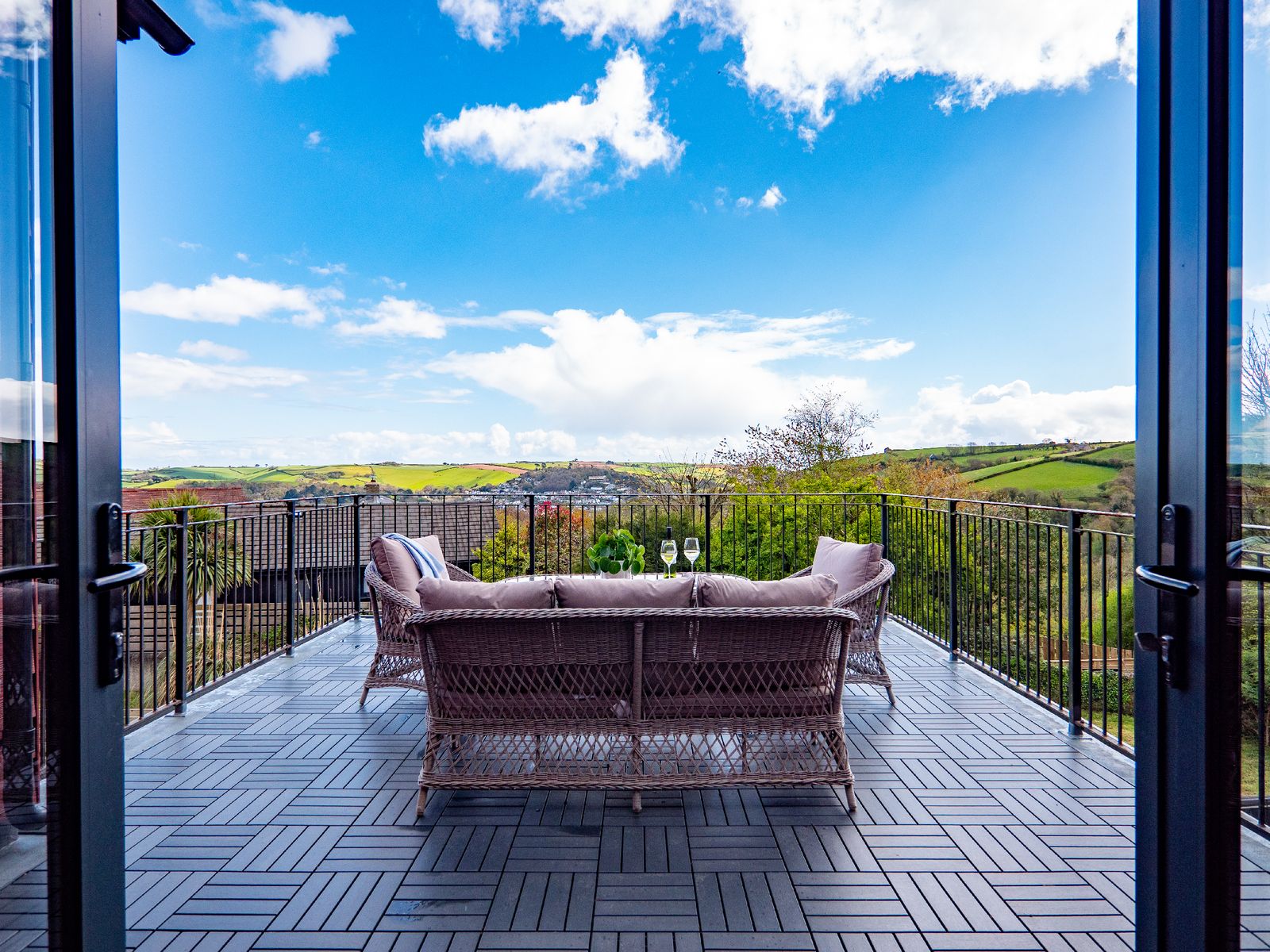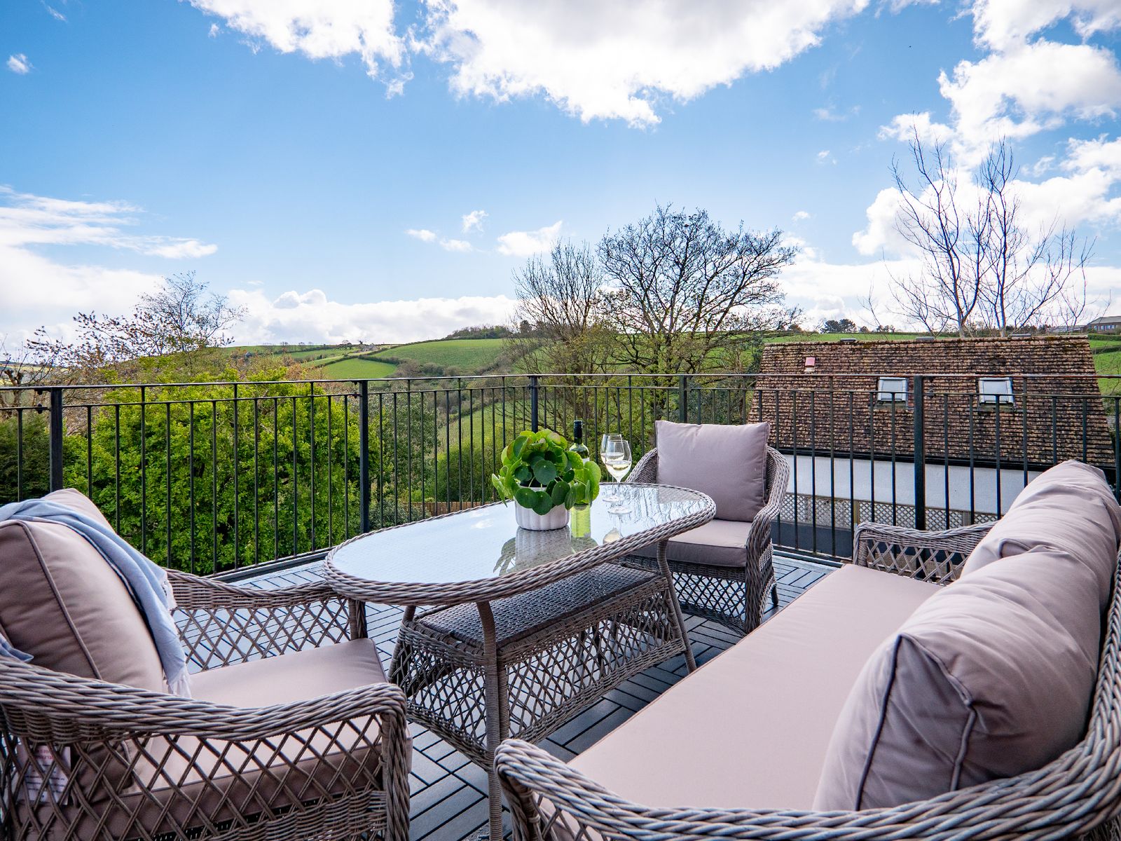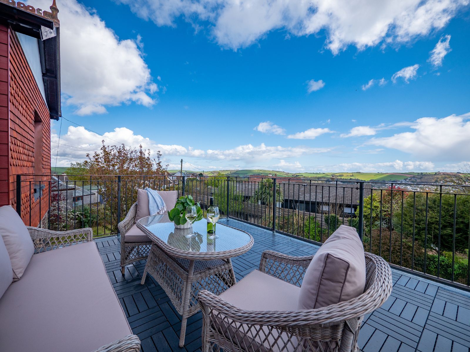 Step inside to an impressive, recently converted tower and staircase that once housed the area’s emergency water supply. Once inside, you're welcomed by an inviting open-plan living space where clean lines, warm textures and soft, natural tones create an immediate sense of ease. The lounge features a generous sofa, additional seating, Smart TV with Freeview, Bluetooth speaker and DAB radio, while large patio doors open out onto a private deck. With glimpses of the River Dart and an outdoor dining set, it’s an idyllic spot for morning coffee or relaxed evening drinks.