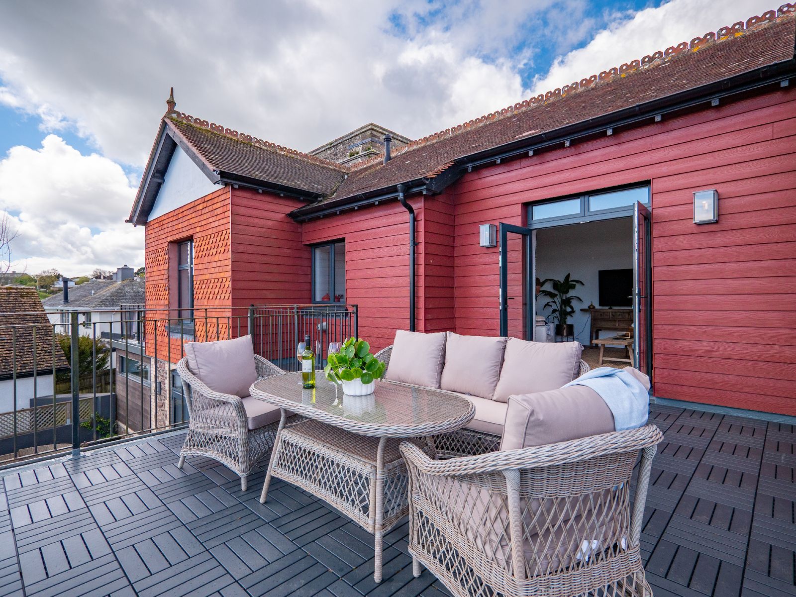 New Listing. Set within Dartmouth’s beautifully converted Tower House and sleeping four guests and parking, this light and calming apartment blends modern living with heritage charm. Bathed in natural light, it features river glimpses from expansive decking accessed from the open plan living area, stylish and thoughtfully created spaces and two relaxing and inviting bedrooms, one with a private balcony, creating an ideal escape for couples or friends looking to unwind in the heart of Dartmouth.